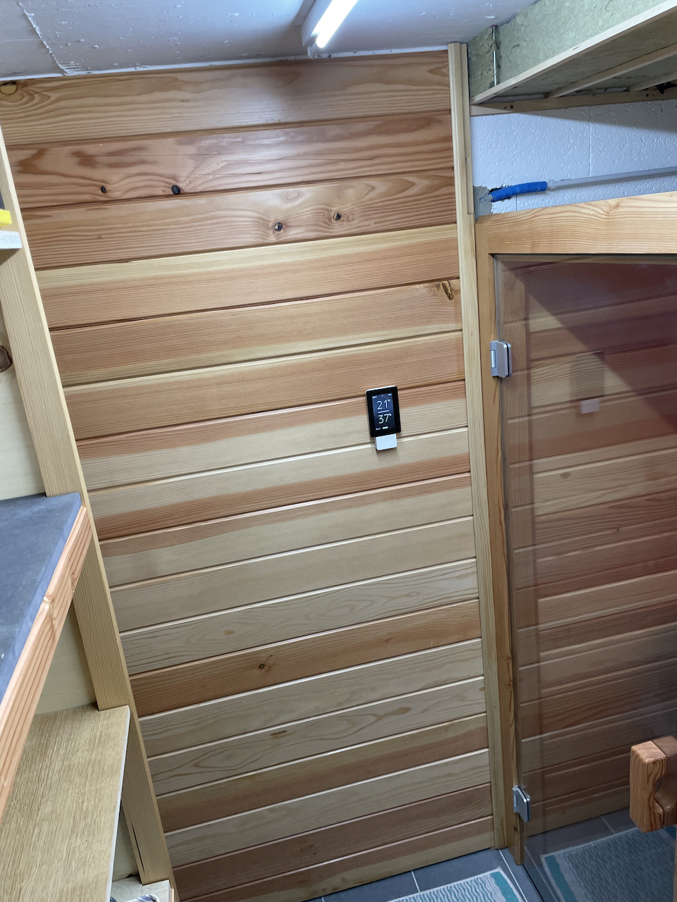 Le 23 avril 2022, après environ un mois de covid, dur dur la reprise. Habillage des murs à l'entrée du sauna. Reste la partie supérieure entre le sauna et le plafond !