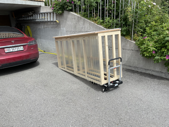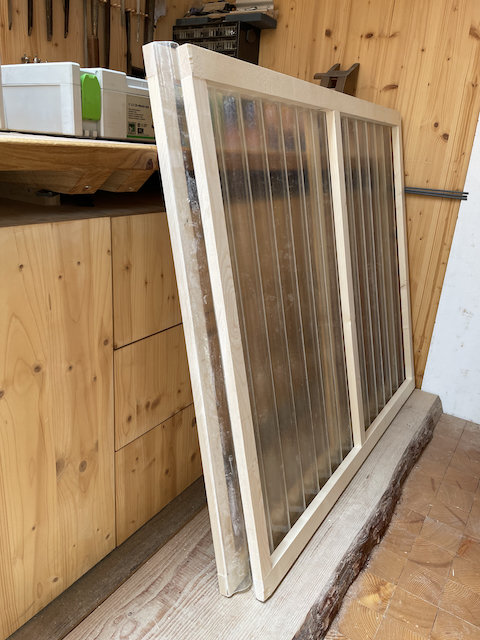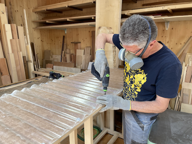 Le 4 juillet, découpe, ponçage et fixation des plaques ondulées (verre-époxy).