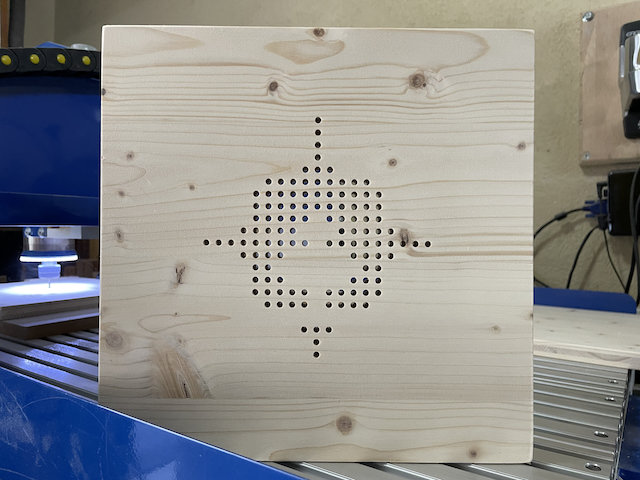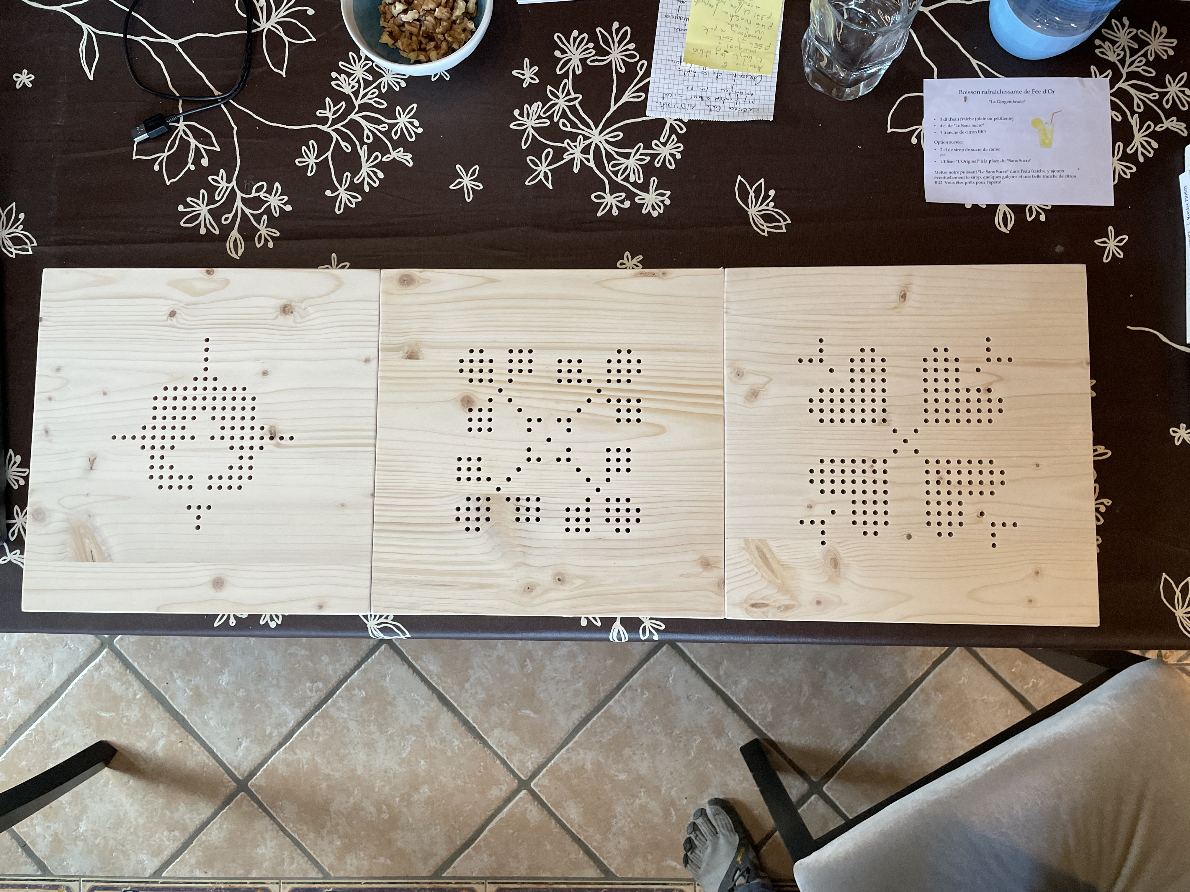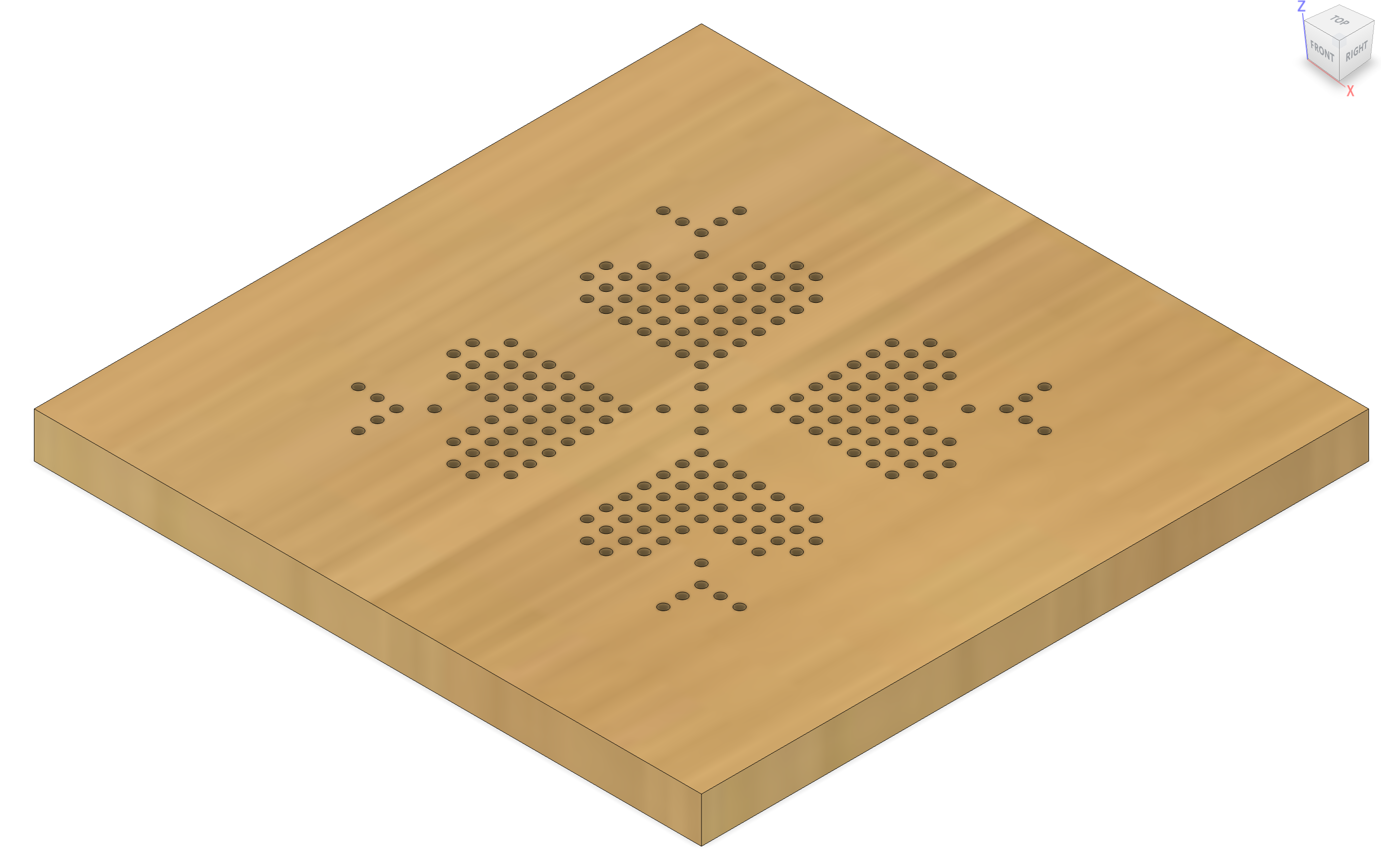 Le 3 août 2023. Un problème simple qui nécessite une machine pour un résultat correct sur bois. Des motifs de trous de 4mm de diamètre à percer dans le bois. Reproduction de l'un des trois motifs avec Fusion 360.