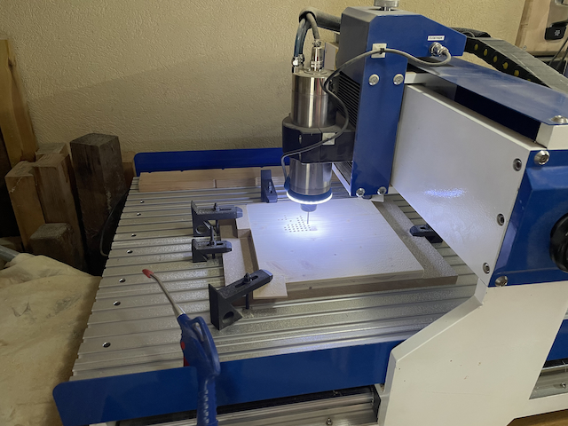 Préparation des trois planchettes. Du bois trois plis de 19mm d'épaisseur devrait suffire pour un bon guidage de la mêche qui percera le panneau.
