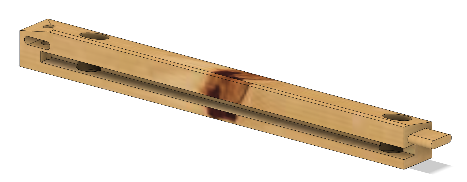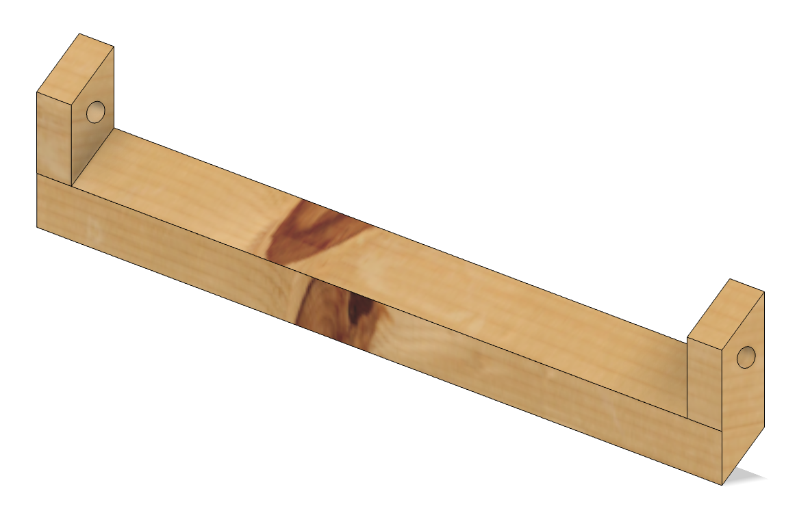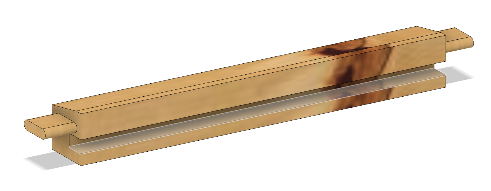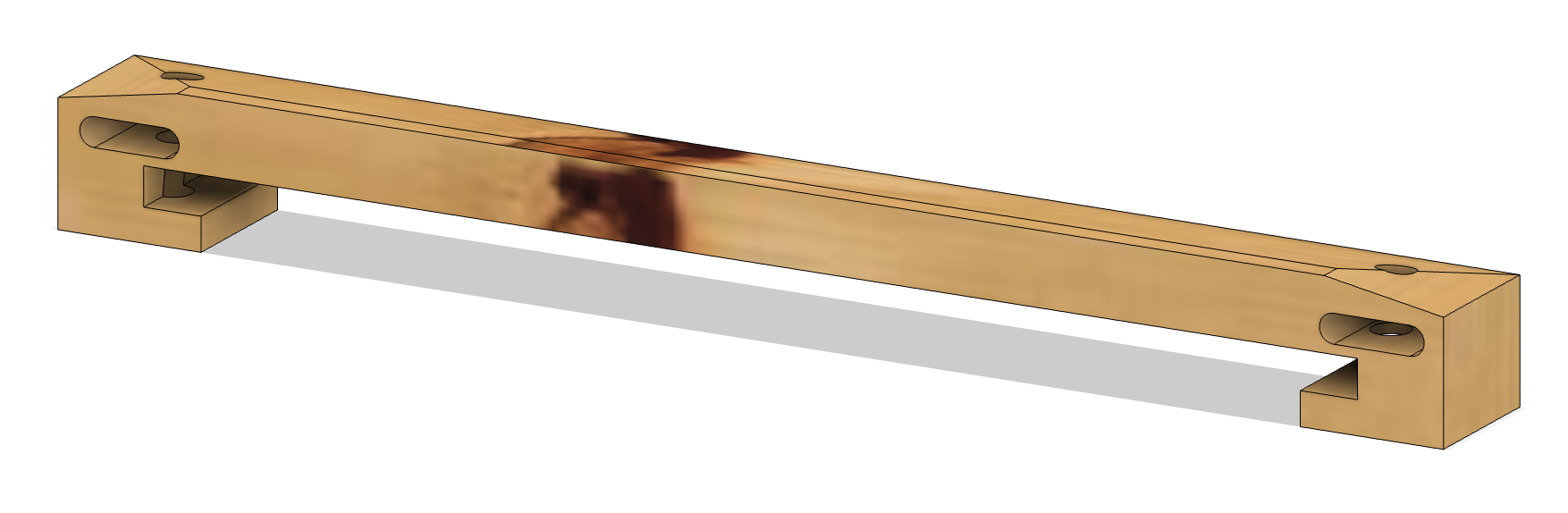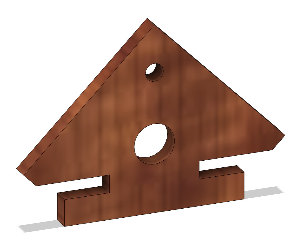 À chaque extrémité viendra se loger un élément que j'ai nommé lucarne. Le petit trou supérieur recevra une pige de 8mm pour la liaison avec la poutre faîtière.
