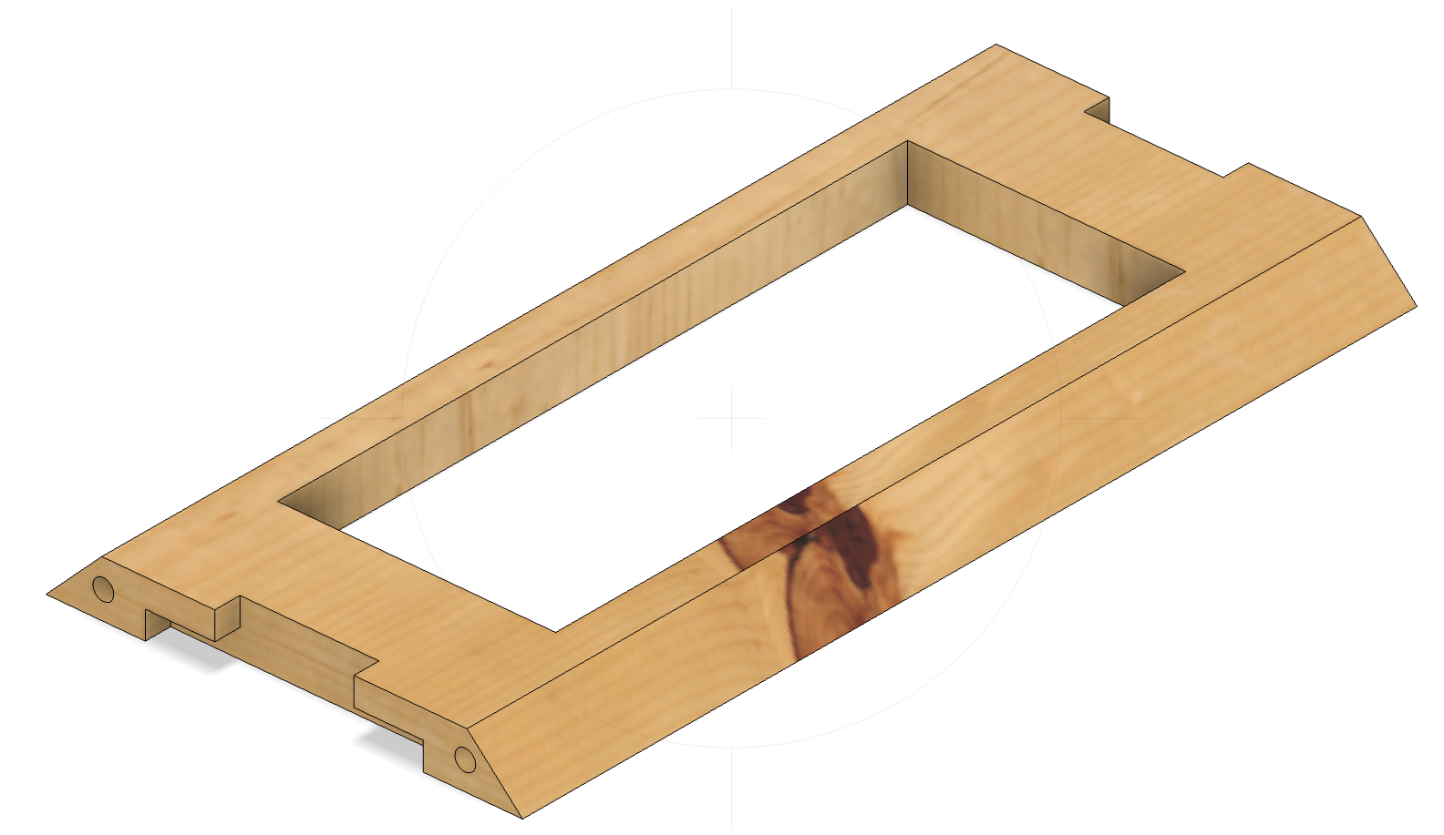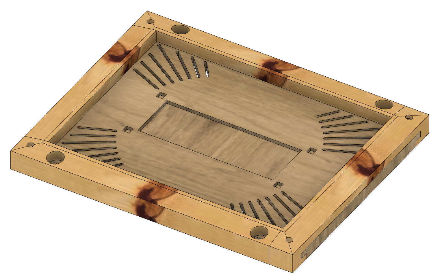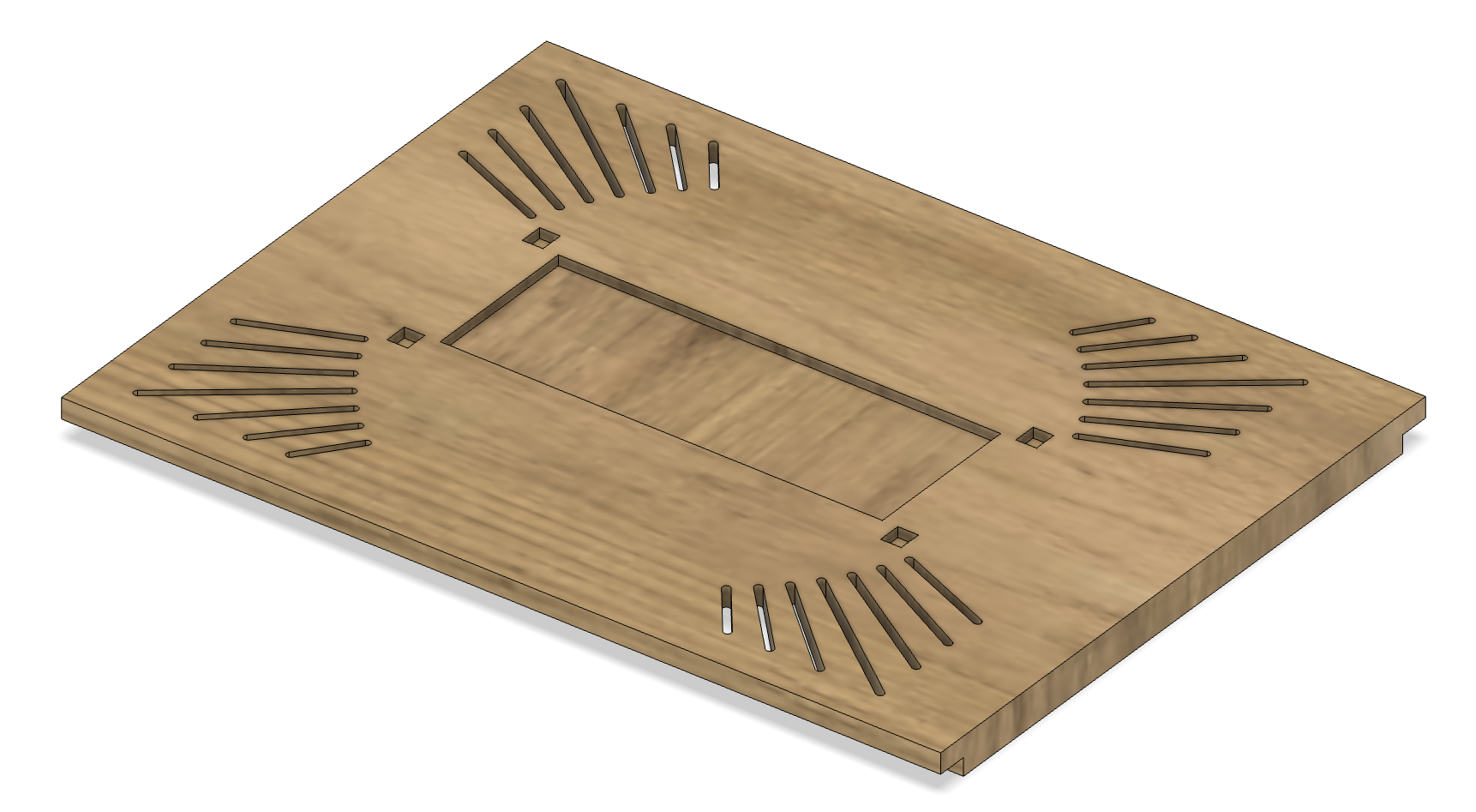 Le plancher assemblé. Les 4 logements pour les poteaux sont de diamètre 20mm et les petits trous de diamètre 8mm pour les piges d'angles, dont les deux à l'avant bloquent le plancher.