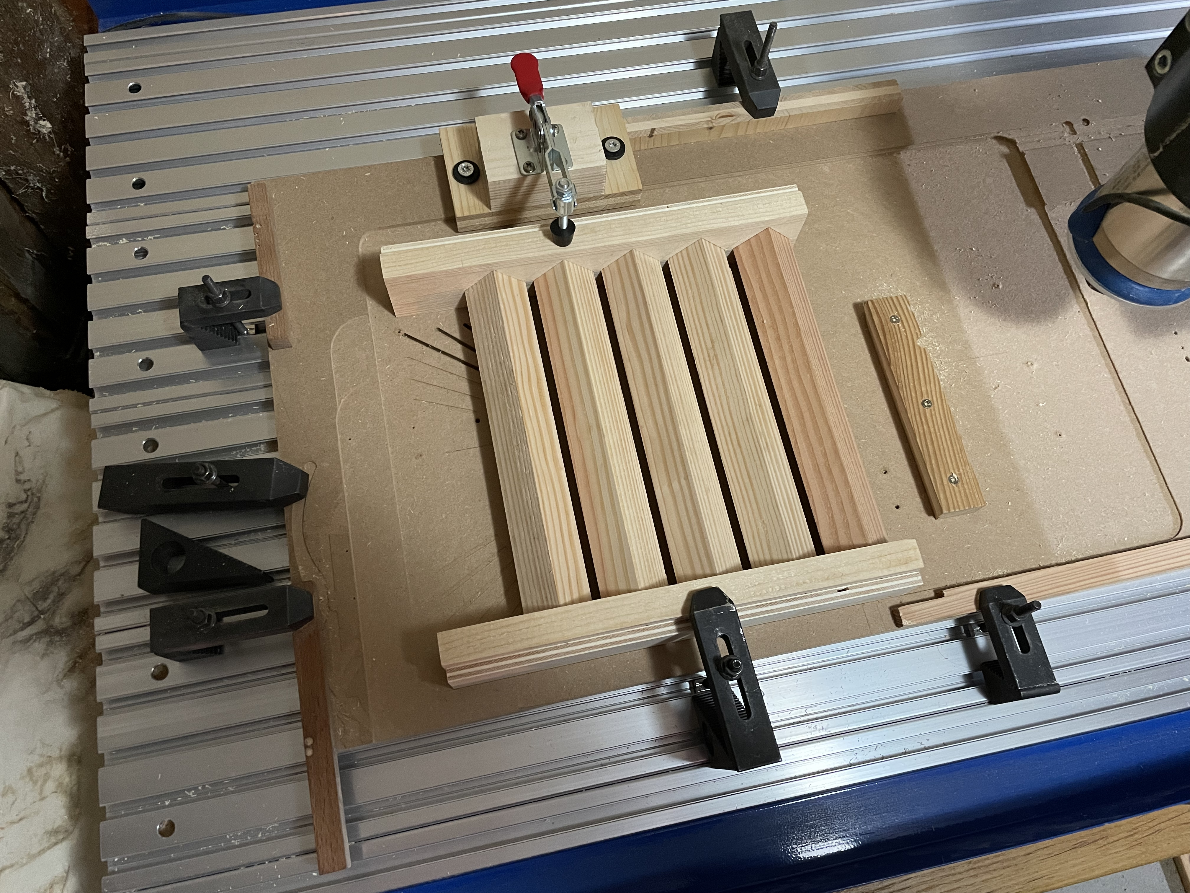 Fabrication d'un nouveau gabarit avec inserts en alu pour guider la mèche. Perçage des pièces d'attache des colonnettes aux toits.
