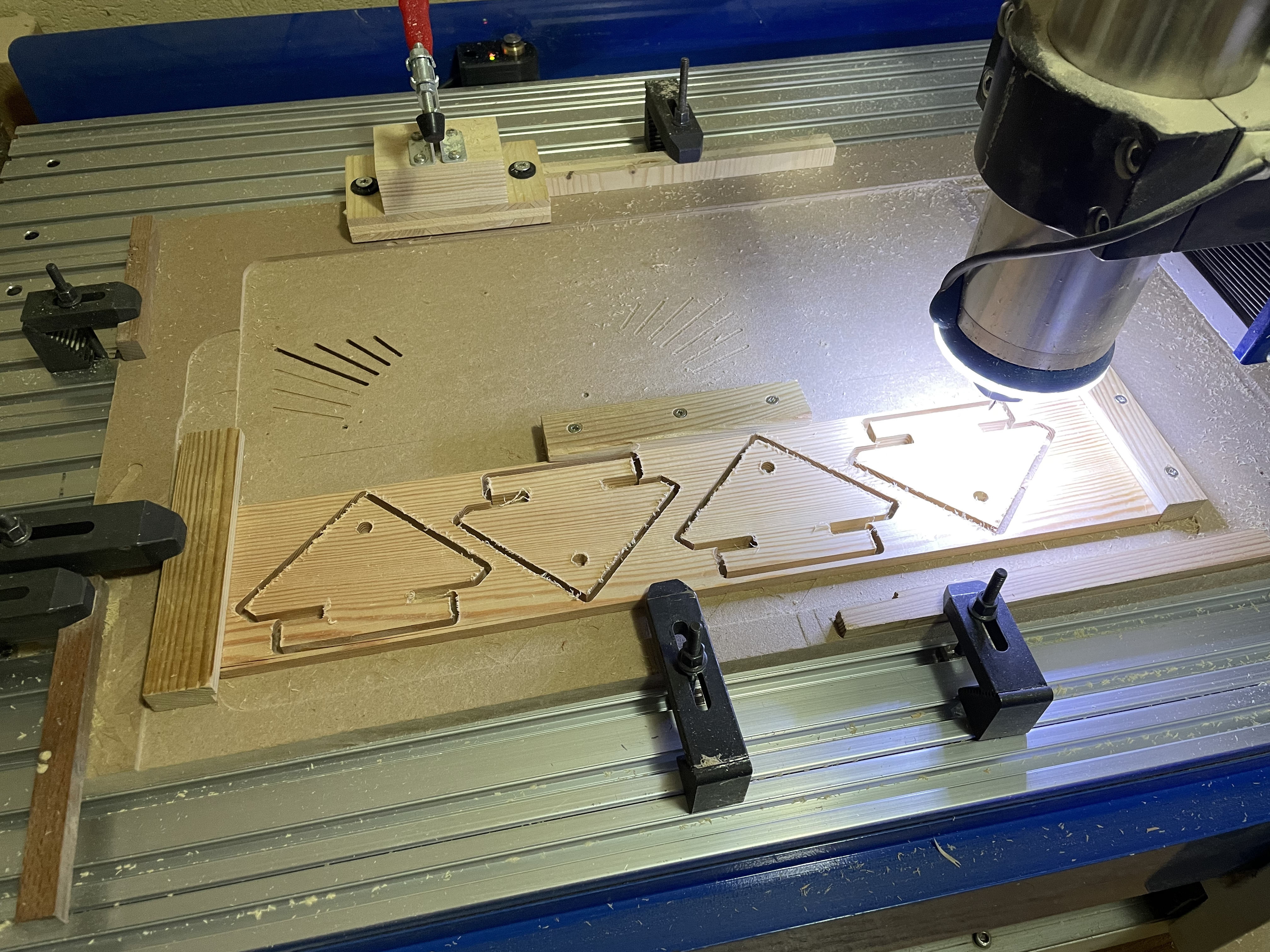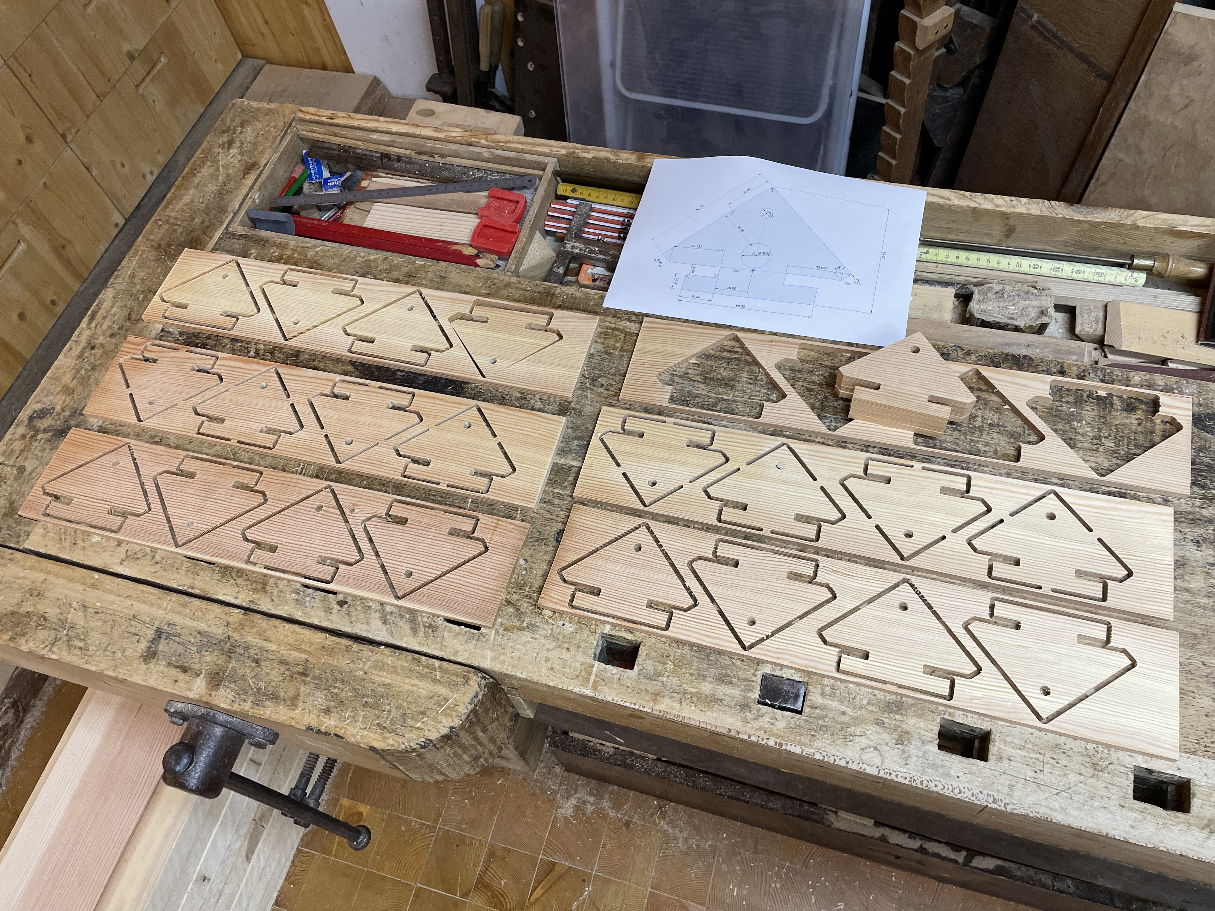 Le 3 novembre 2023. Dessins et fabrication des "lucarnes" (pignons des petites maisons). Une vue lors du test des procédures pour localiser les points d'ancrage. Le découpage du bois a fournit 3 planchettes de 1450mm x 98mm x 8.5mm. Avec une alternance tête bêche, 12 lucarnes ont trouvés place. Après découpe en 3 des planches, le fraisage produira 4 pièces à la fois.