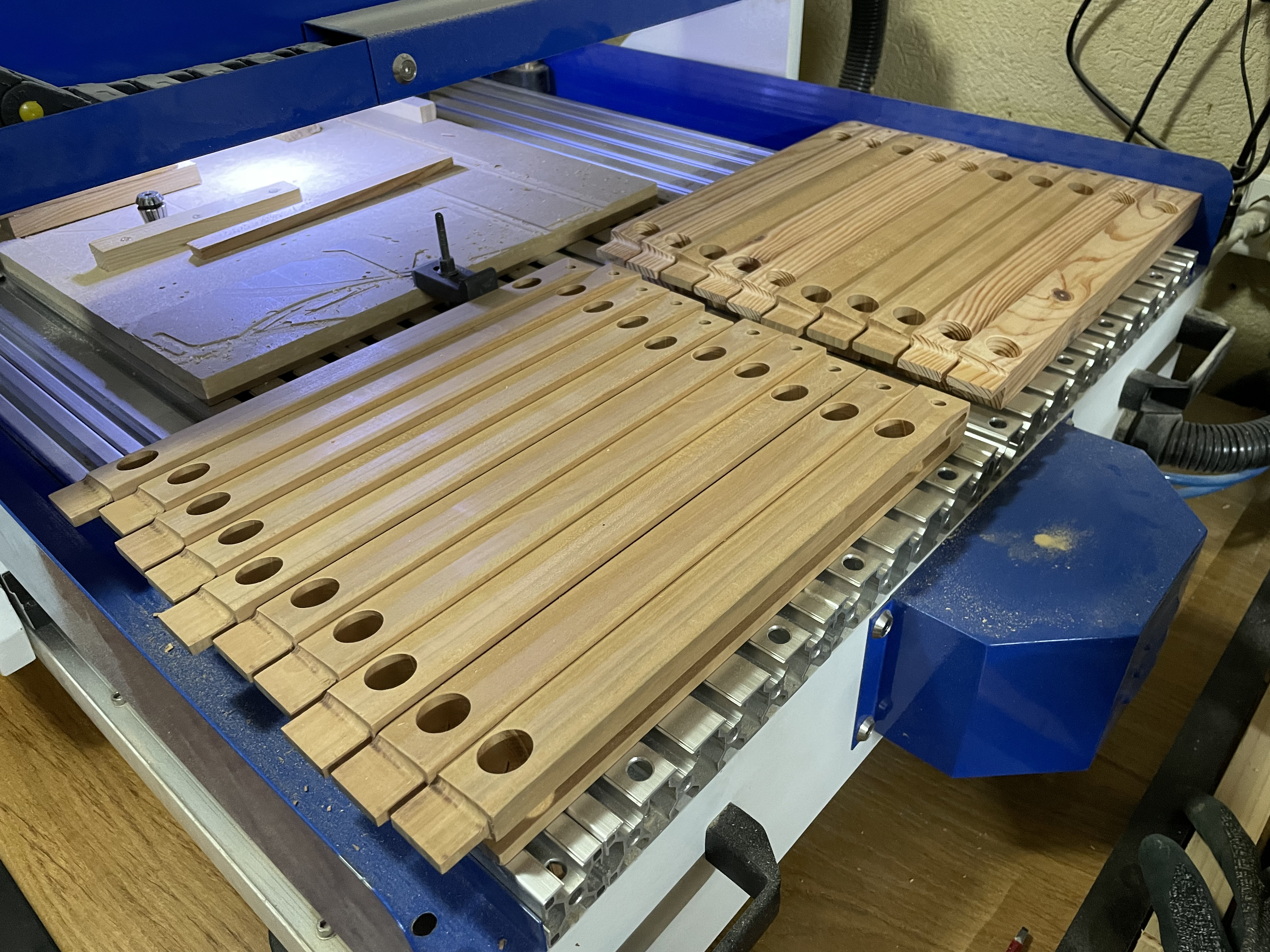 Le 18 novembre 2023. Toutes les pièces des planchers sont fraisées. Reste les ajustements, la finition des tenons avant de faire les perçages. Une modification des traverses avants, qui ne laisse plus le passage du plancher. Pour le sortir, il suffira d'enlever cette traverse.