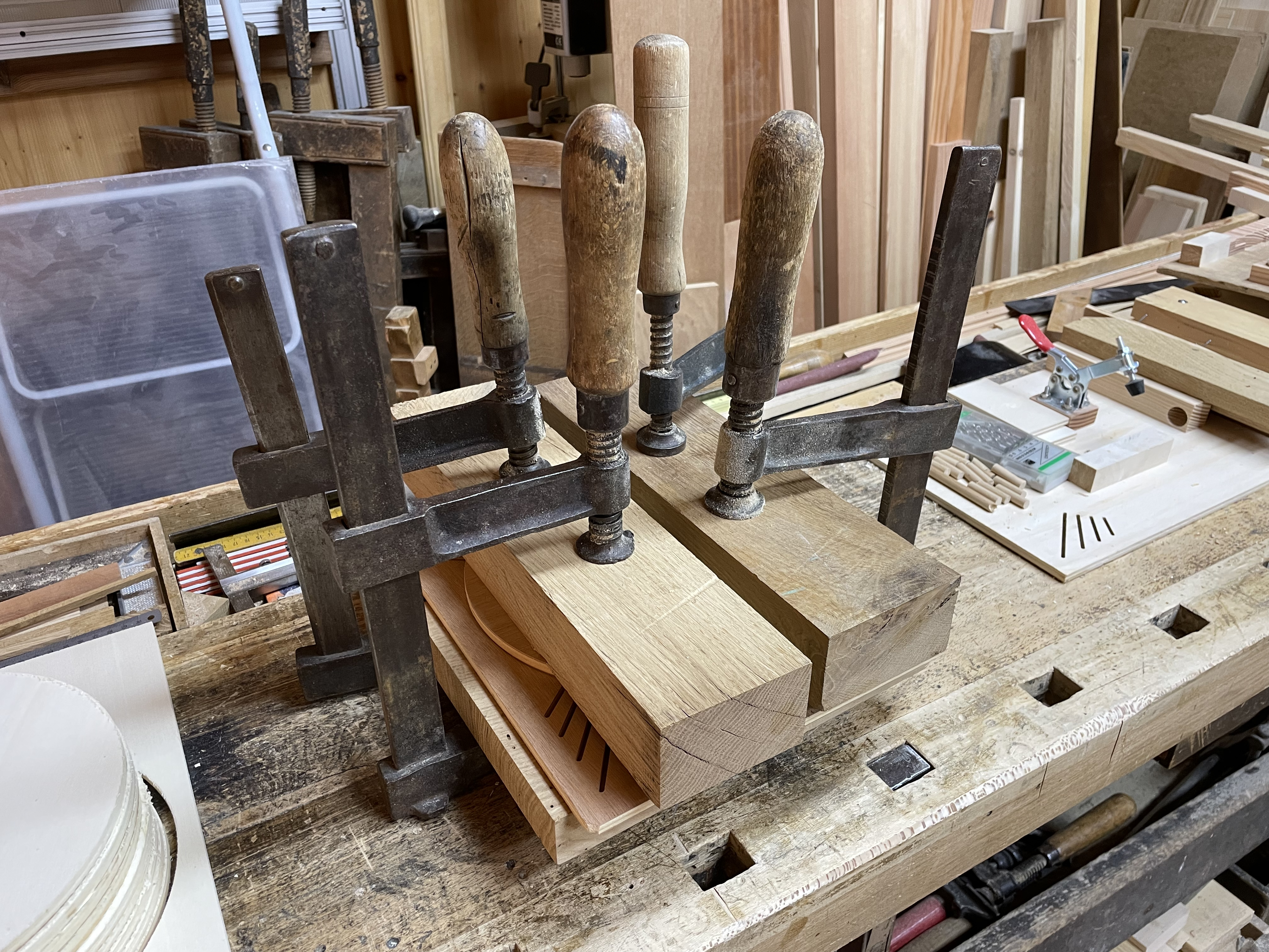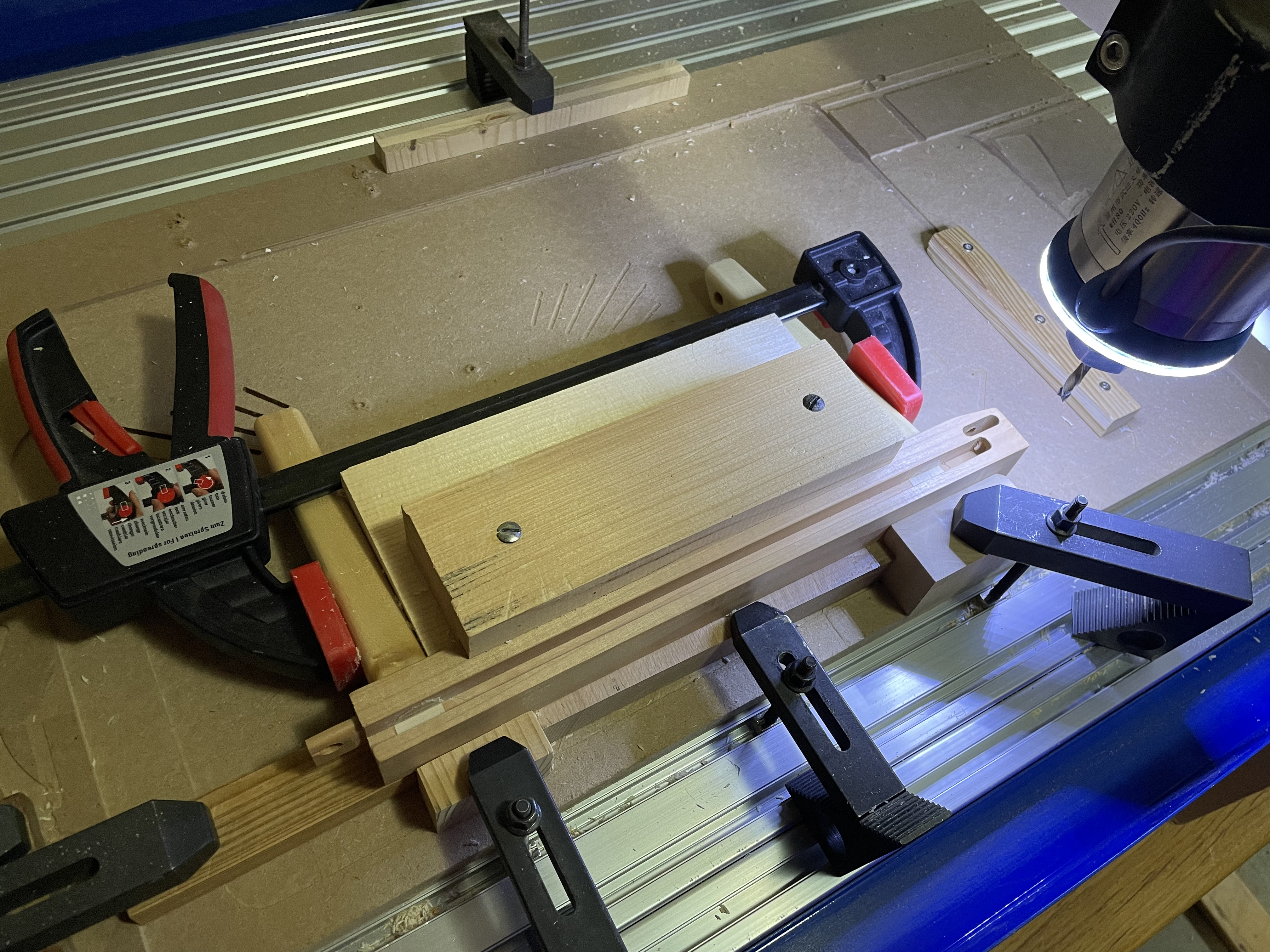 Le 23 novembre 2023. Les tenons sont percés pour les piges. Préparation d'un gabarit pour fraiser l'encoche du plancher dans les colonnettes.