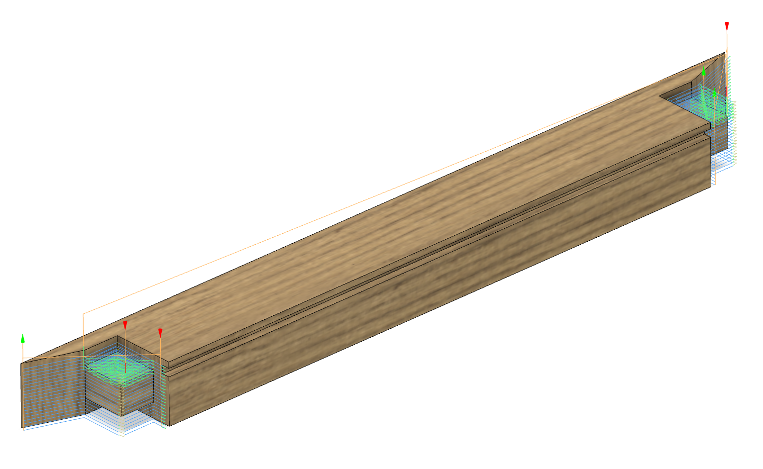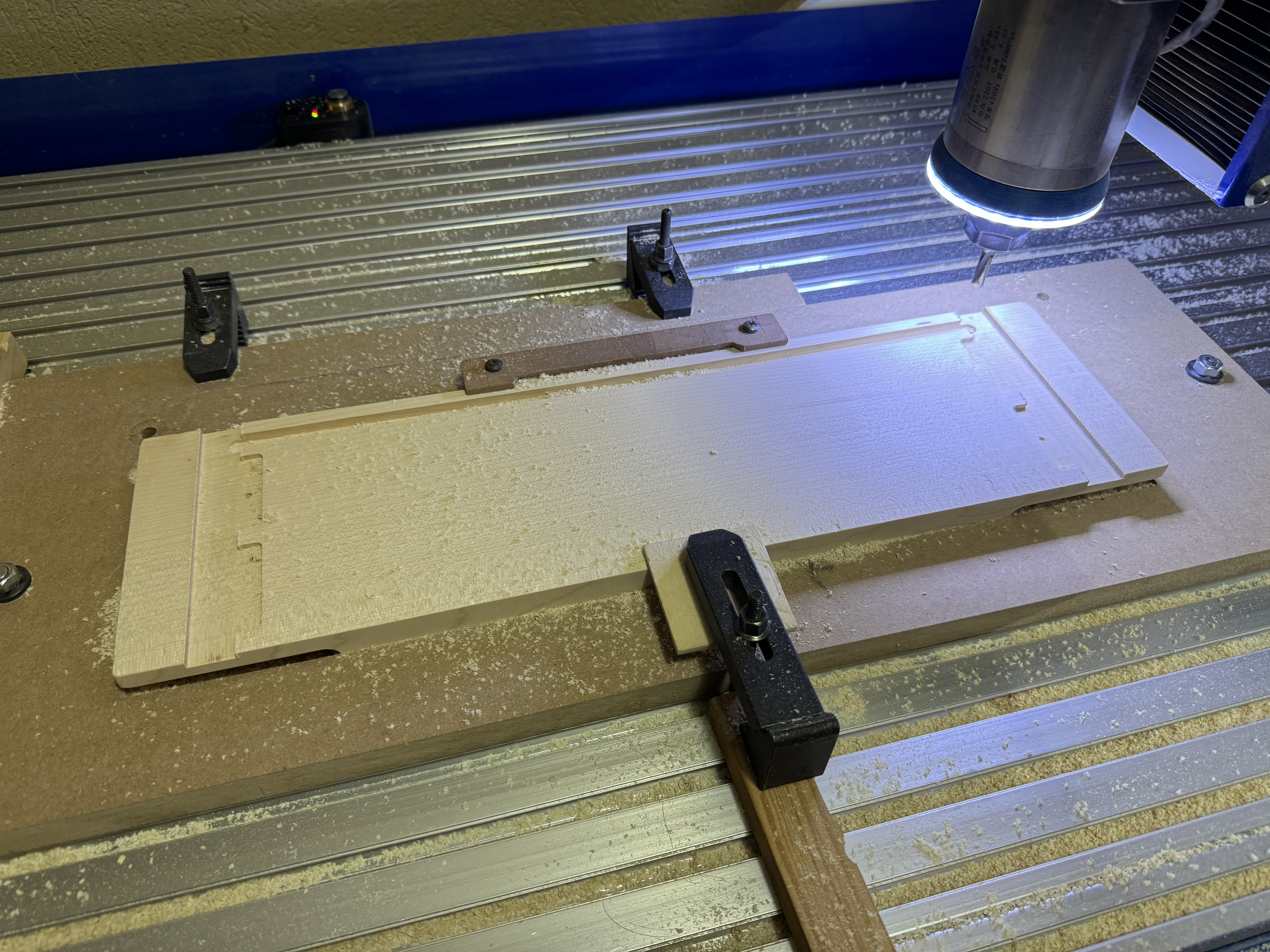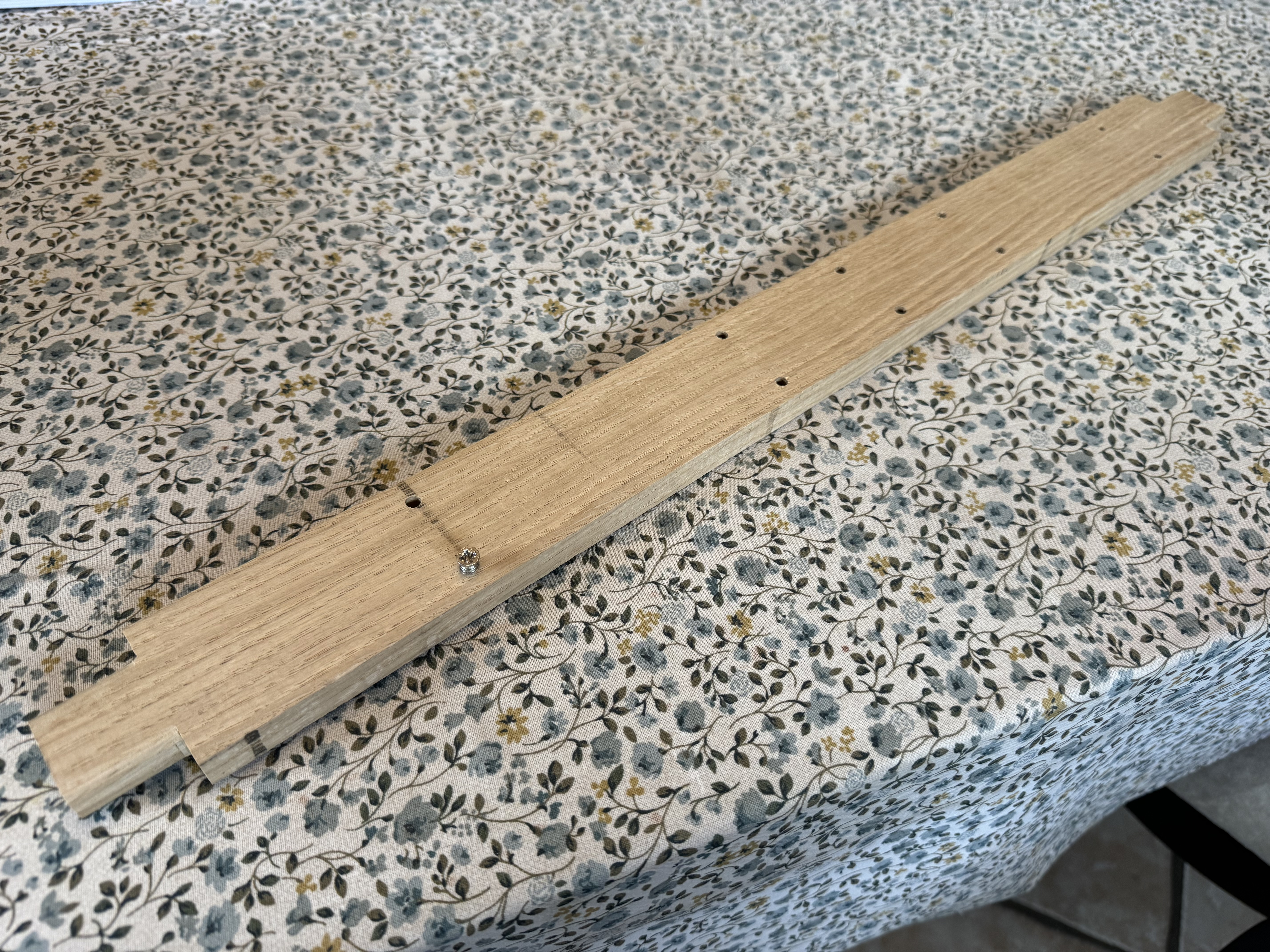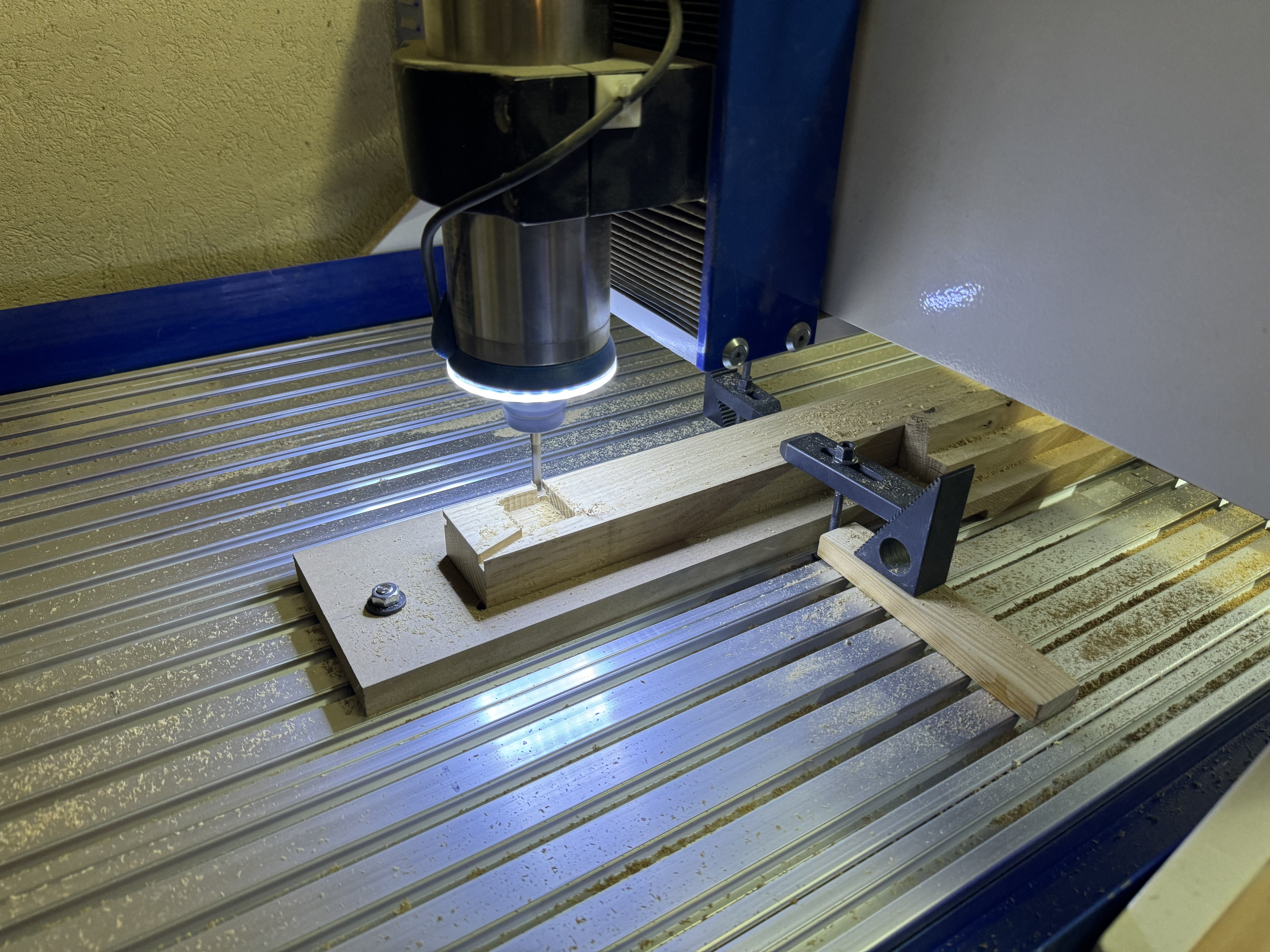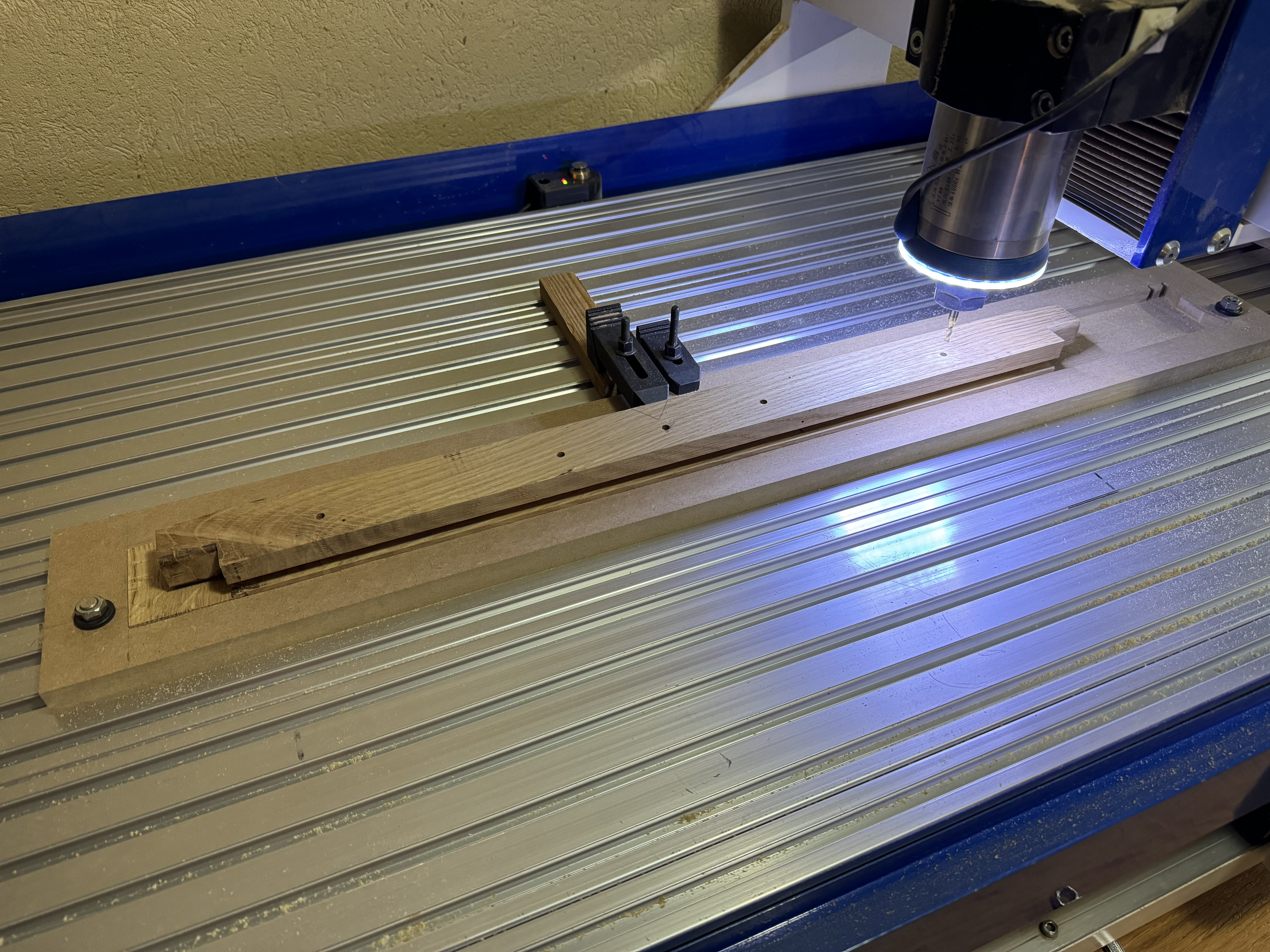 Fraisage d'une première pièce avec découpe à une extrémité. C'est là que je comprends une erreur de conception ! bien que le bois soit du chêne, une tranche fine est rarement parfaite en fin de fraisage. Il aurait fallu prévoir une épaisseur d'au moins 1 ou 2 mm sur la tranche.