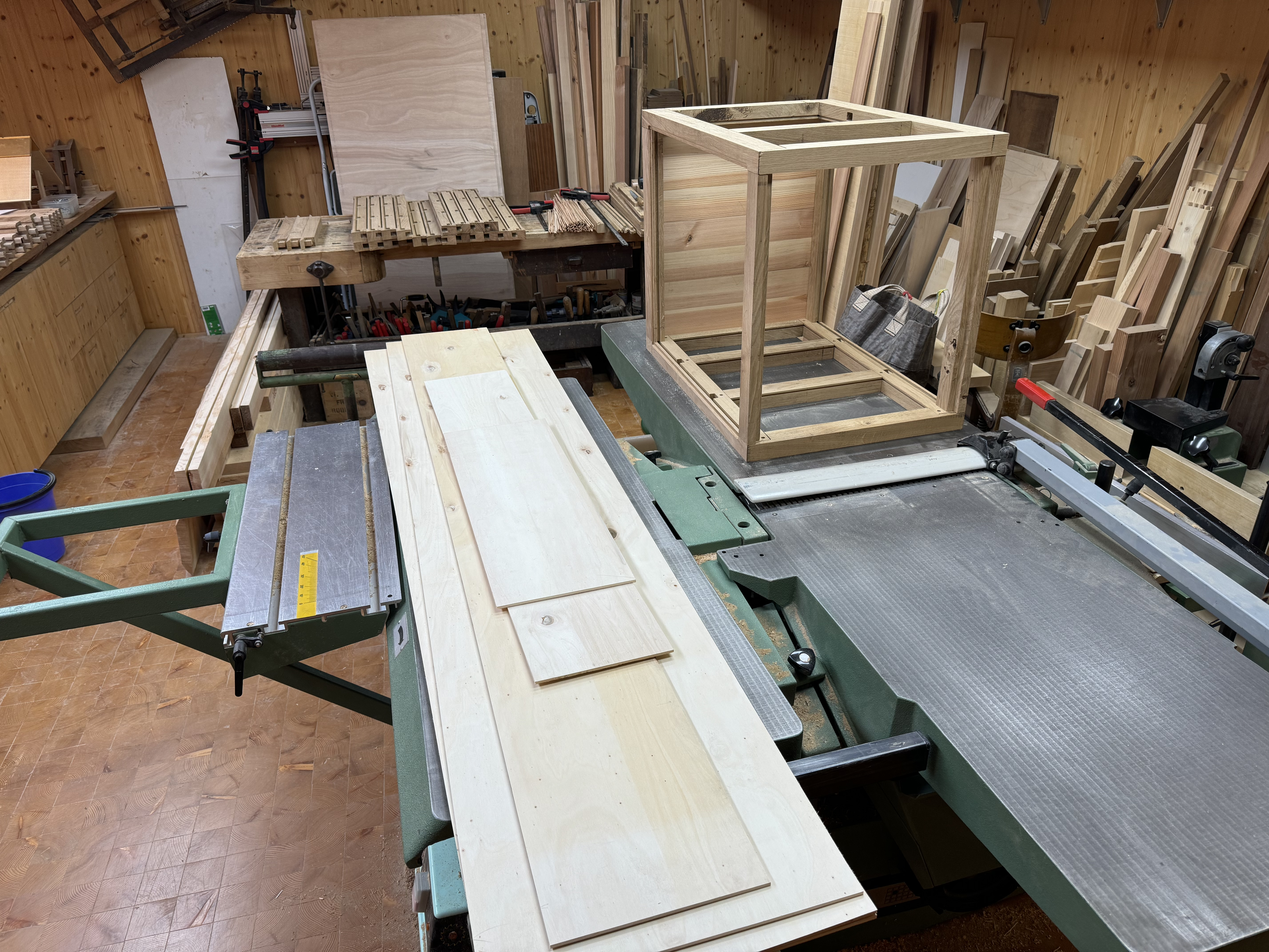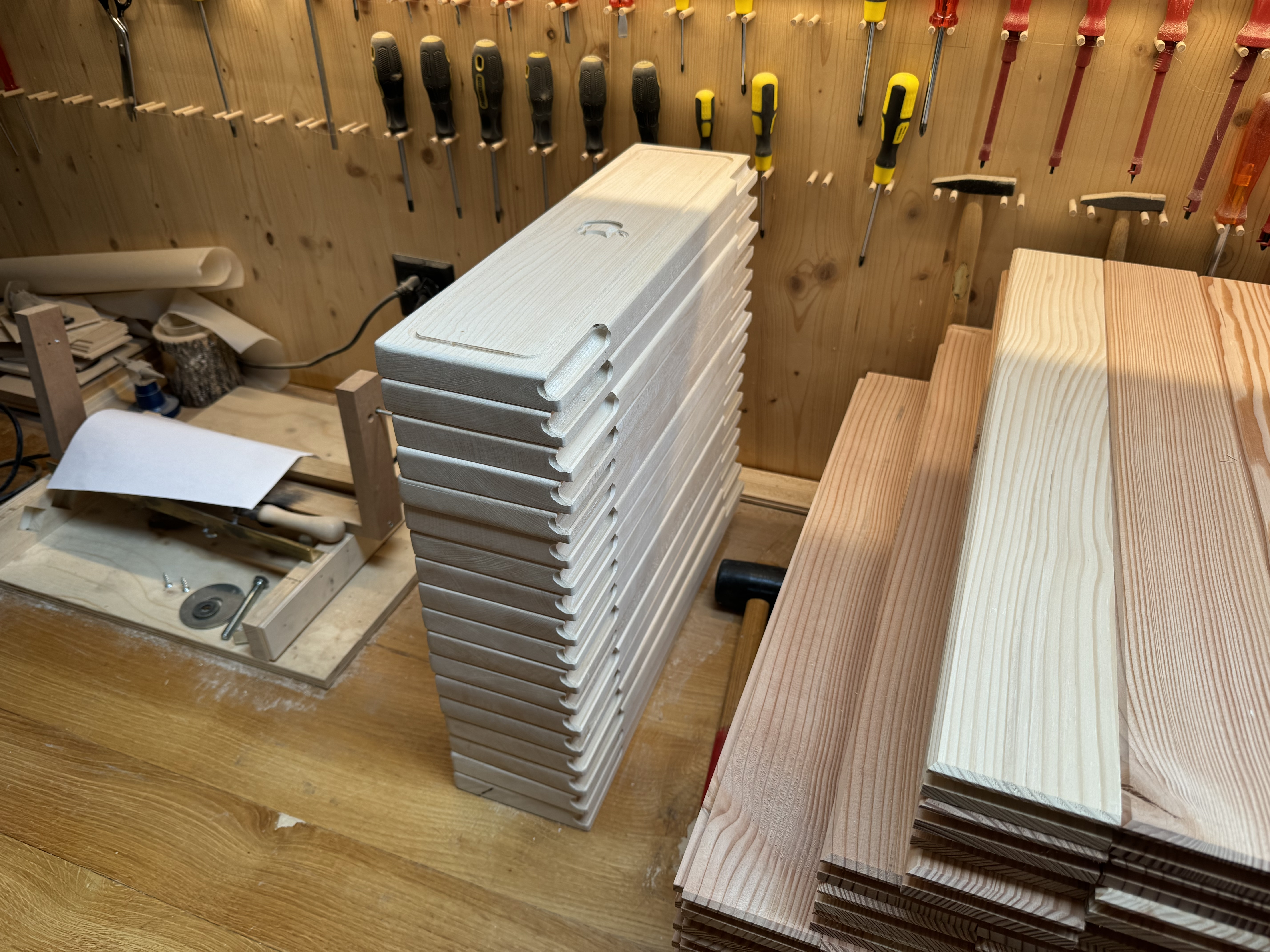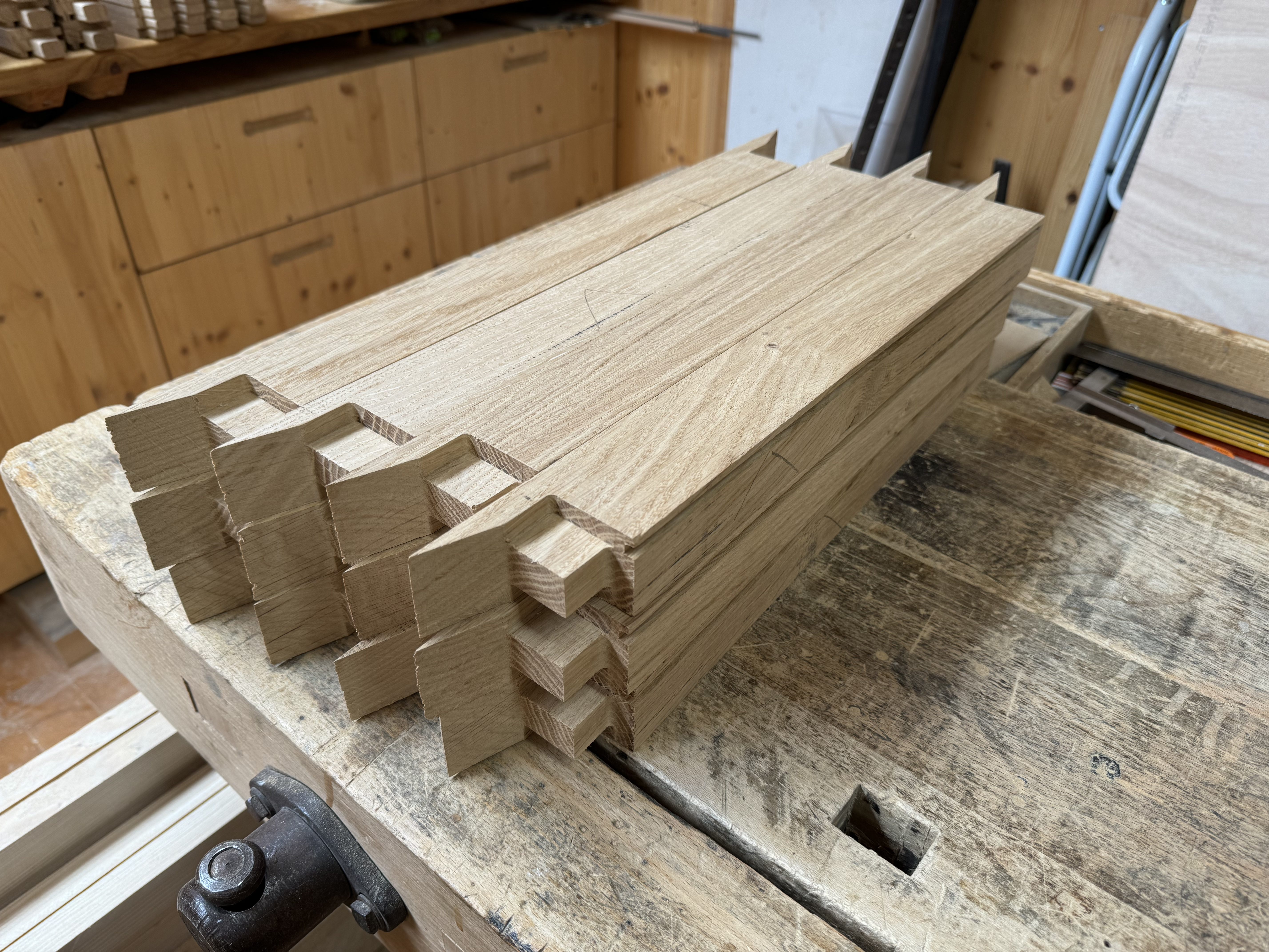 Le 26 juin 2024, toutes les faces avant de 134 mm sont terminées. Visible ici, la rainure pour le fond du tiroir, et les insertions des côtés avec leurs équerres.