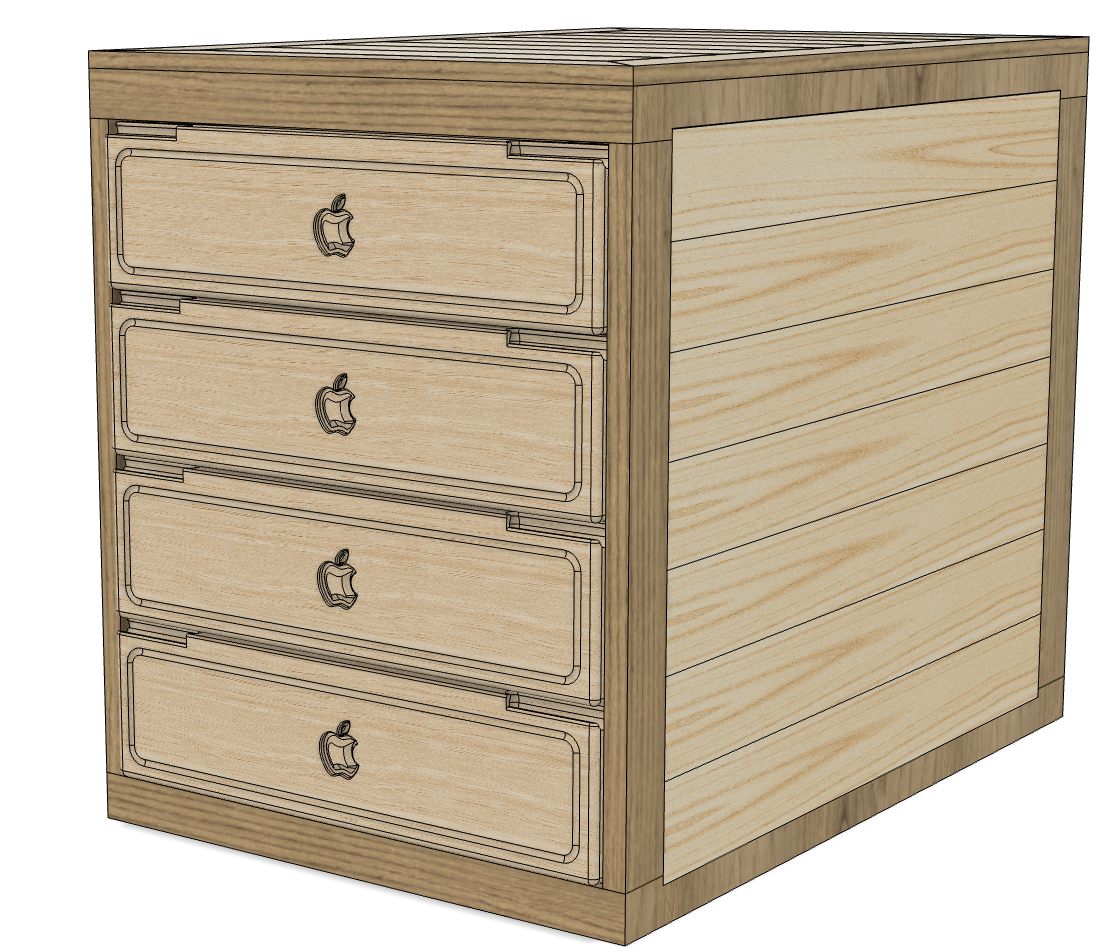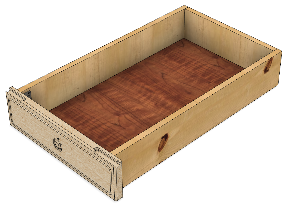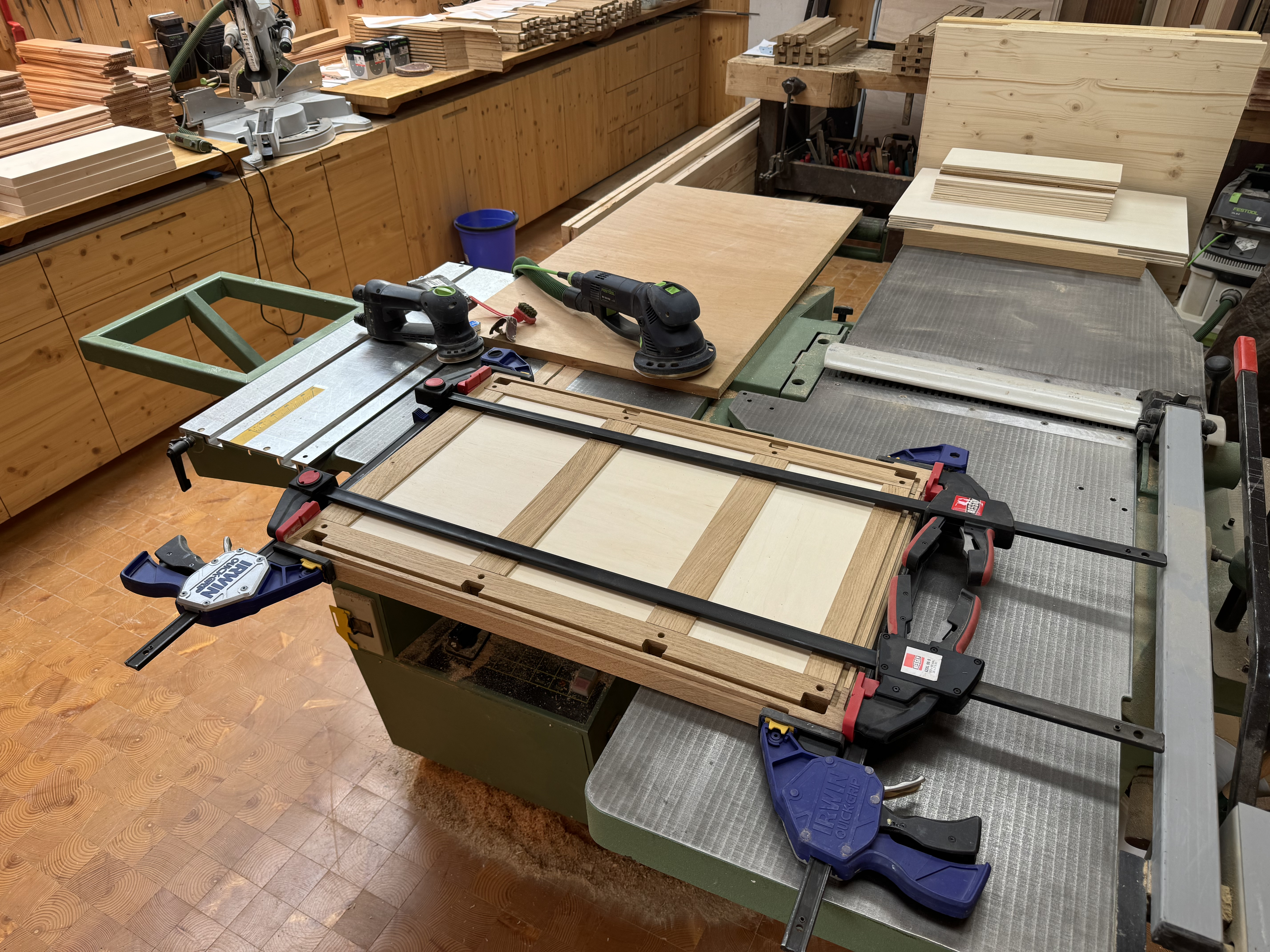 Le 26 juin 2024, toutes les faces avant de 134 mm sont terminées. Visible ici, la rainure pour le fond du tiroir, et les insertions des côtés avec leurs équerres.