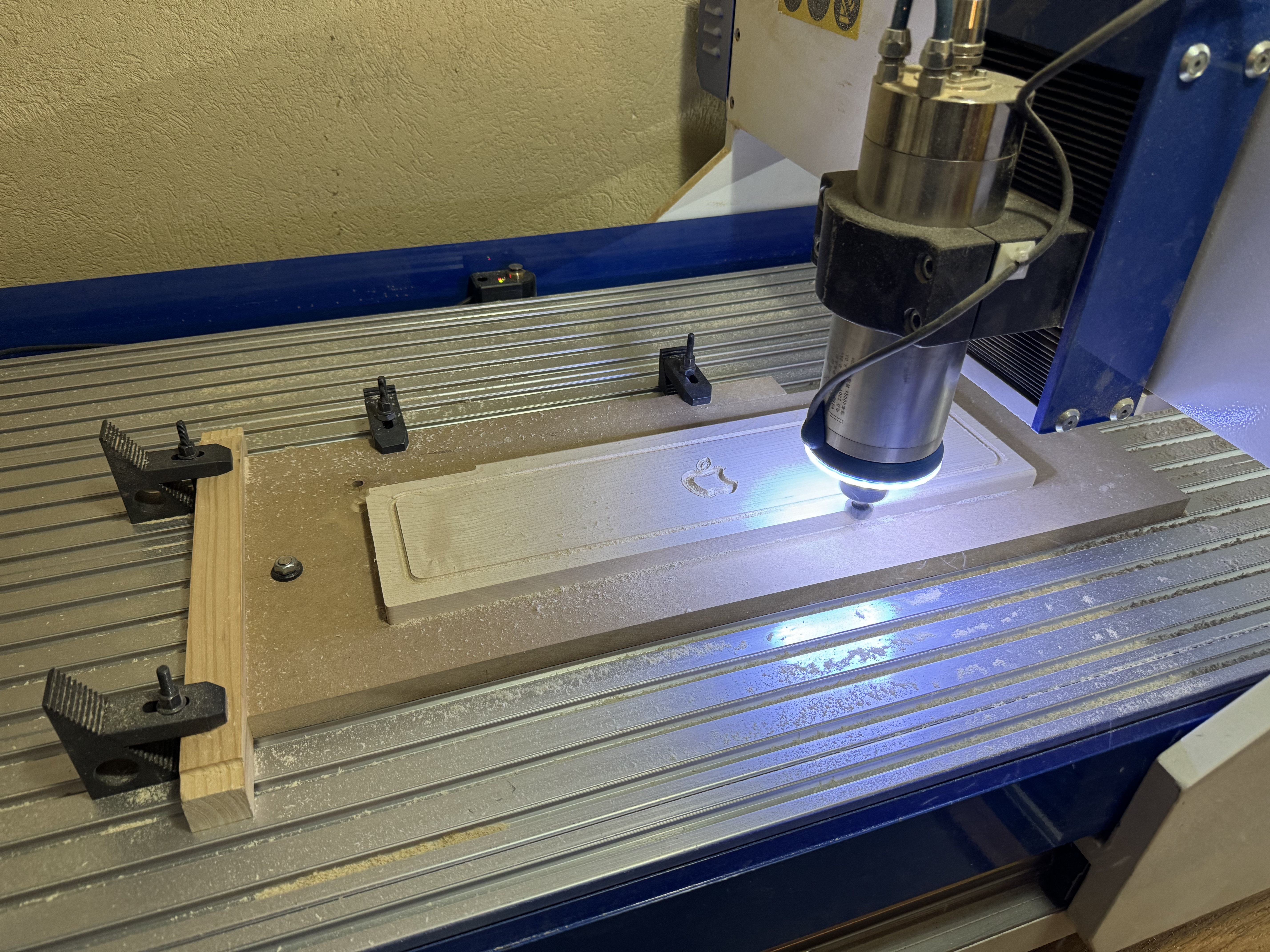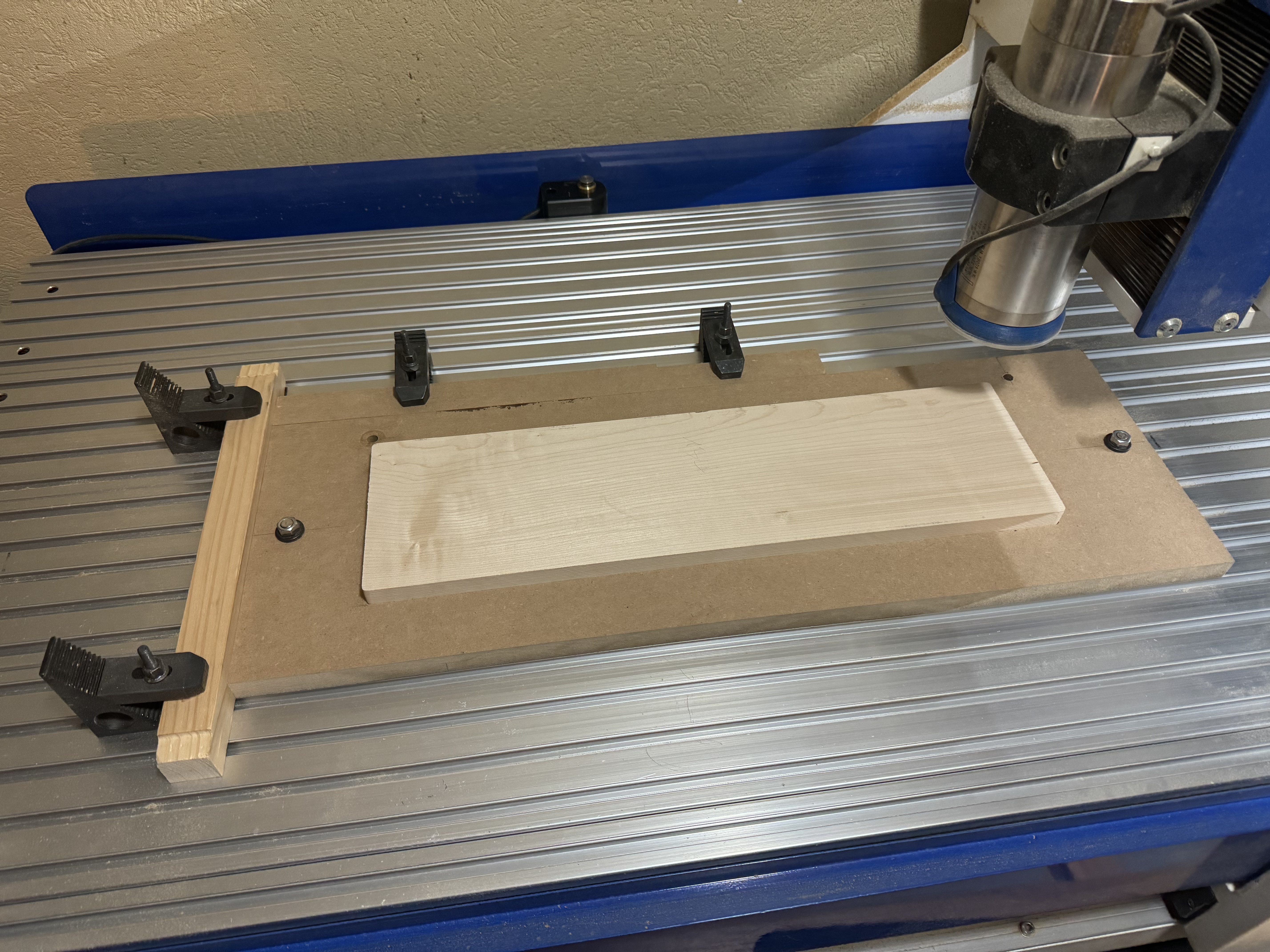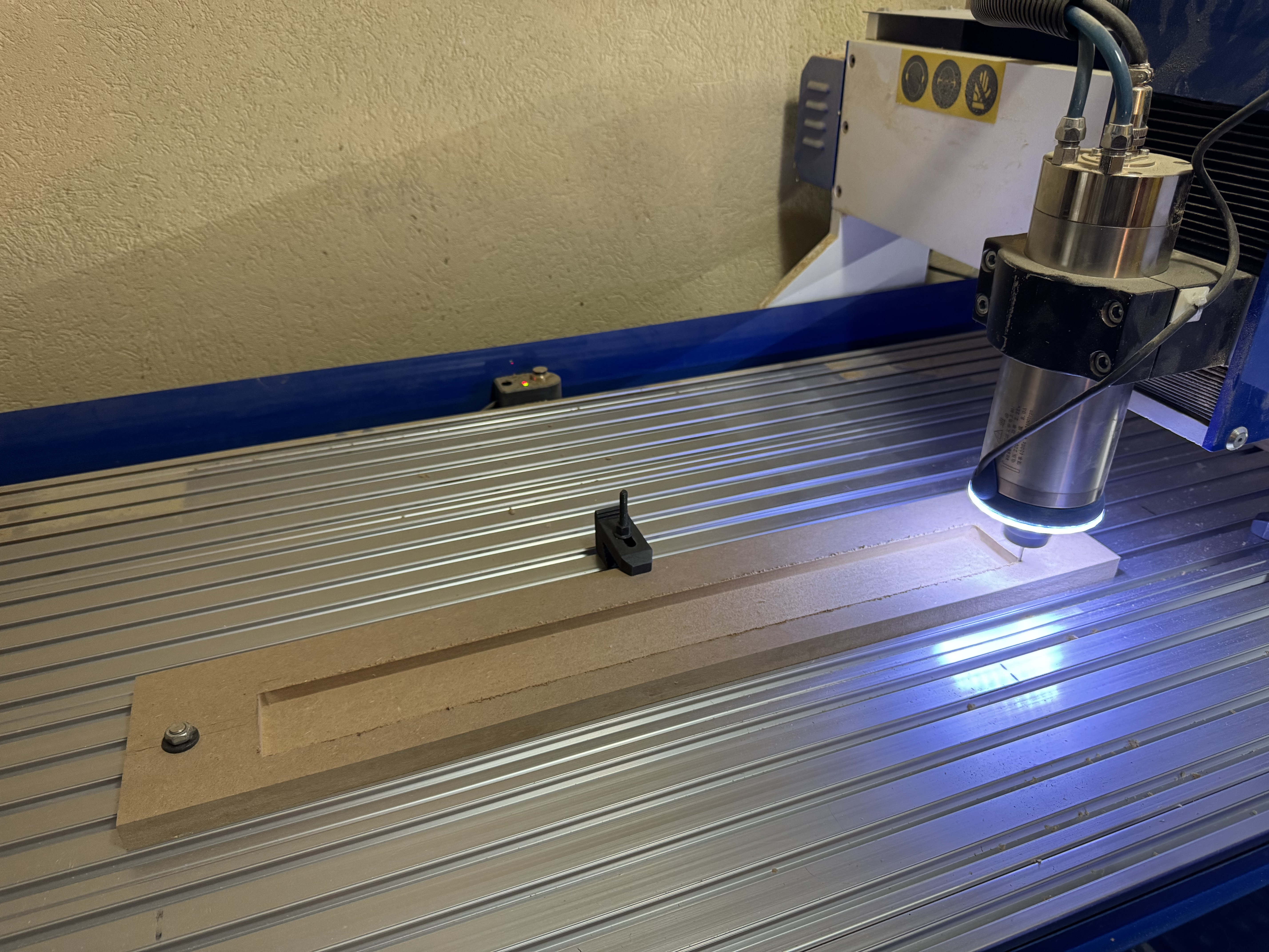 Le 28 juin 2024, fraisages des faces de 202 mm dans une nouvelle empreinte en MDF. Maintient de la pièce par dessous avec 4 vis à l'emplacement des équerres.