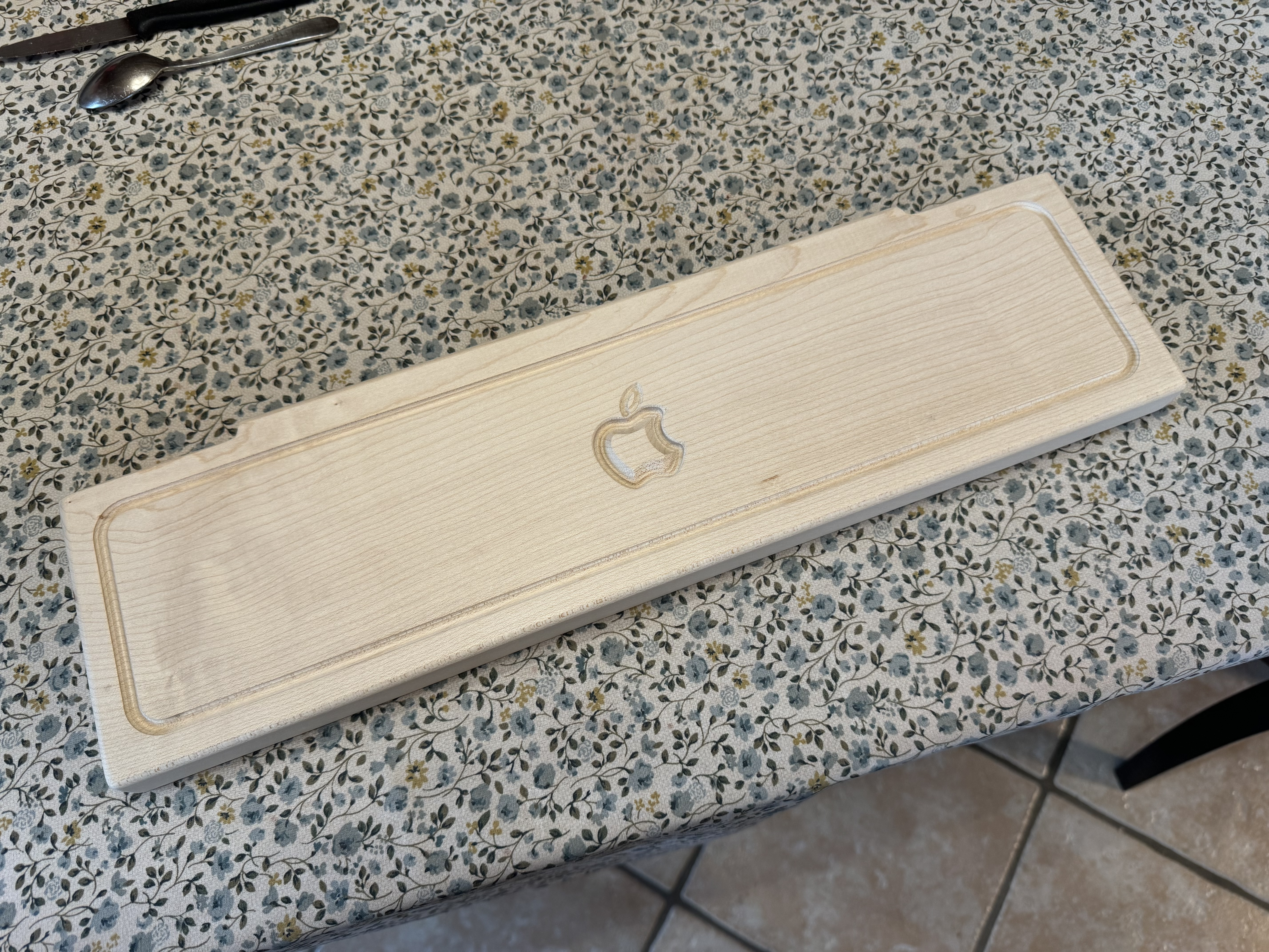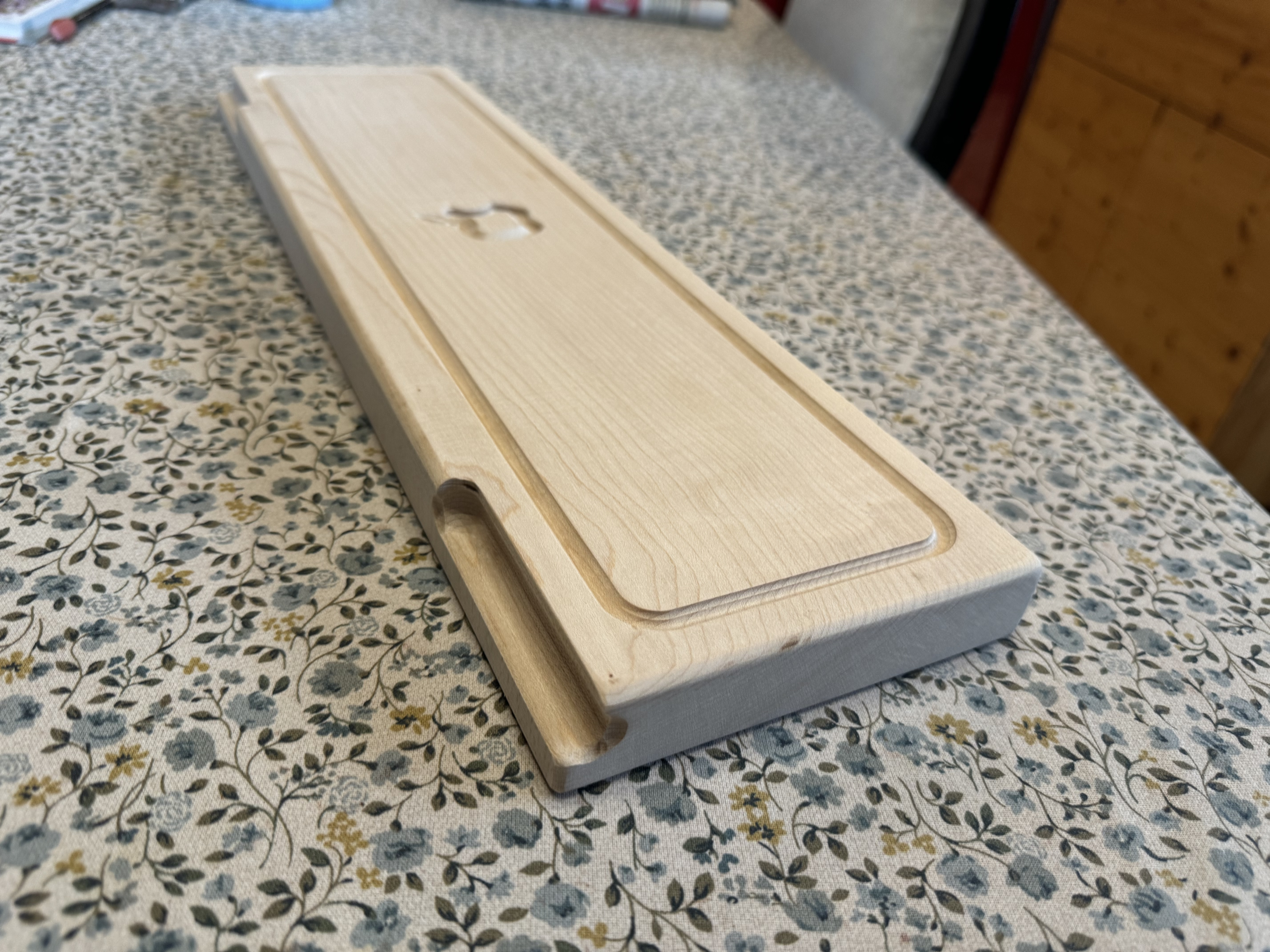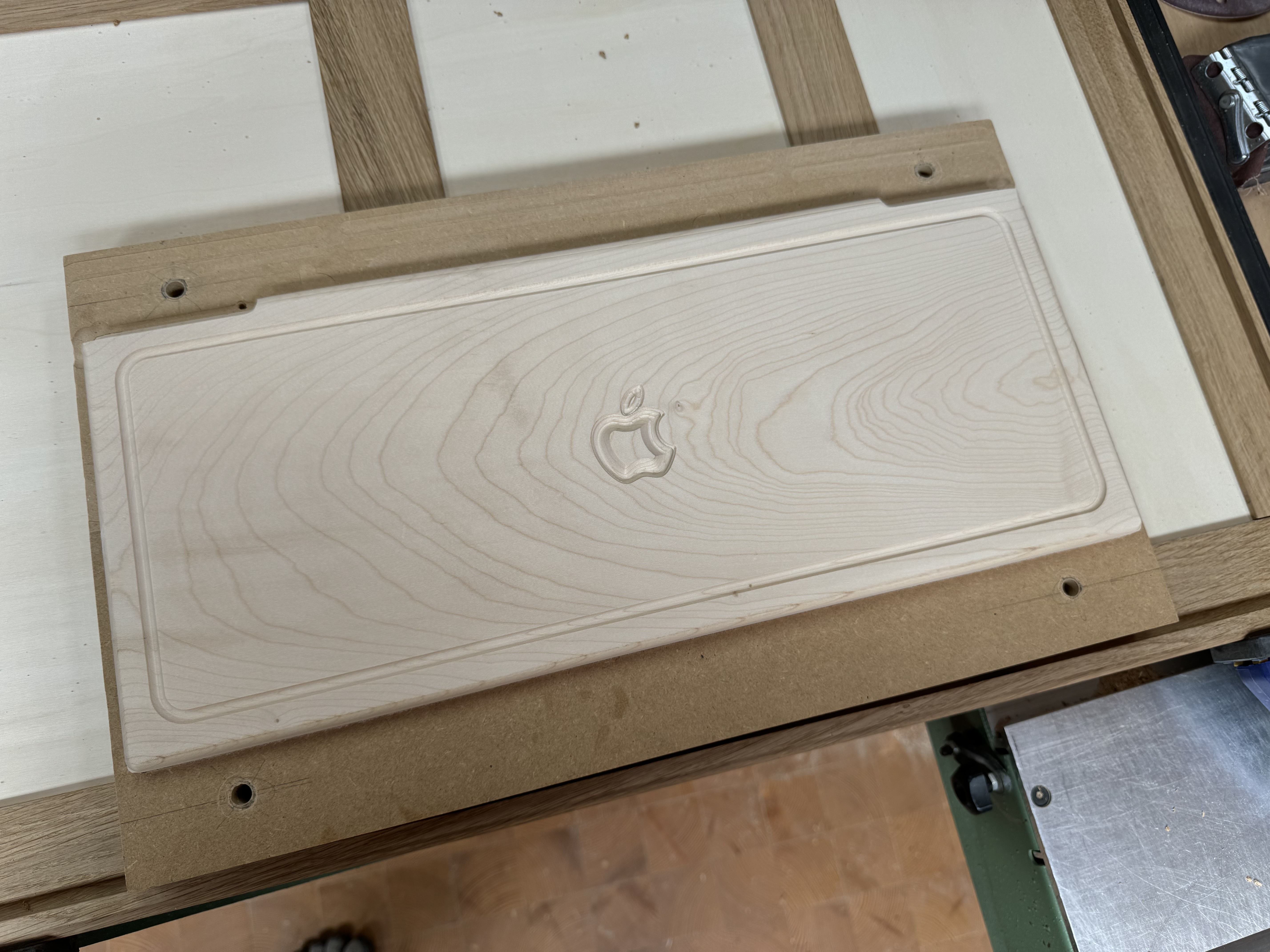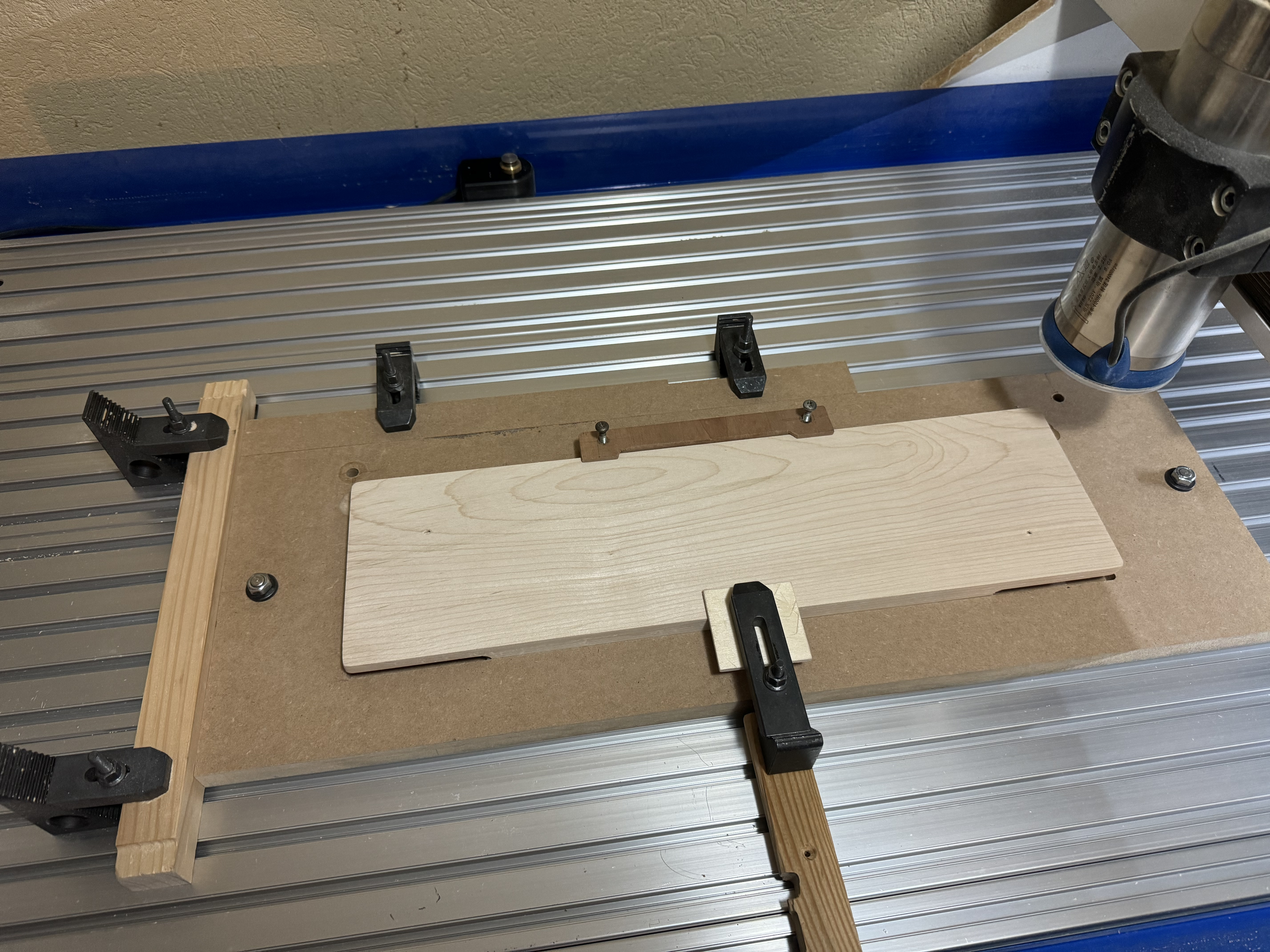 Le 28 juin 2024, fraisages des faces de 202 mm dans une nouvelle empreinte en MDF. Maintient de la pièce par dessous avec 4 vis à l'emplacement des équerres.
