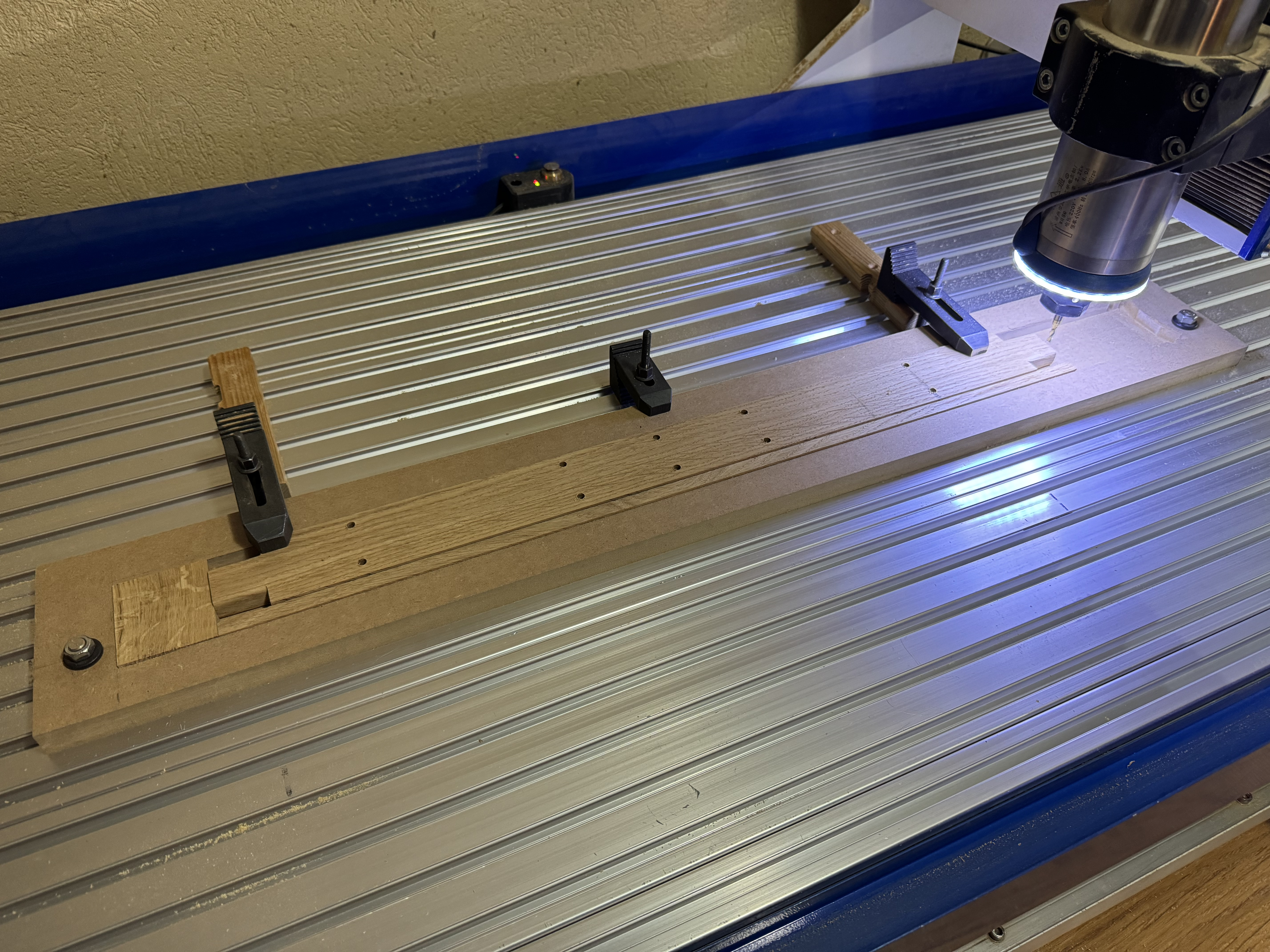Le 3 juin 2024, dernières opérations de fraisages pour les trous des vis de fixation des coulisses de tiroirs. L'empreinte précédente reste utilisable avec quelques cales. En premier, les montants avant gauche et droit.