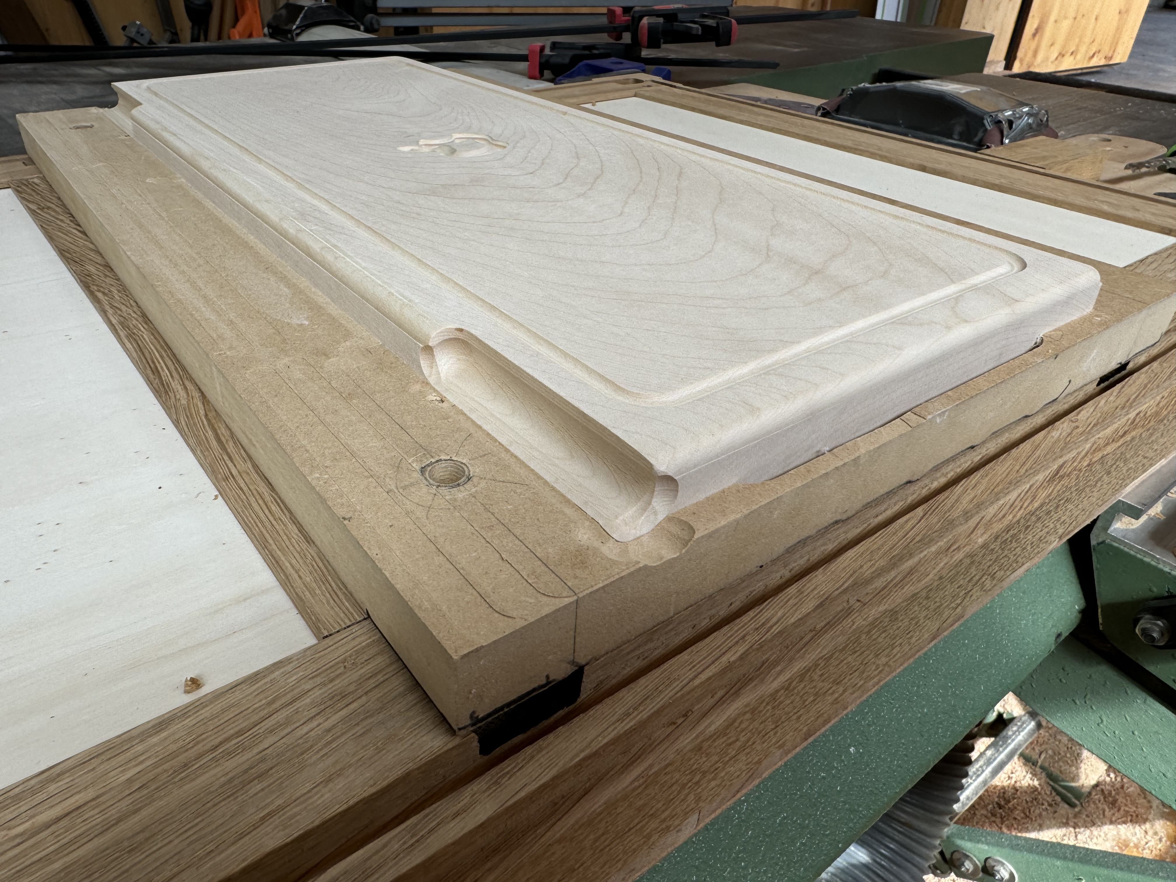 Le 13 juin, premier test de fraisage d'une face avant. Mise en place d'une face dans une empreinte en MDF. Les calages appropriés pour pouvoir changer de pièce et retrouver le zéro en X et Y.