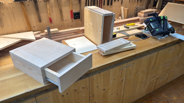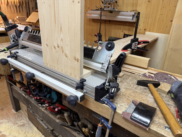 Le 2 juin 2025, fraisage des queues d'aronde pour assembler les grands tiroirs. Ici test d'un ensemble.