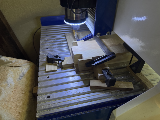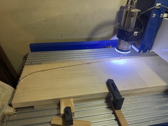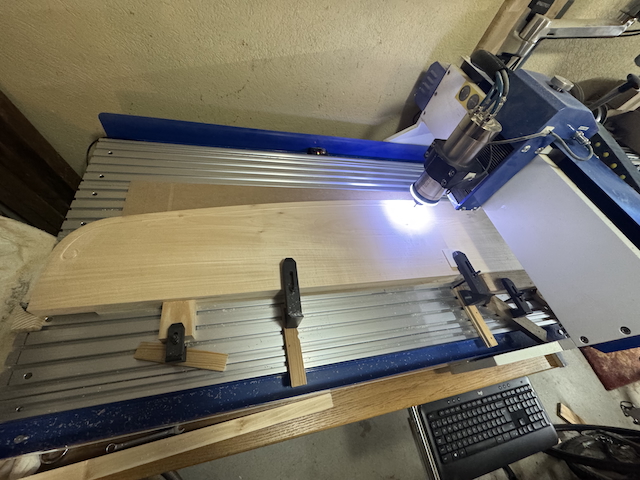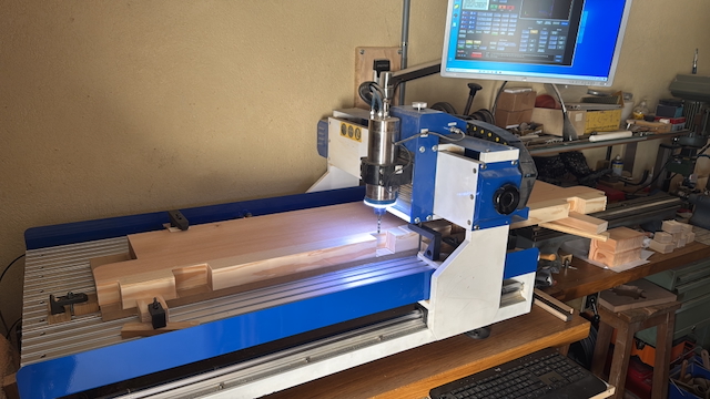 Le 25 mai 2025, taille des tenons sur la CNC des grandes pièces du cadre (pin douglas). Les pièces tenues par le serre-joint sont les martyrs pour éviter les éclats de coupes.