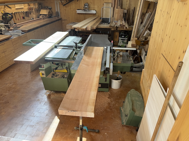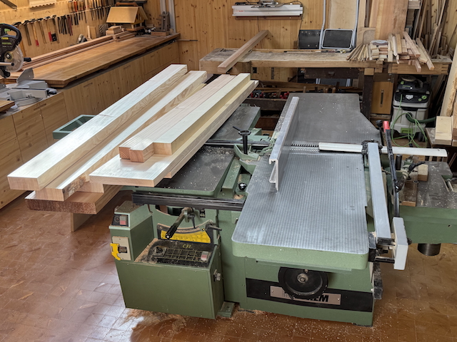 Le 16 mai 2025, début de la préparation des bois. Ici, une grosse pièce (un pied) en cour de dégauchissage.