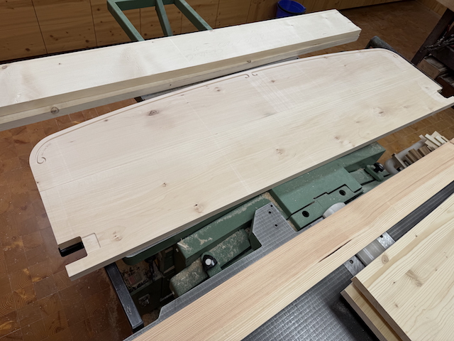 Le 26 mai 2025, découpe de la tête du lit dans une pièce de tilleul. Le dessin avait été modifié pour choisir cette forme. La capacité de la machine permet une coupe maximale de 900 mm, il faut donc procéder en deux coupes.