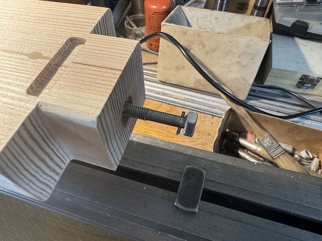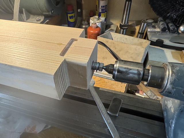 Le 1 juin 2025, insertion d'un filet M8 en bout d'une pièce du cadre. Le bois est fixé sur la table de la CNC et aligné sur le banc du tour. La pointe tournante maintient la boulon dans l'axe du bois et la clef fait entrer le filet dans le bois. Le boulon a été usiné pour entrainer le filet grâce à une goupille qui emmène le filet comme s'il s'agissait d'un tournevis !