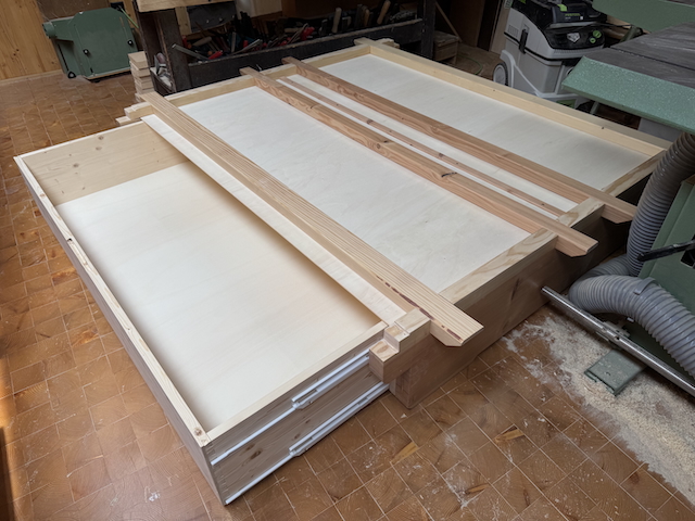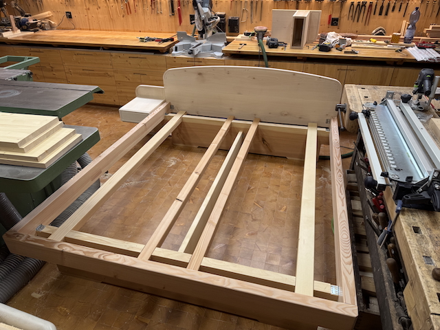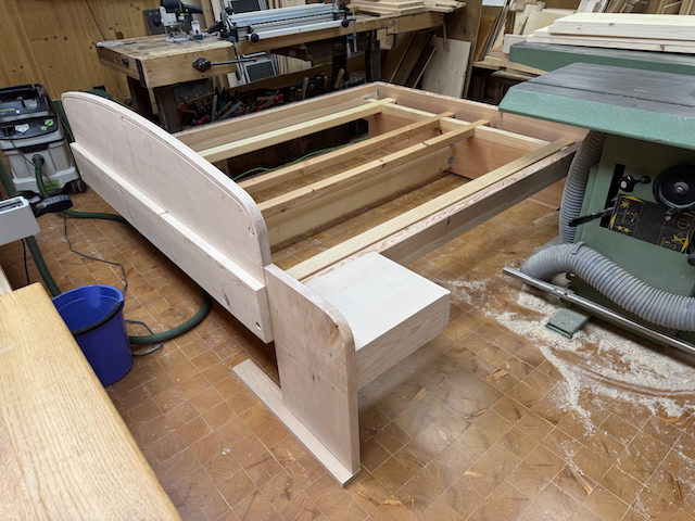 Préparation des bois, découpes et assemblage des chevets. Les côtés en frêne, le dessus en érable, le dossier en tilleul comme la tête du lit et le reste fond et tiroirs en sapin, les faces avant des tiroirs en érable.