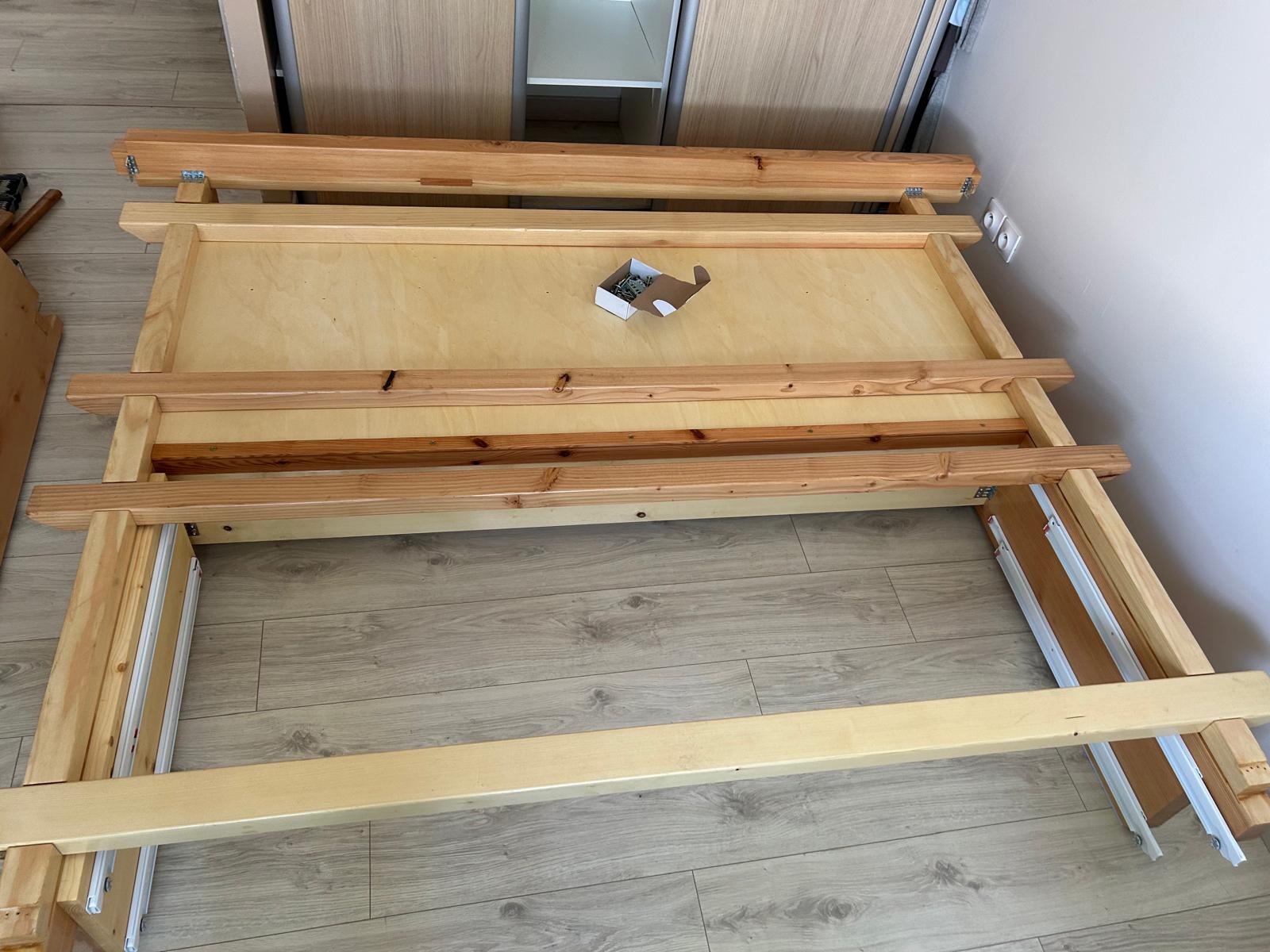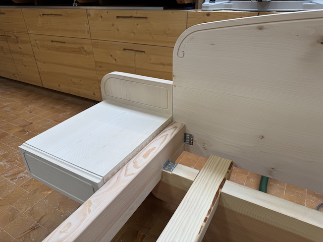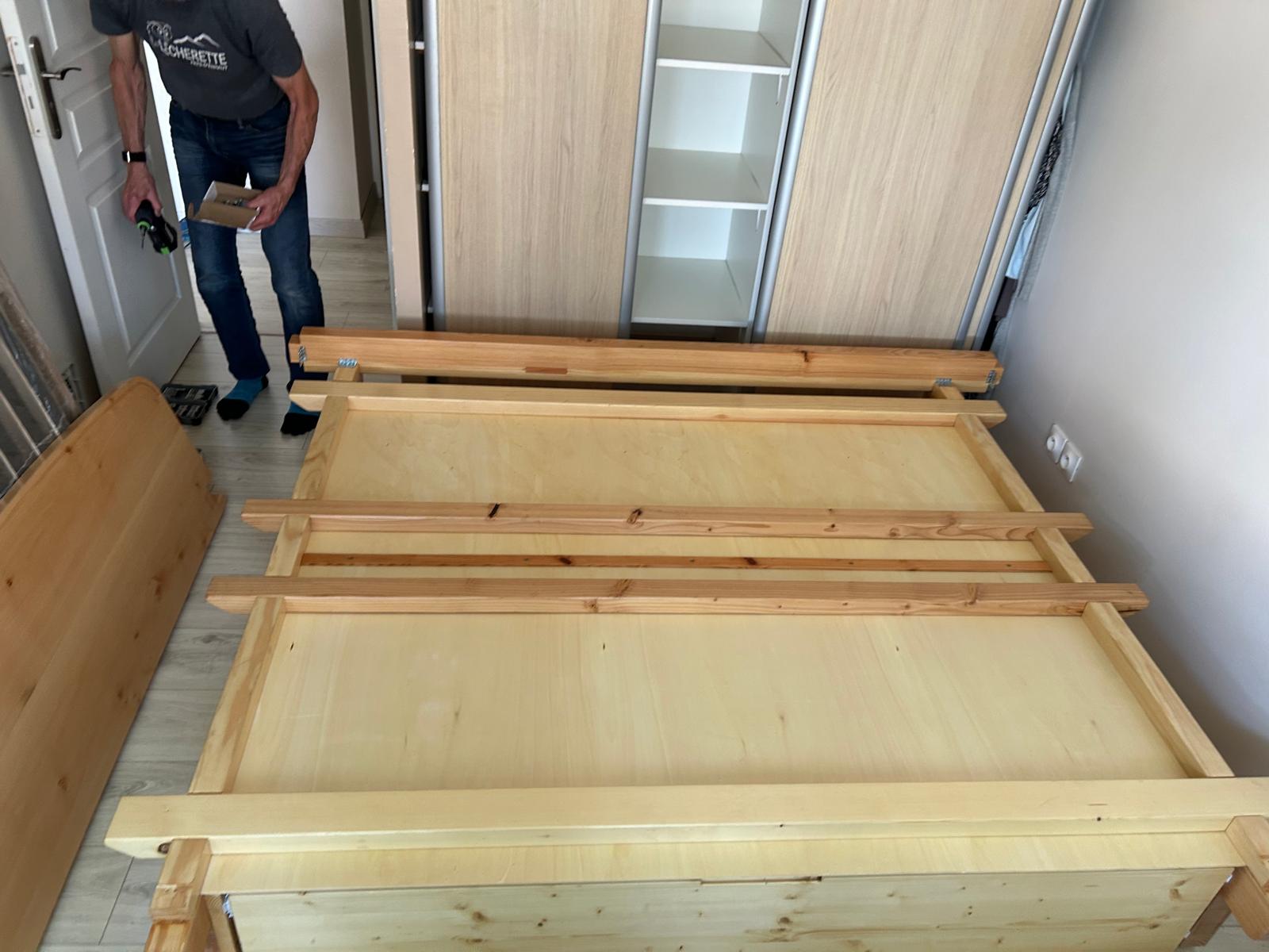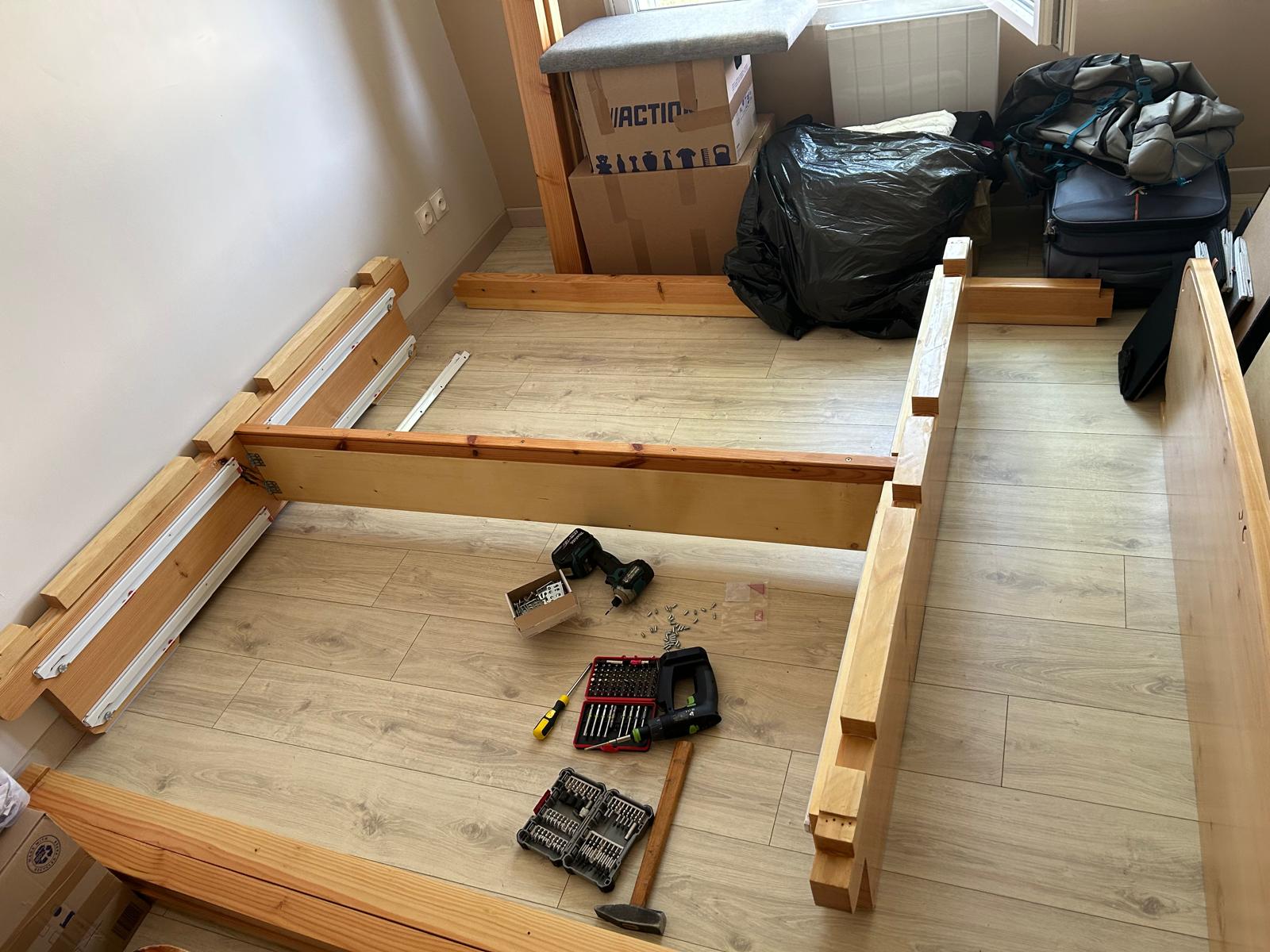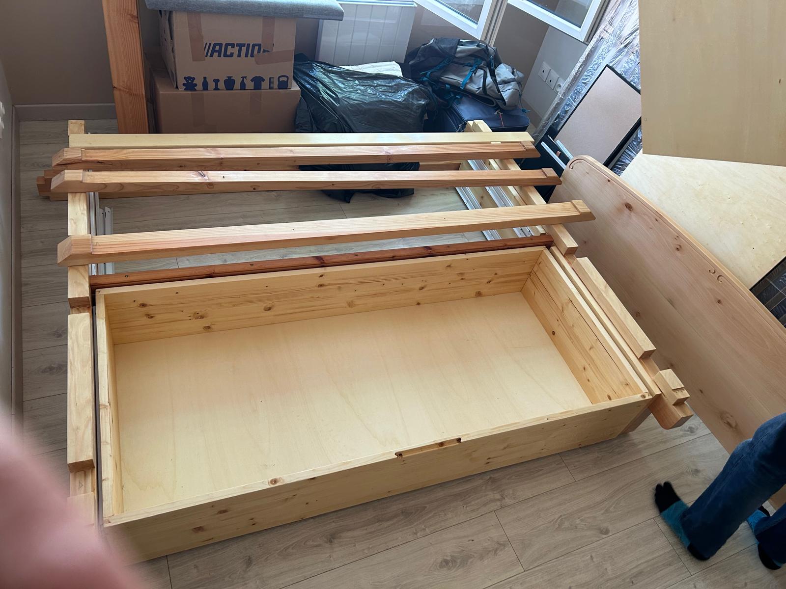 Le 13 juin 2025, montage sur place. Les pieds avec la pièces centrale et les coulisses des tiroirs.