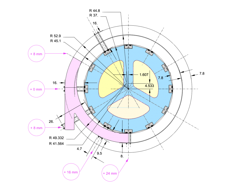 Une vue de dessus cotée pour la construction. Les chemins de roulements auront 78 mm de large. La voie extérieure pourra être placée proche du cercle extérieur qui finalement aura 1.058 m .