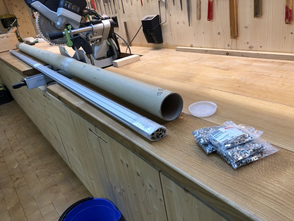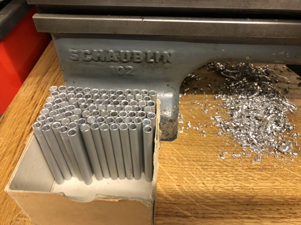 Petite progression, le 22 mars, environ 1/4 des tubes support est prêt. Il faut 328 tubes de 80 mm de long et 42 tubes de 16 cm dont quelques un de dimensions intermédiaires. Autant de tiges filetées, écrous borgnes, rondelles !