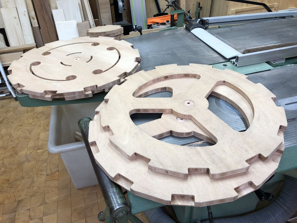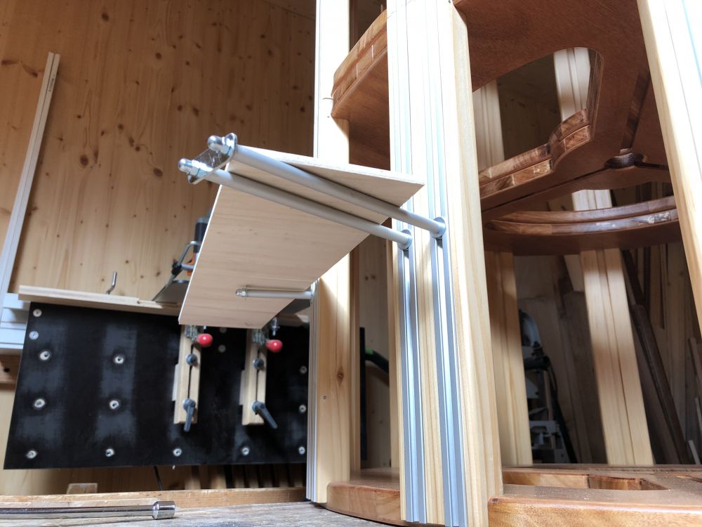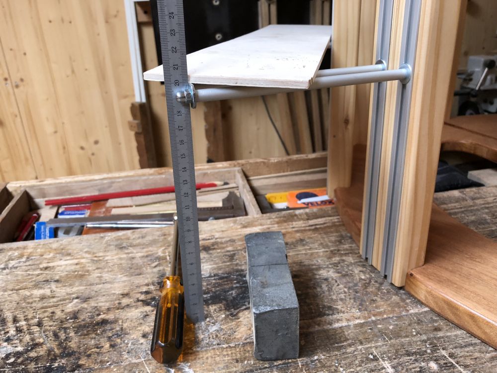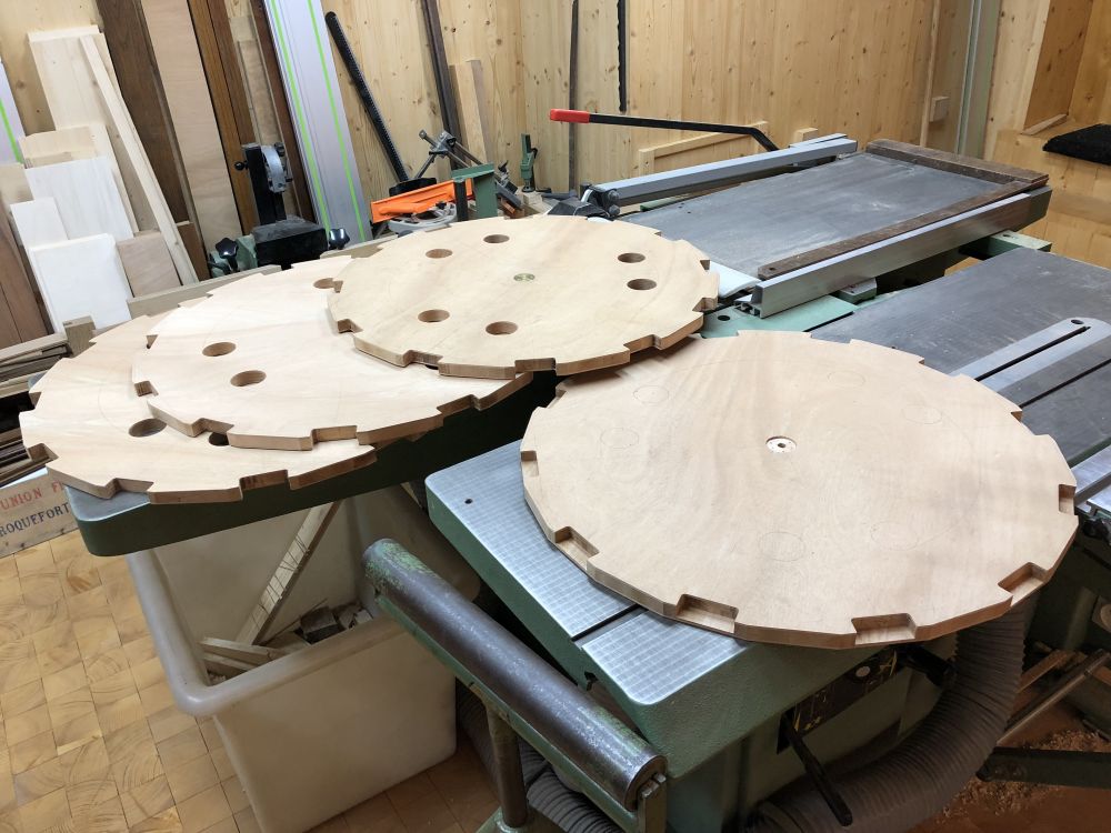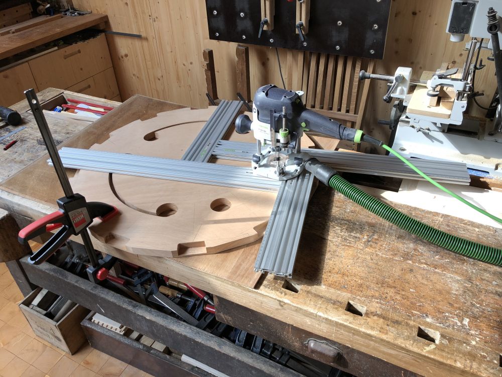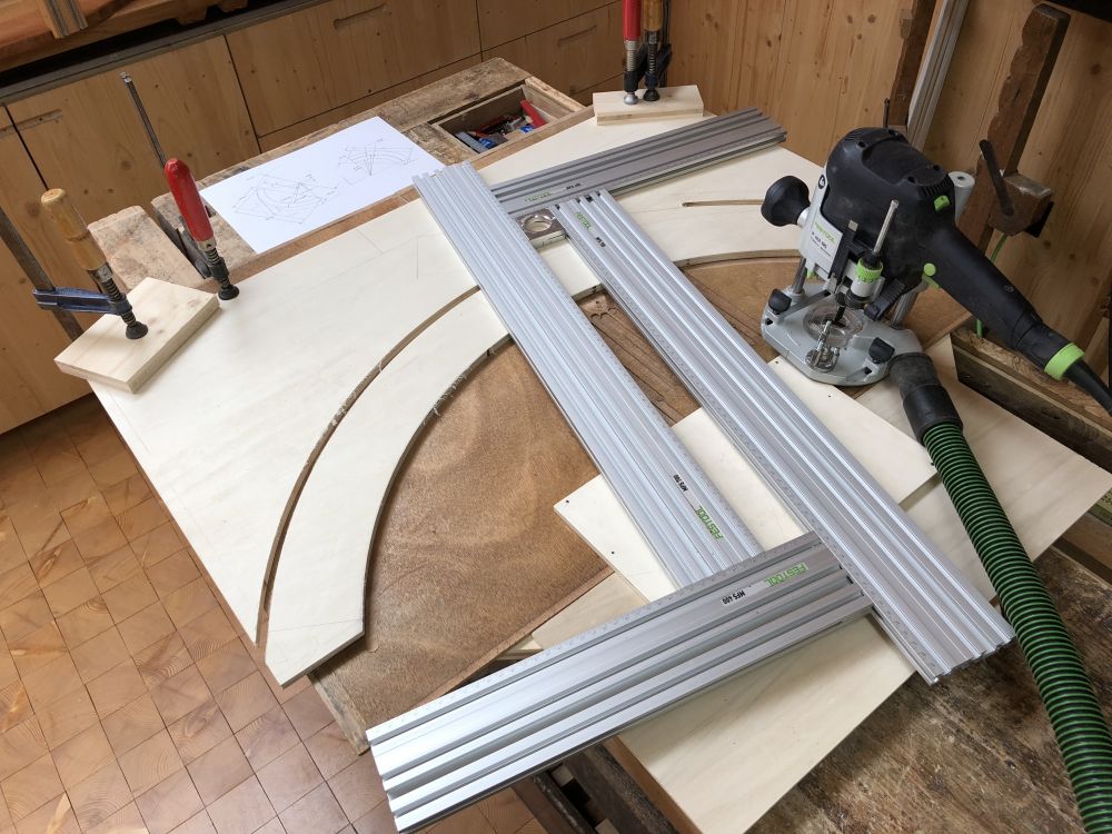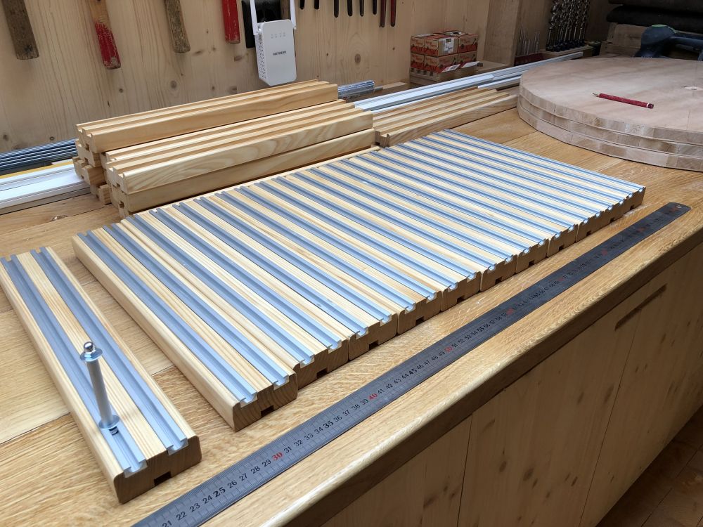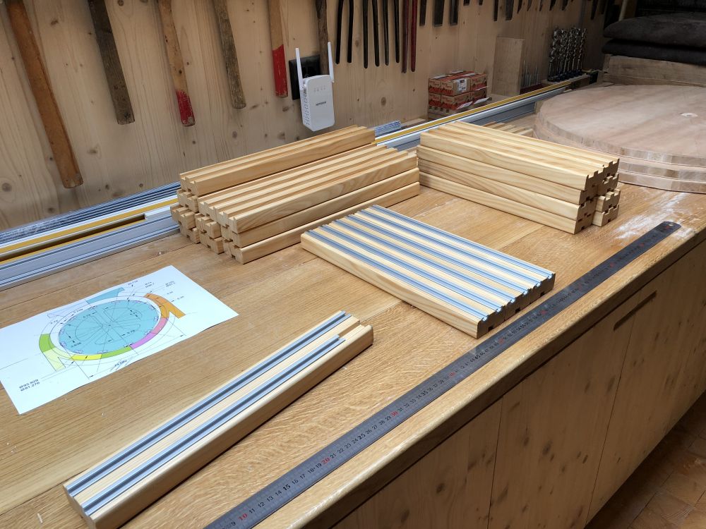 Les profilés du module de base sont prêts. Essai d’un support de chemin de roulement avec un tube alu de diamètre 8 mm. Préparation des bases de l'hélicoïde. Le bois utilisé est du latté de 22 mm d'épaisseur.