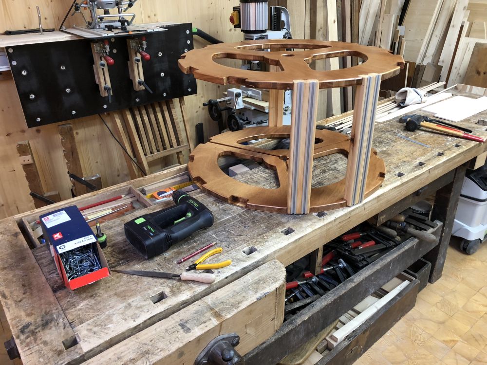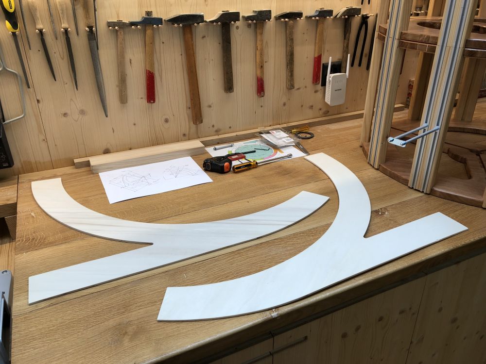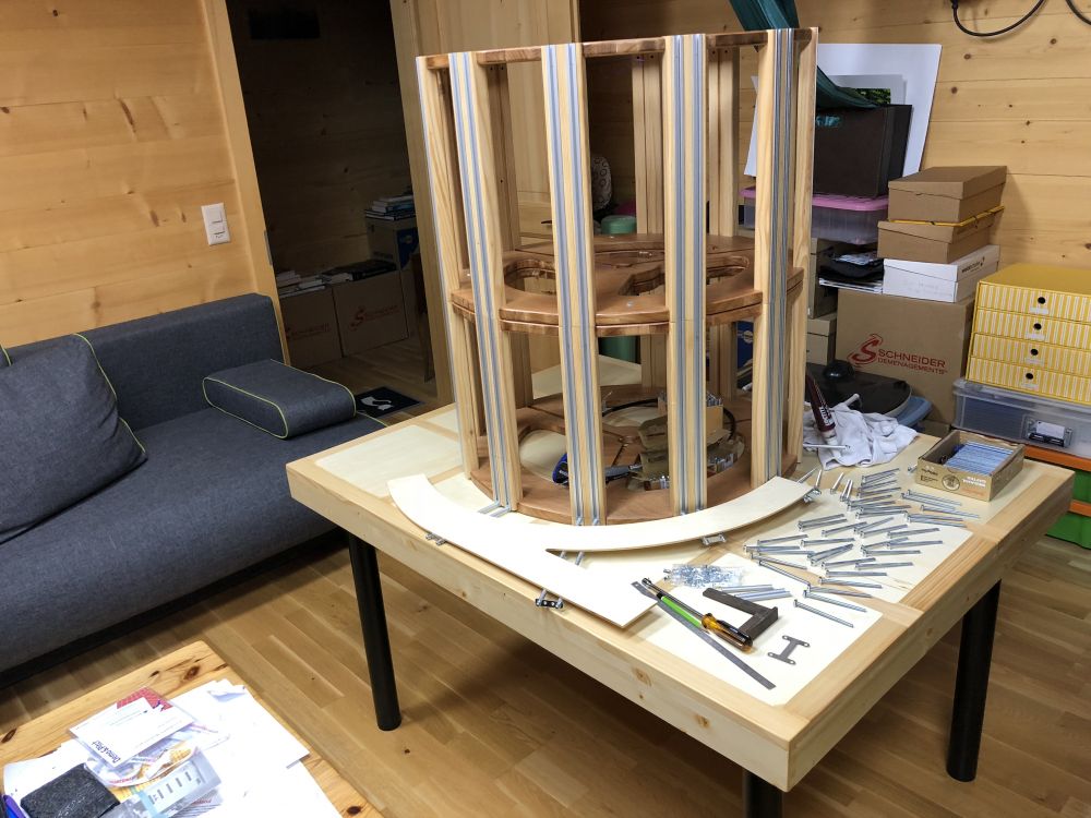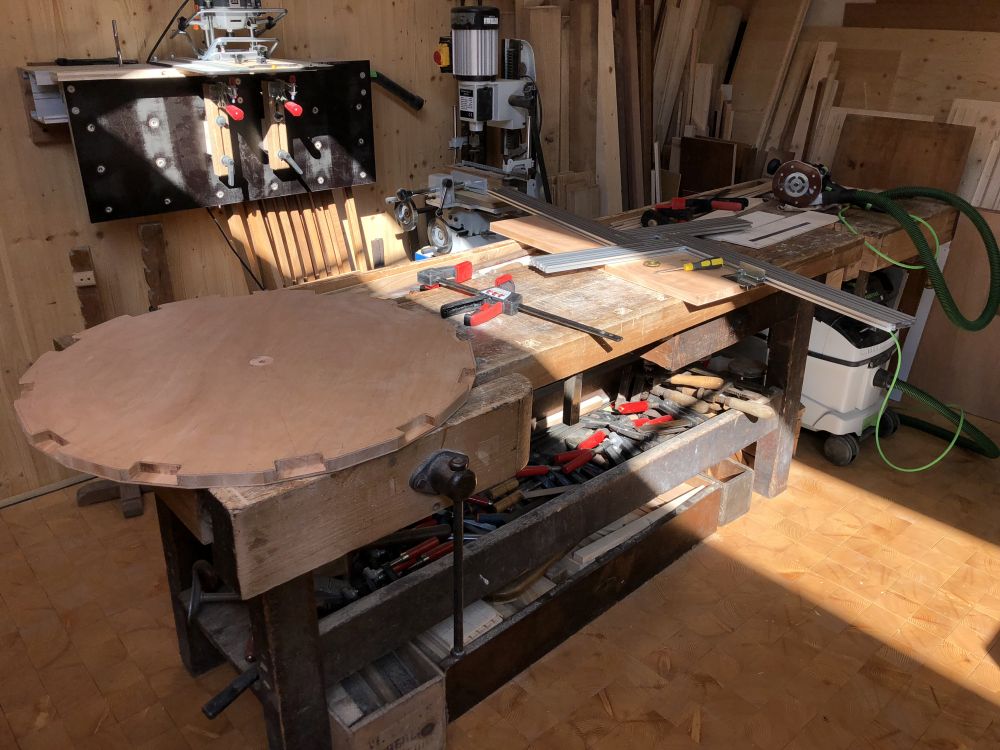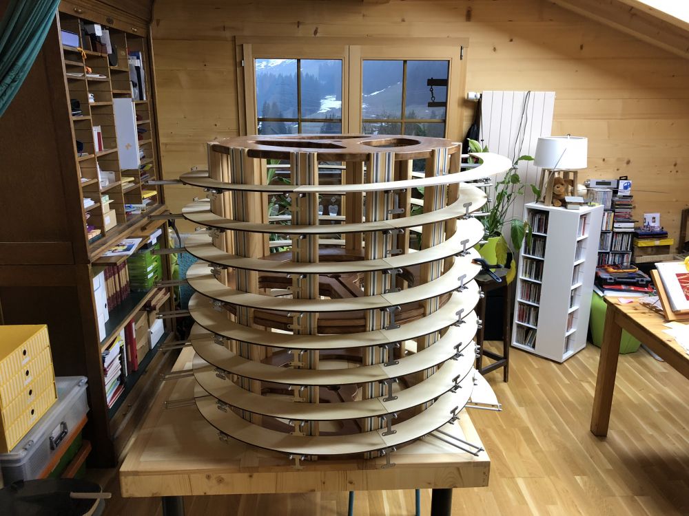Pour mettre l'hélicoïde en place, il faut une table de 1 m de large et environ 1,30 m de long. Dessin puis construction. La méthode utilisée est justifiée par la disposition de bois, de contreplaqué et pour obtenir une table relativement légère. Plus en détails sur l'article du blog.