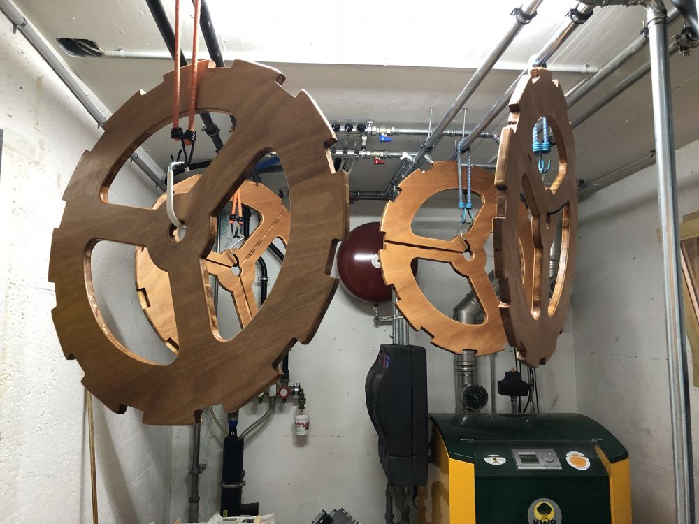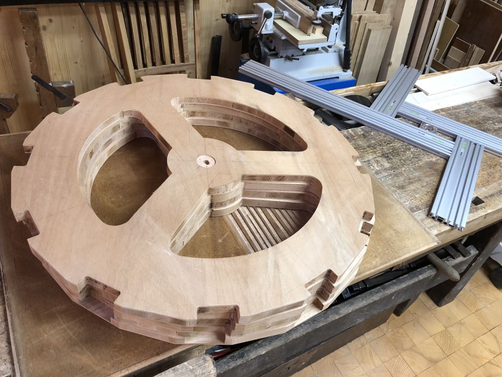 La structure de l'hélicoïde est terminée, les éléments mécaniques sont en cours de préparation et les chemins de roulement seront découpés par laser. Sur ce dessin, le rectangle minimum de bois nécessaire pour la découpe.