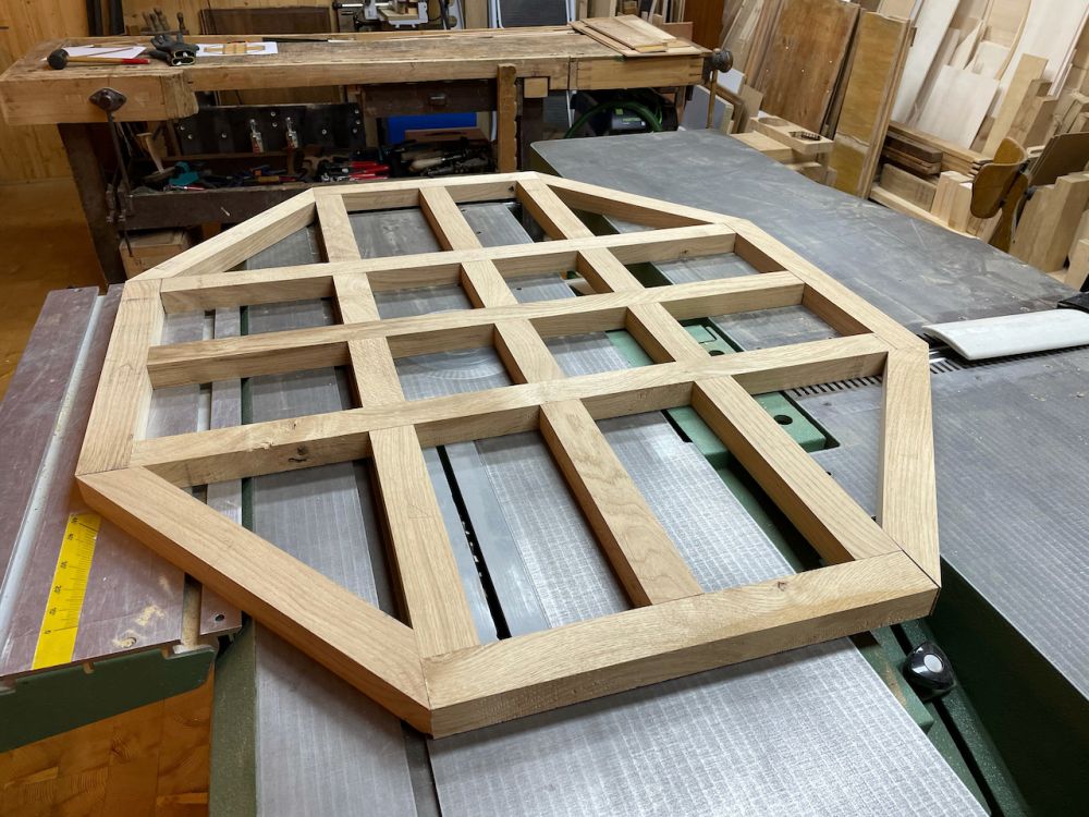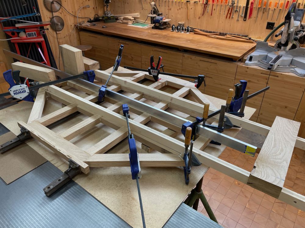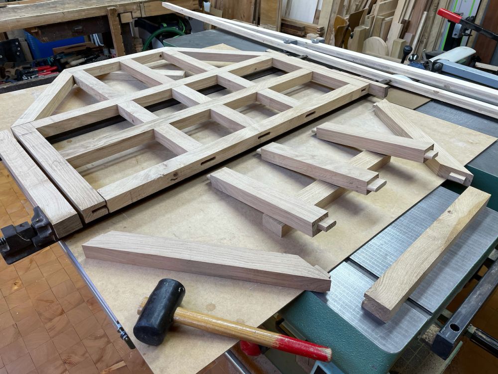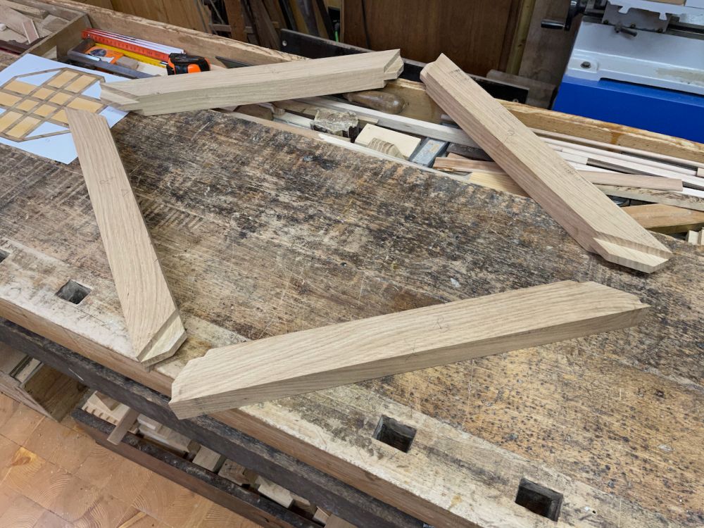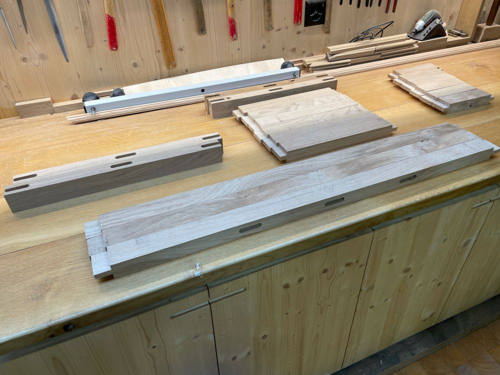 Les pièces prêtes pour un assemblage de test. Il faut encore finir les tenons ... sur la scie à chantourner !