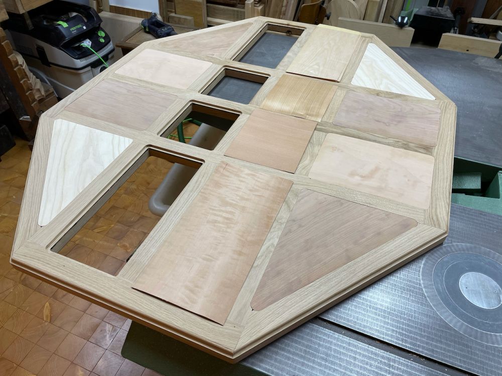 Ajustage des placages sur les contreplaqués et pré-ponçage.