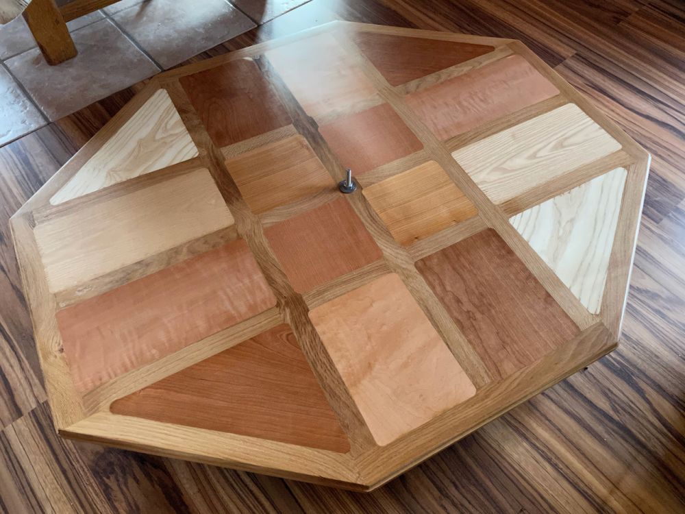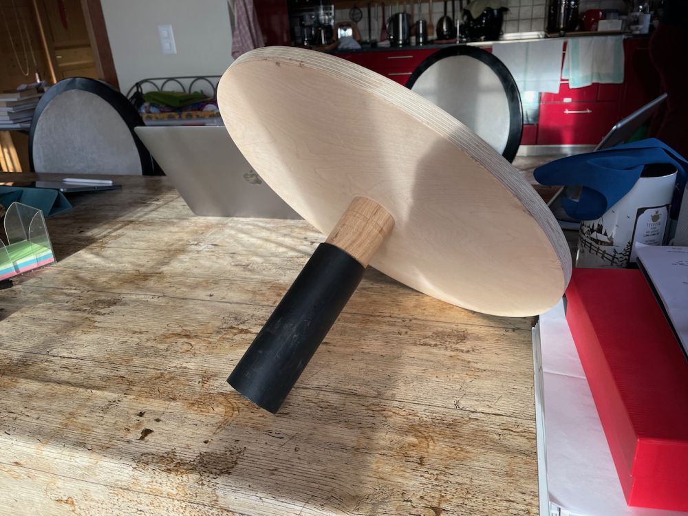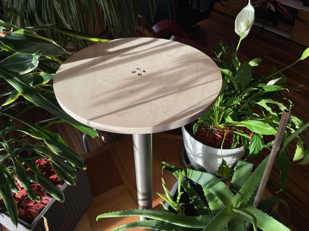 La pièce en bois est insérée dans un tube pvc qui s'emboîte parfaitement dans le pied métallique du plateau. Voici le petit plateau monté.