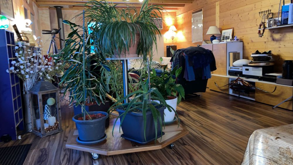 Le 31 décembre 2020, le plateau est monté sur ses roues avec la tige filetée au centre pour le pied support élevé d'un chlorophytum !