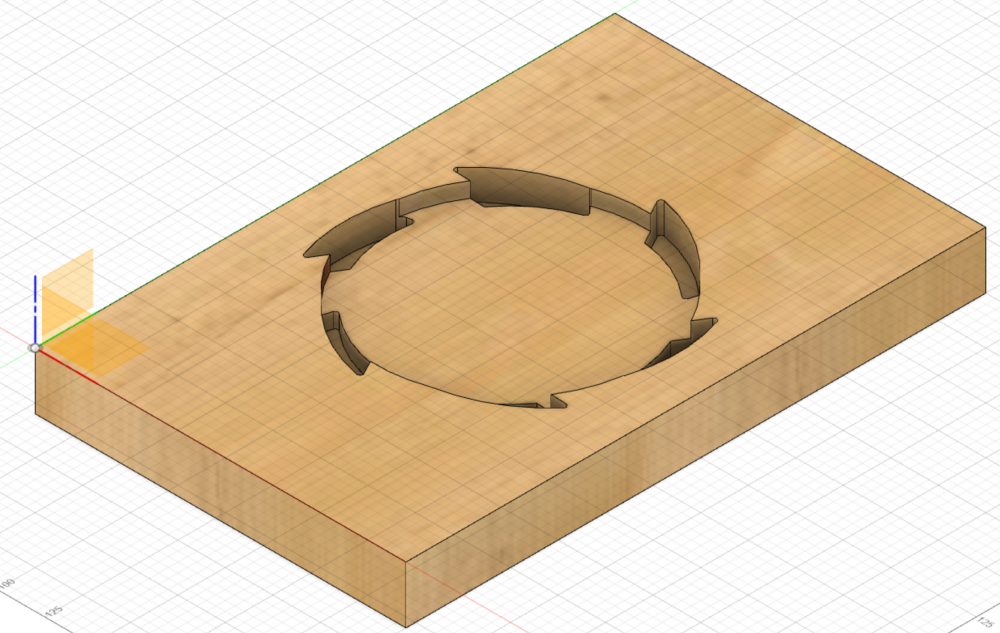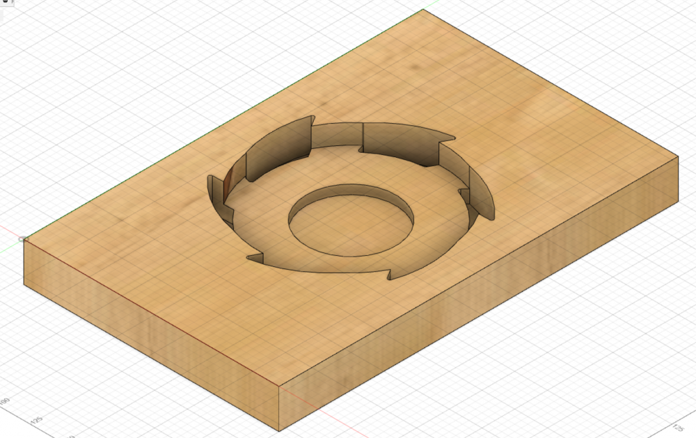 Le 28 juillet, pour reprendre la main sur Fusion 360 et utiliser des chutes de sapin, je dessine une boîte pour ranger une fraise droite de diamètre 160 mm et hauteur 40 mm. La particularité sera la reproduction en dessin de la fraise. Résultat du dessin de la boîte.