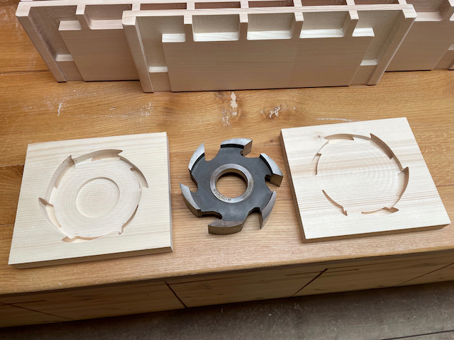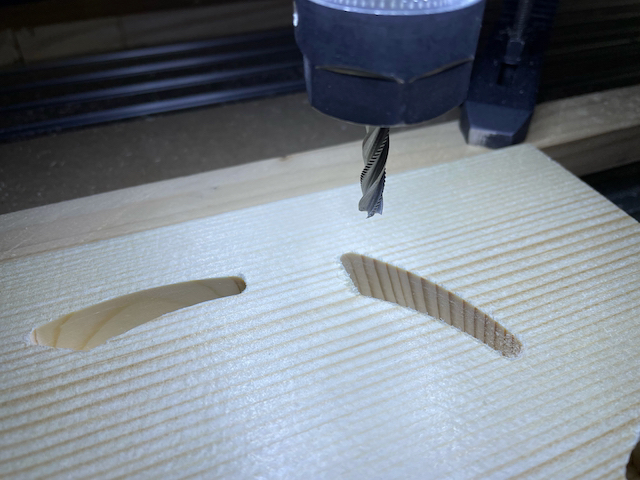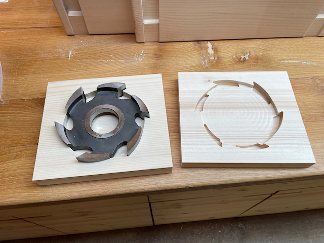 Ensuite, les exercices de fraisage. Essai avec un nouveau modèle de fraise spéciale pour le bois, qui donne un très joli résultat.