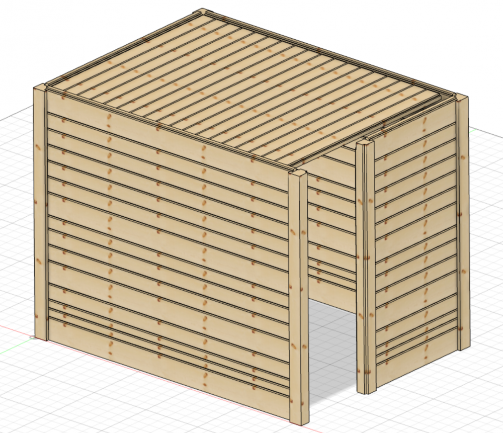 Aujourd'hui, 19 septembre 2021, quelques heures passées sur Fusion 360 pour définir les dimensions exactes obtenues après le façonnage du bois. Dimensions exxtérieures: 2574 mm x 1914 mm et environ 2000 mm en hauteur. Les plus importantes en intérieure: 2410 mm x 1750 mm et ~ 1950 mm de hauteur.