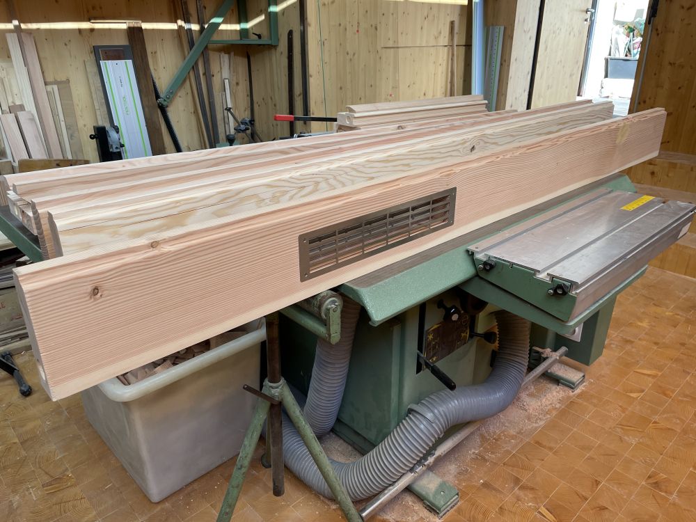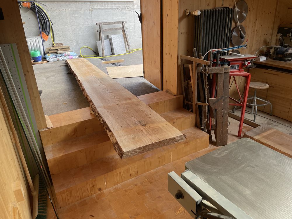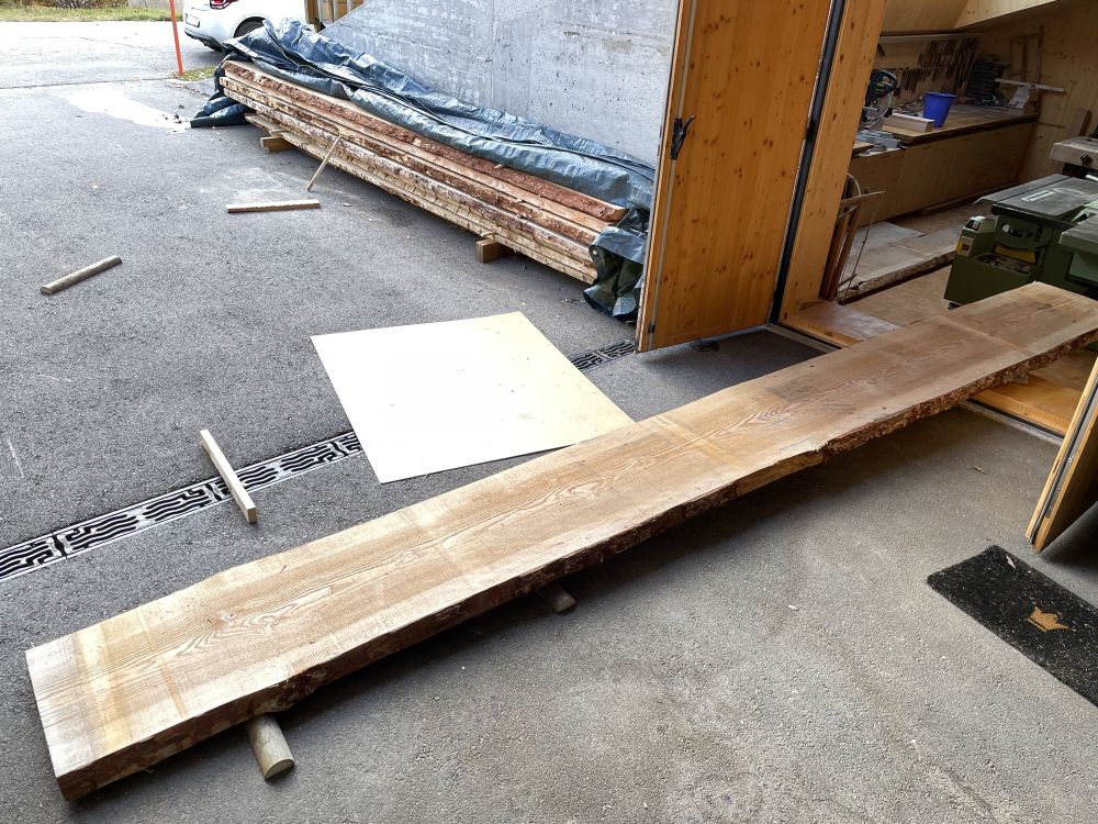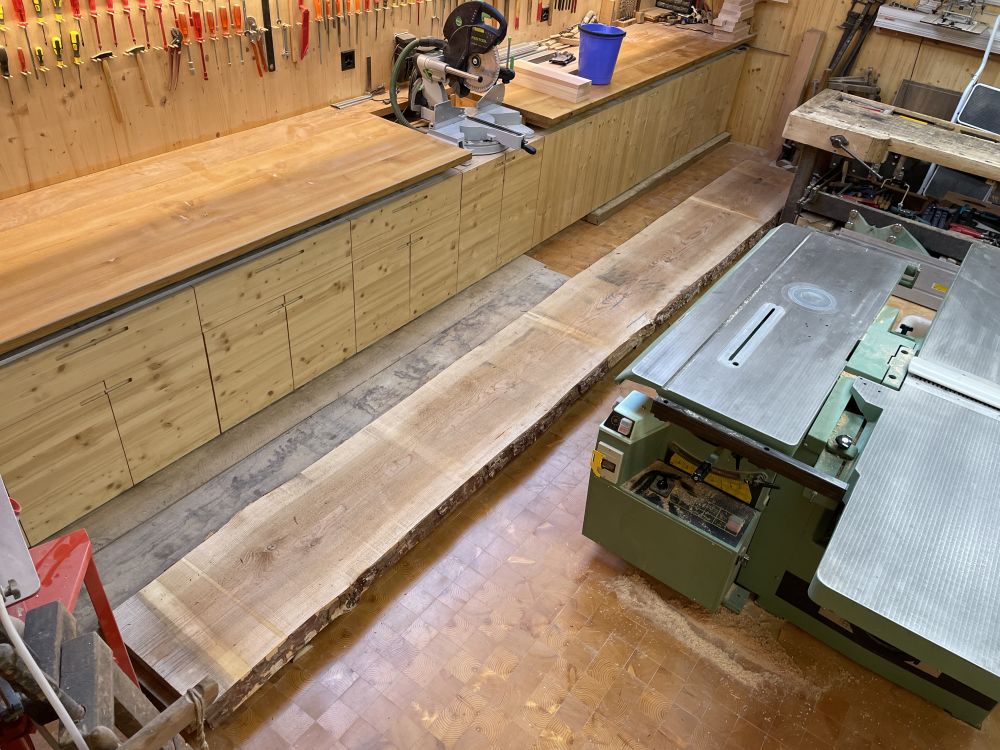Le 30 octobre, l'hiver approche et j'essaye de rentrer les plateaux de pin, vu que l'atelier est libre. Le plateau fait 5m17 x 54 cm et 6 cm d'épaisseur. C'est lourd !