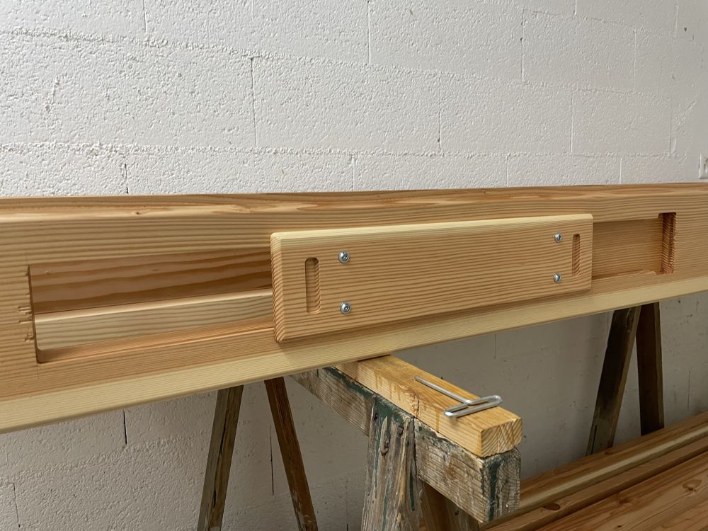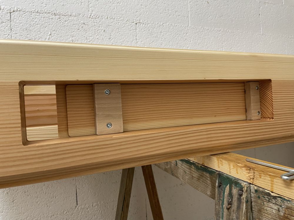 Une parfaite symétrie est nécessaire pour fraiser l'autre côté du volet qui est maintenu en place par vis en utilisant les trous pour les vis de fixation des coulisses sous les volets.