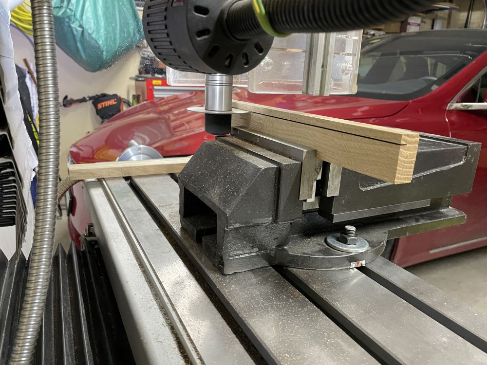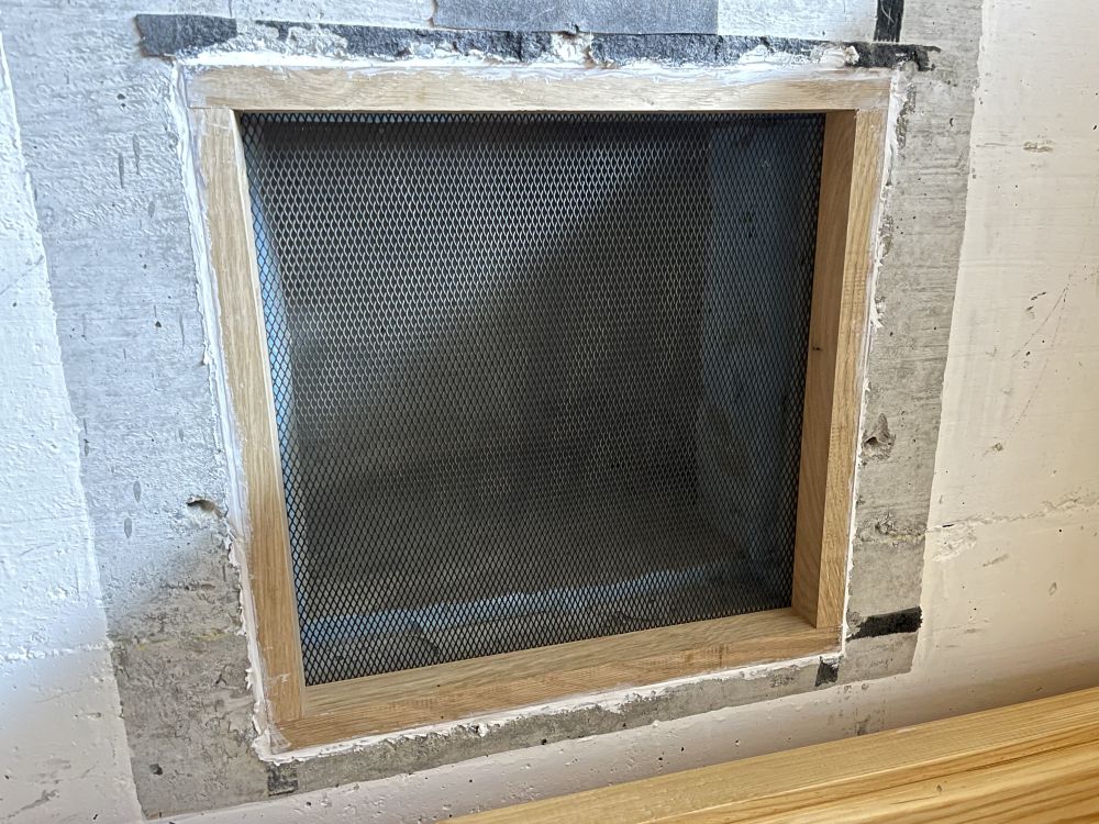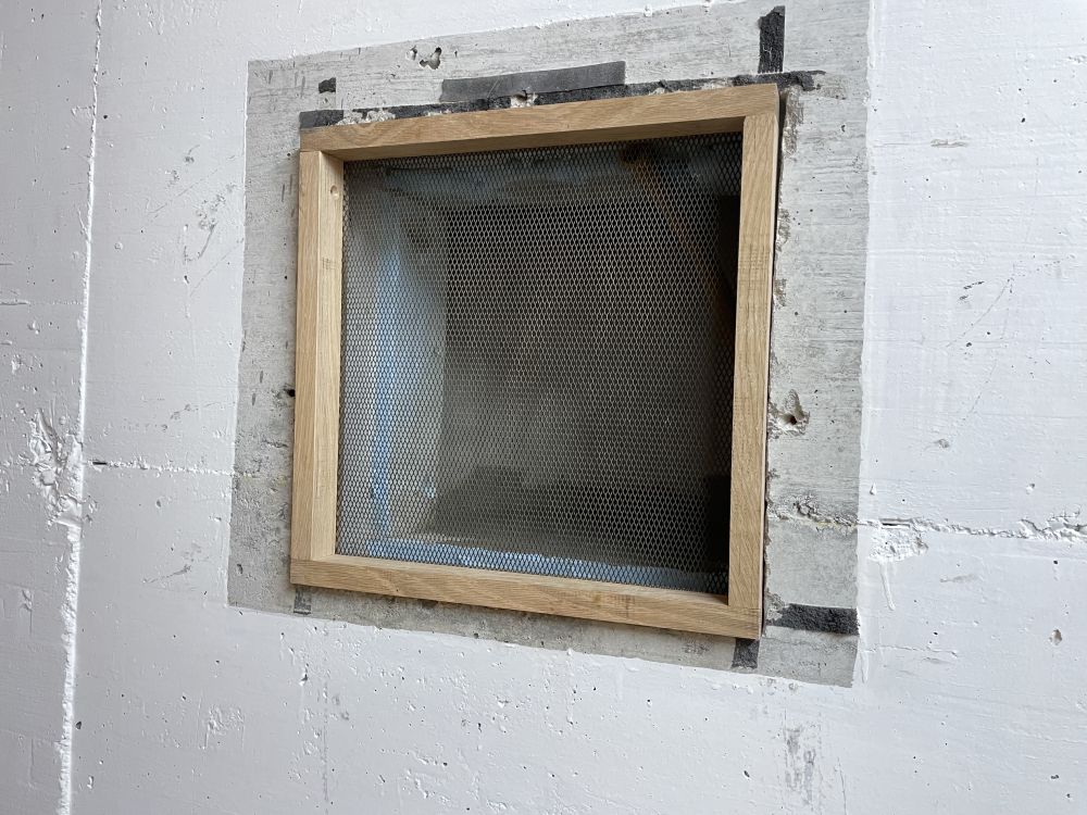 Le 17 décembre, démontage de la petite fenêtre pour la sortie d'aération. Préparation d'une grille pour l'ouverture de 34 cm x 34 cm. La grille en métal déployé a une épaisseur de 1.3 mm. Un cadre en bois avec une rainure de 1.4 mm pour maintenir la grille. Fraisage de la rainure avec une fraise disque de 1.2 mm d'épaisseur.