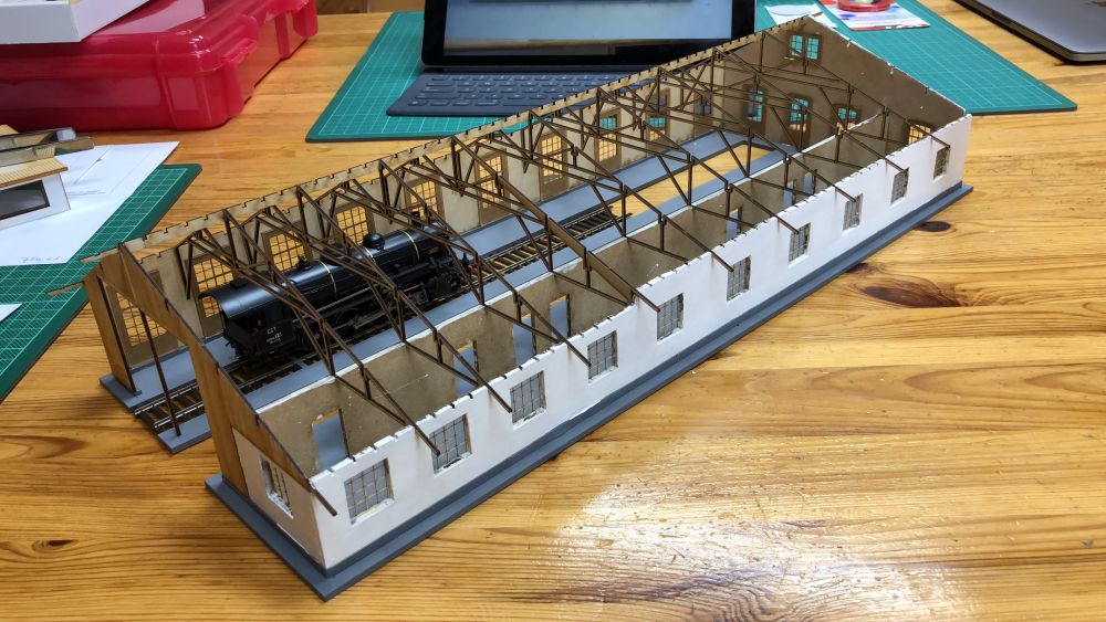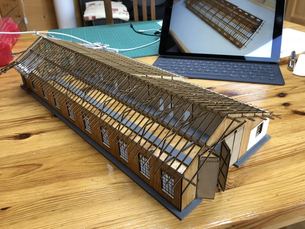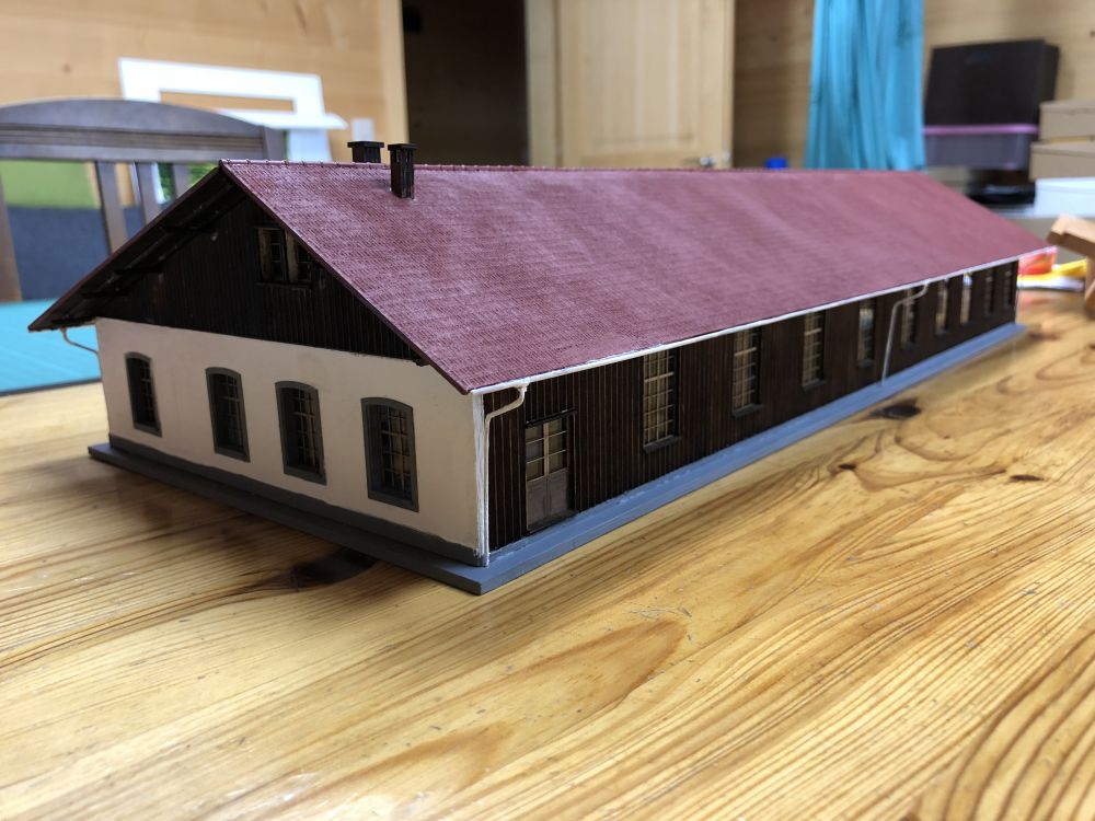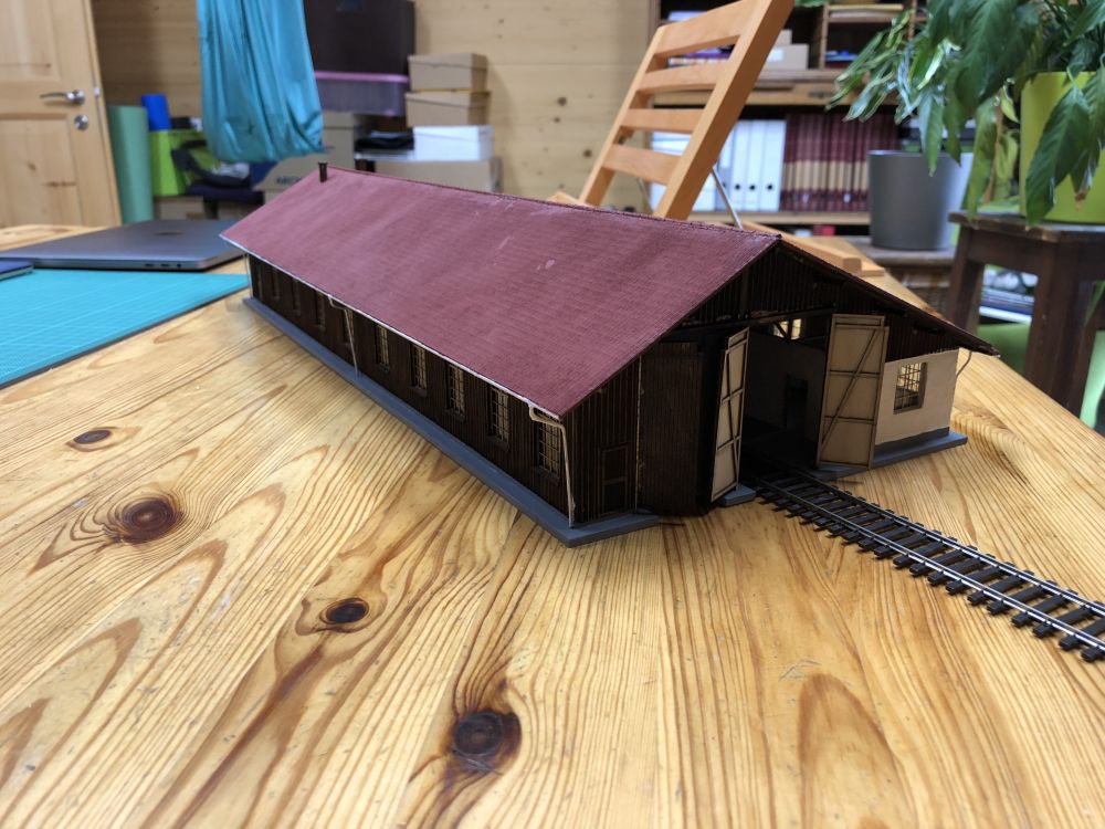 Pour me faire la main et évaluer la difficulté, j'ai monté un petit chalet et ensuite ce hangar qui est une reproduction du hangar pour locomotives à Bauma. Maquette en bois faite par "Laser Création".