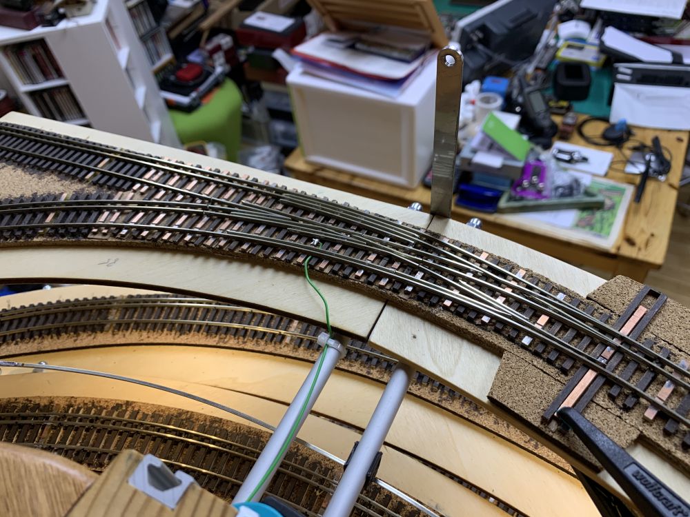 Bien plus tard, le 16 mai déjà ! ... beaucoup de choses ont été faites, y compris du vélo (en intérieur). Sur l'hélicoïde, presque toutes les machines ont été testées avec quelques corrections faites depuis "LokProgrammer" pour un fonctionnement plus précis. Évidemment pas les grandes Ae 6/6, Ae 8/8, 241 etc .. qui ne peuvent tourner sur le grand rayon de l'hélicoïde (41 cm et 49 cm). Certaines ont parcourues les 45.23 m plusieurs fois avec contrôle d'entrées et sorties sur chaque aiguille.
