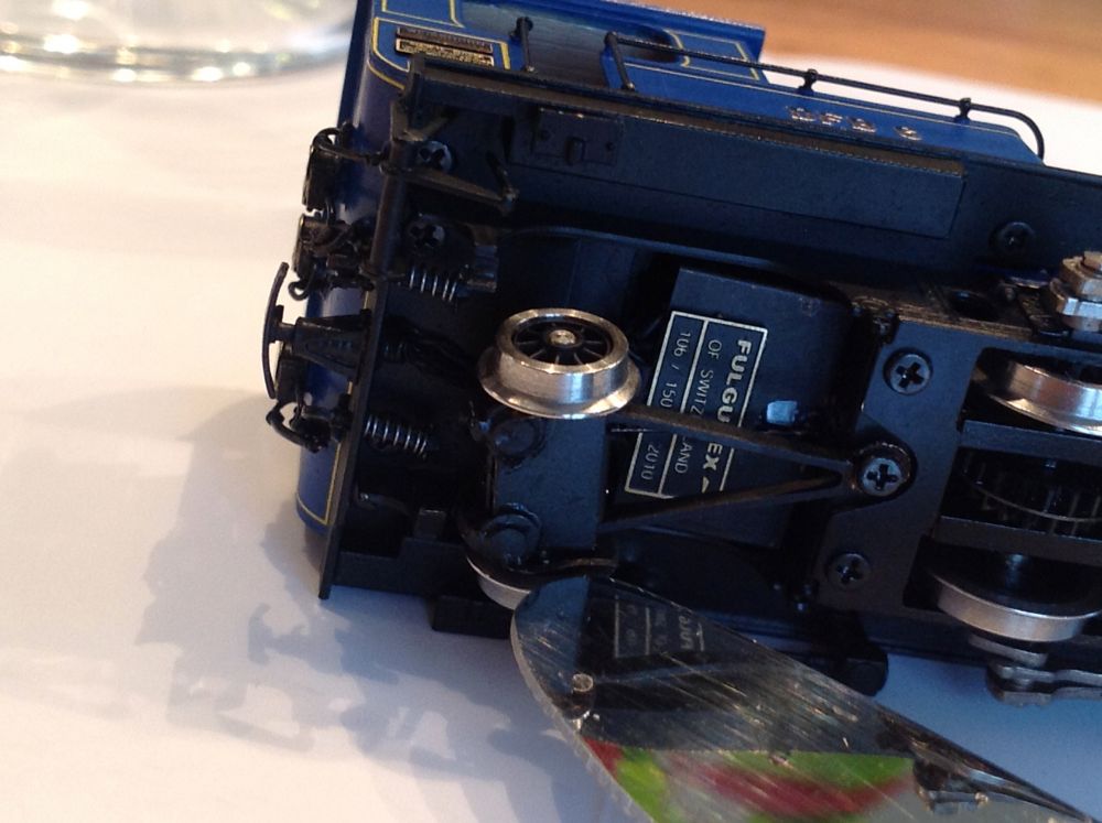 La responsable de cette "levée" est une bosse sous le train arrière, qui entre en contact avec le contre-rail et soulève le train arrière de quelque 1/10 de mm, donc suffisamment dans la courbe pour permettre à la roue droite de monter sur son rail. Il y a deux bosses, qui sont les prises de courant du train arrière, visible sur cette photo.