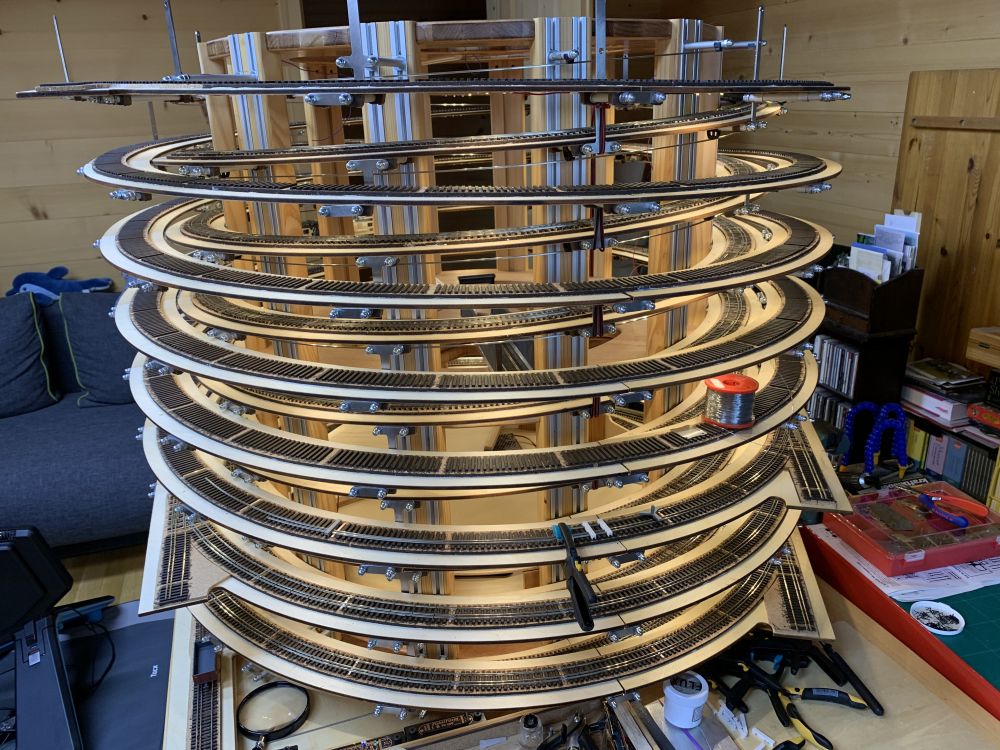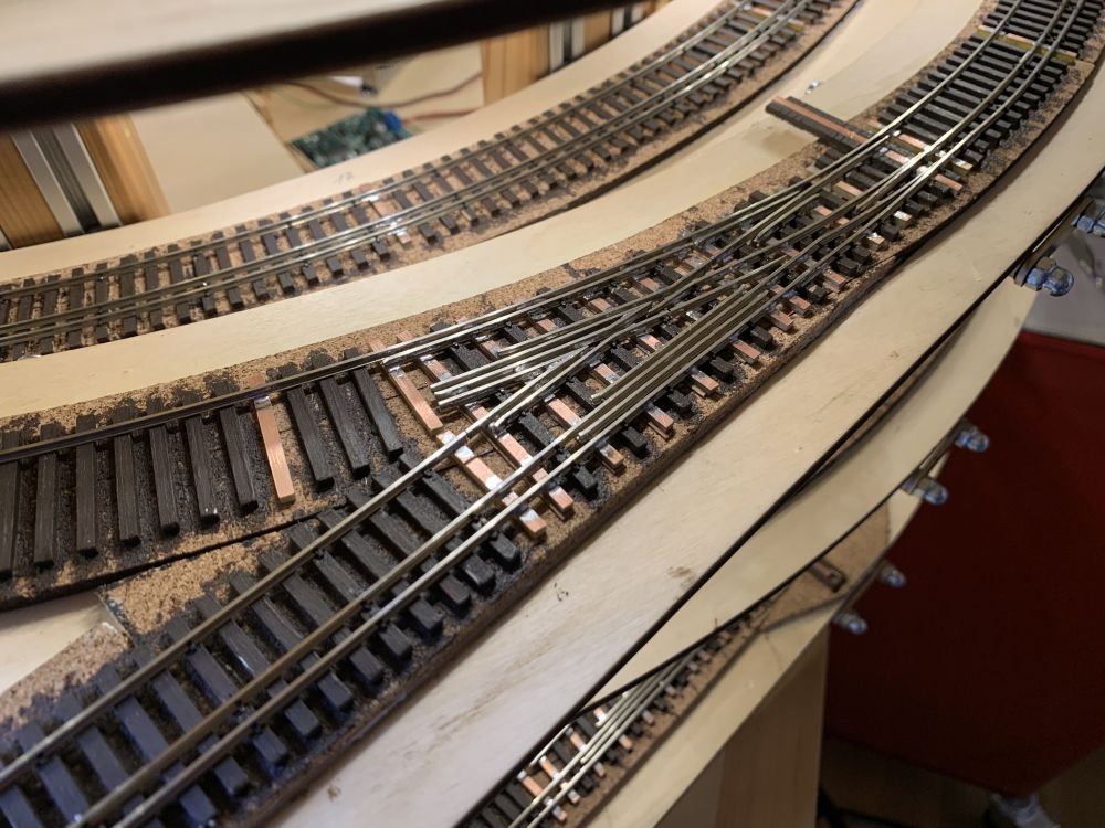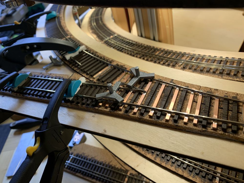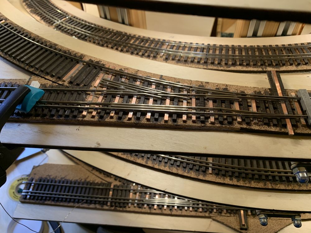 Dimanche 1er mars, la première pointe de cœur pour H0 est en place. L’usage du gabarit pour la souder facilite le travail. La portion de voie de sortie H0 est terminée.