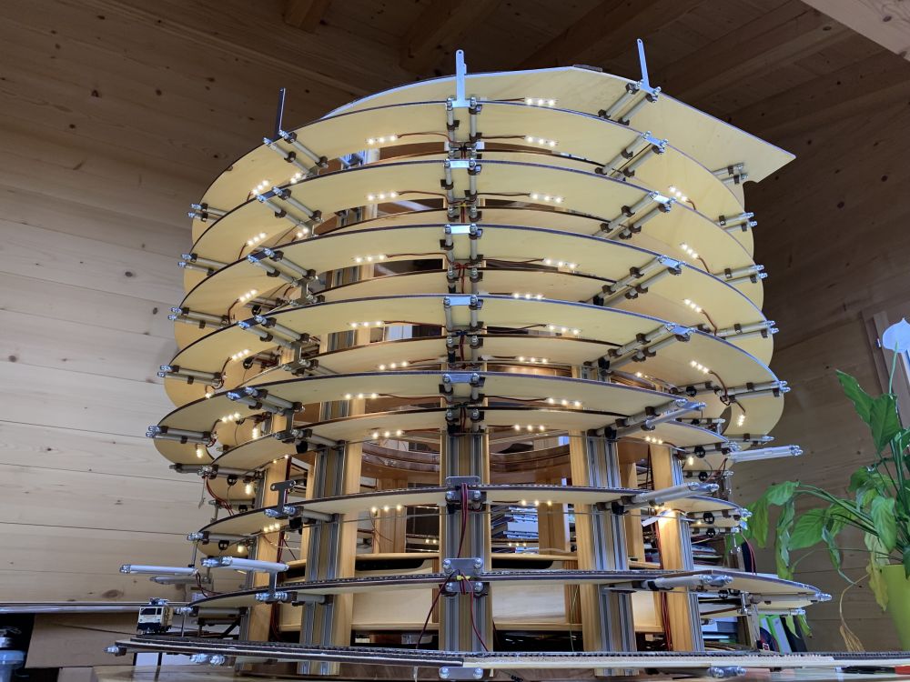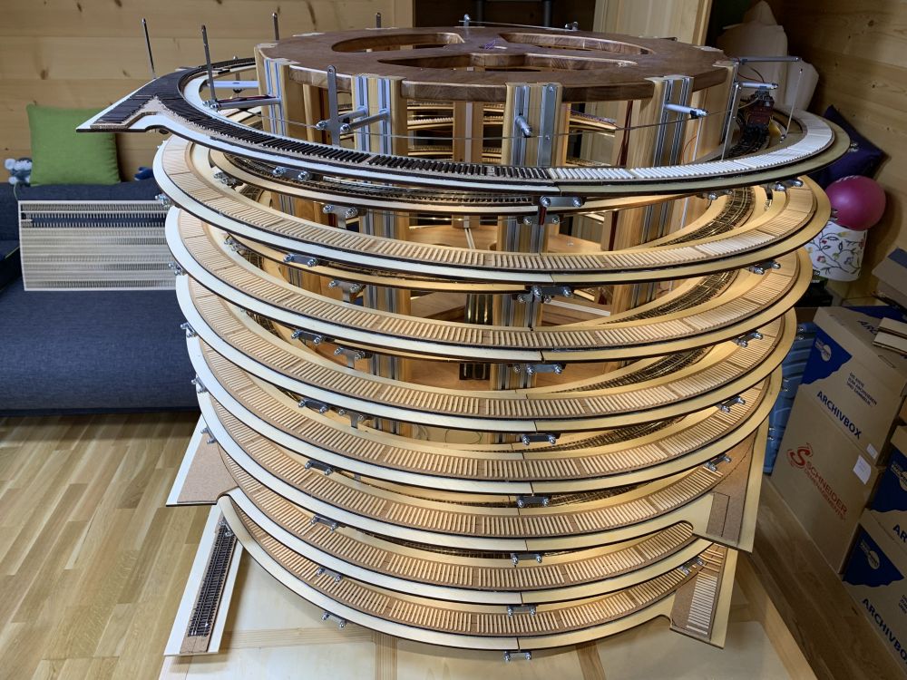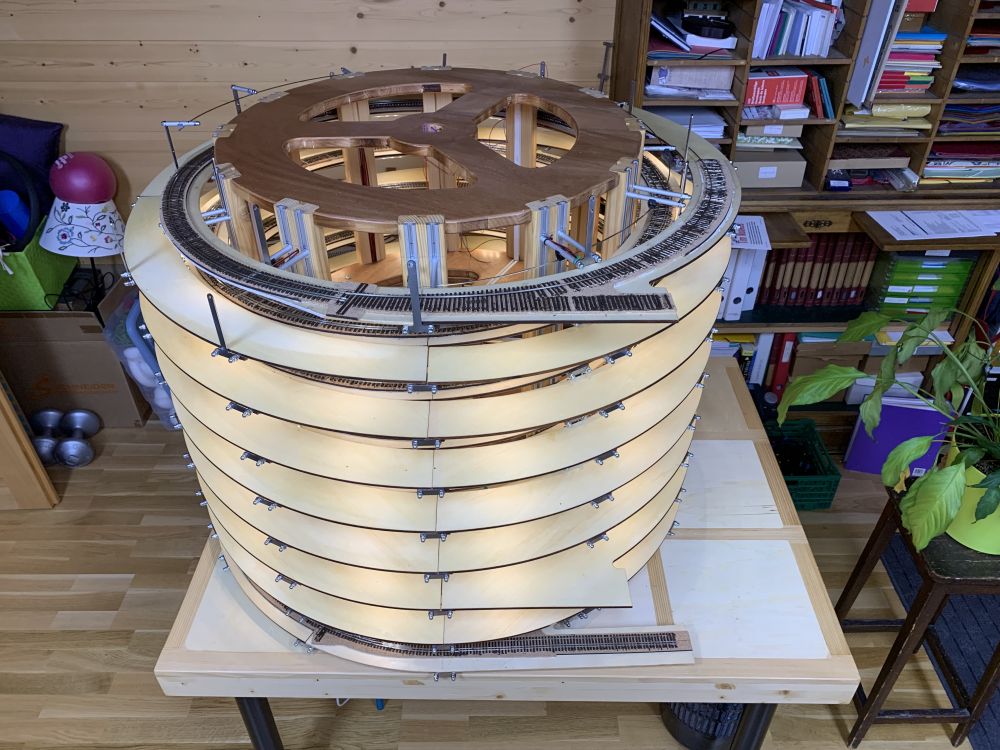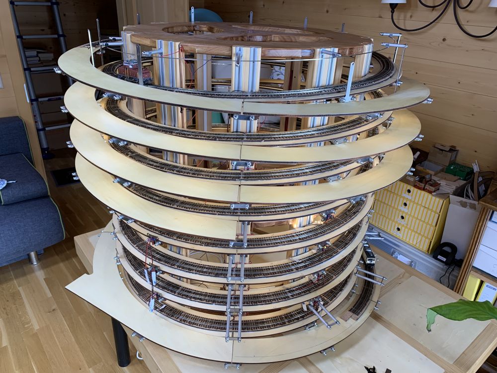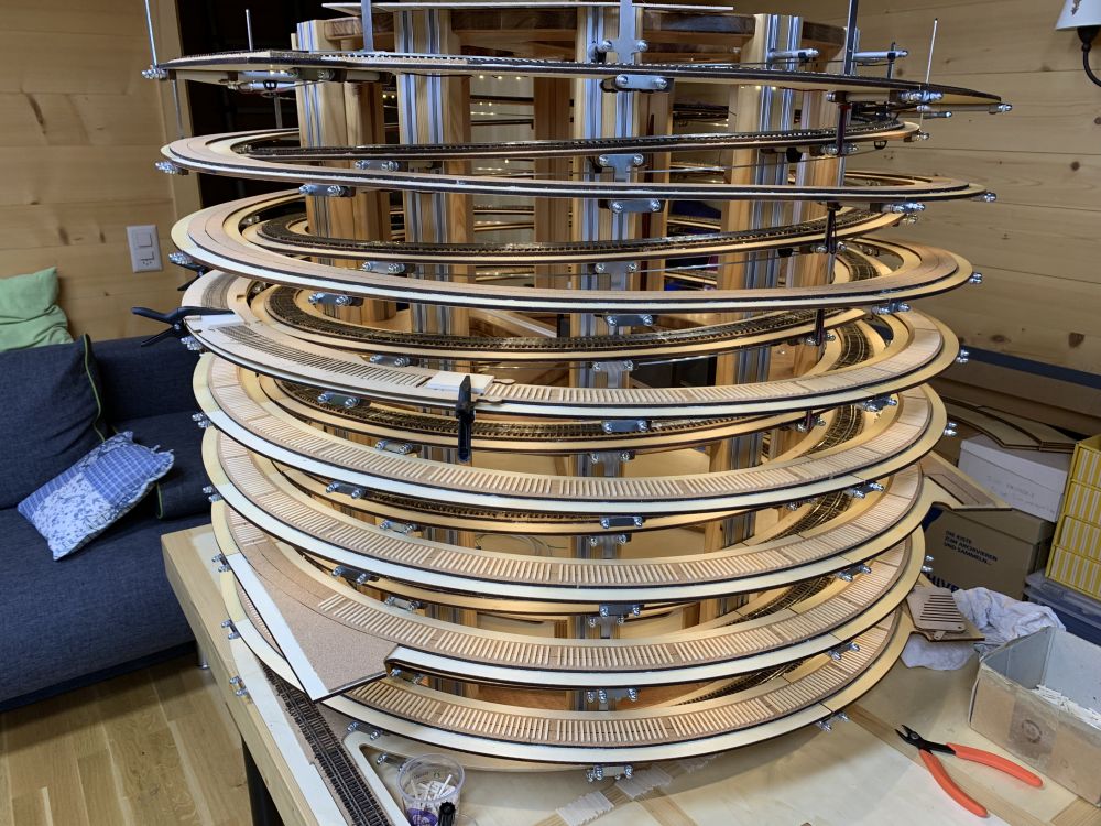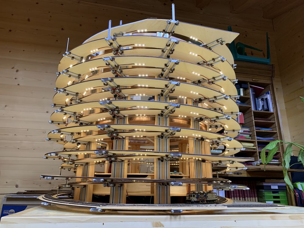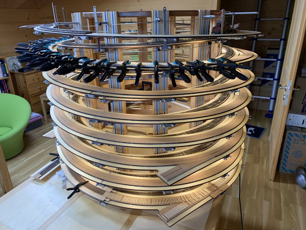 En parallèle, la fin du test de la caténaire et début du montage de la structure pour la voie extérieure. Pas mal de tournage pour les tubes supports.