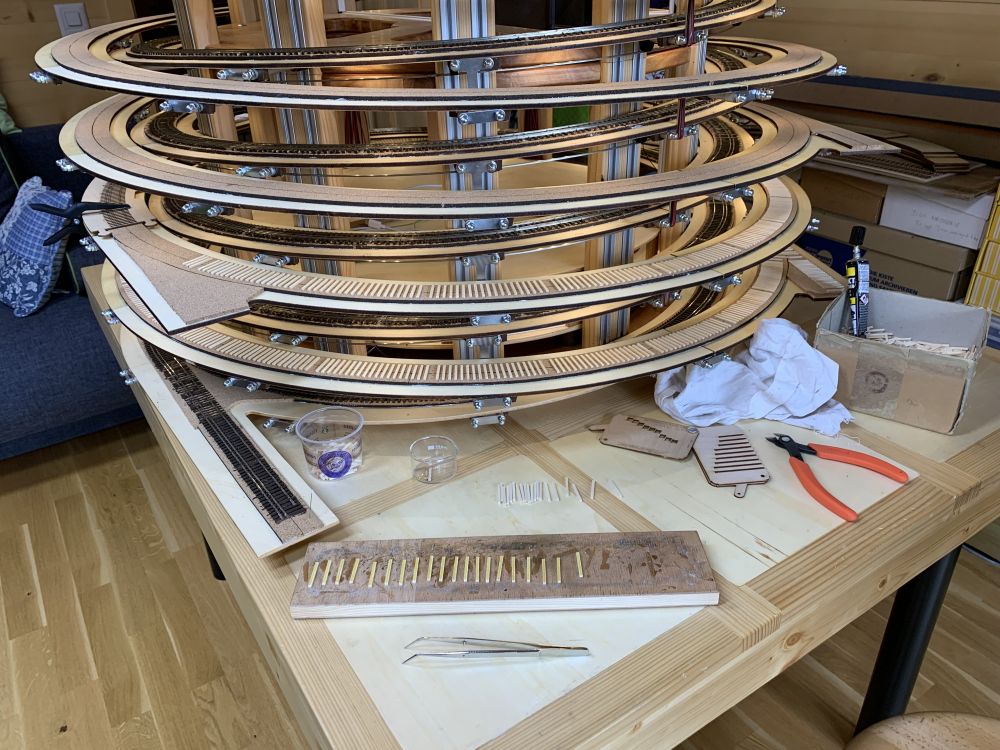 Le 20 mai, toutes les traverses simples sont collées, reste les deux zones d'aiguilles en attente des gabarits.