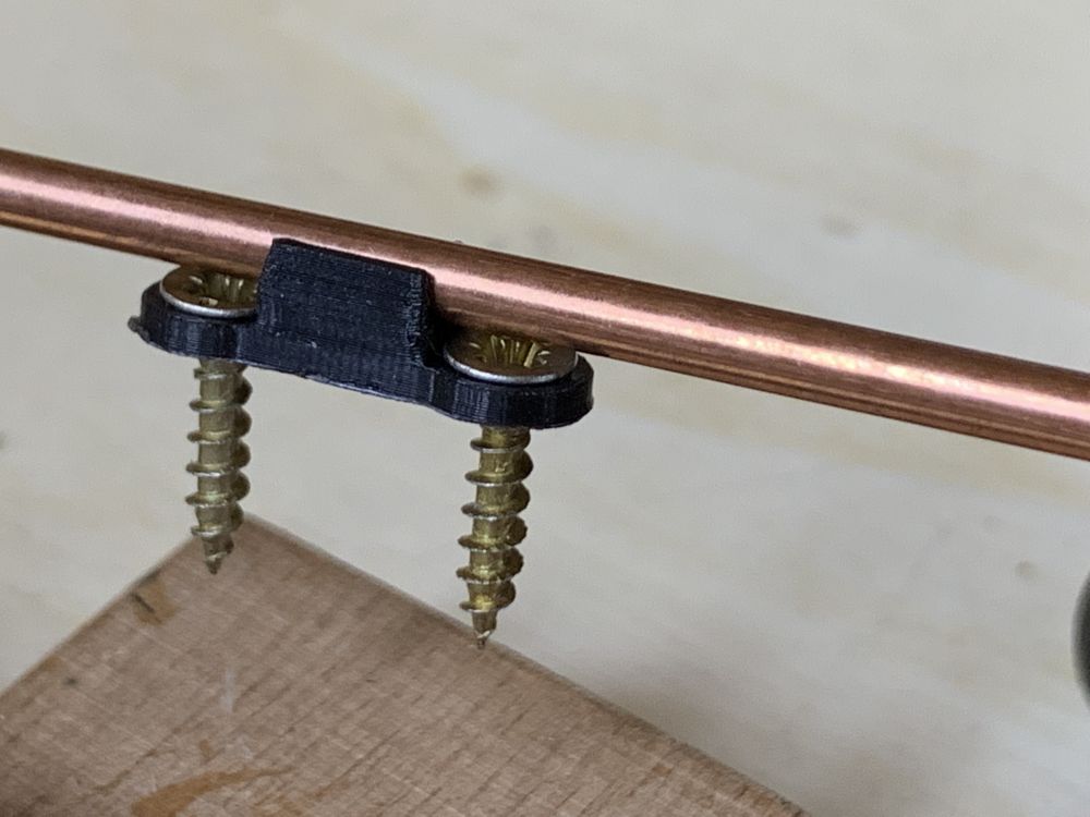 Une nouvelle phase de ce projet, l’alimentation électrique sur l’hélicoïde. J’utiliserai des barres de cuivre de 3mm de diamètre fixées verticalement sur lesquelles on raccordera chaque niveau de voies. Un dessin pour une impression en 3D d’une bride de fixation des barres, de 6.3 x 18 x 4.7 mm.