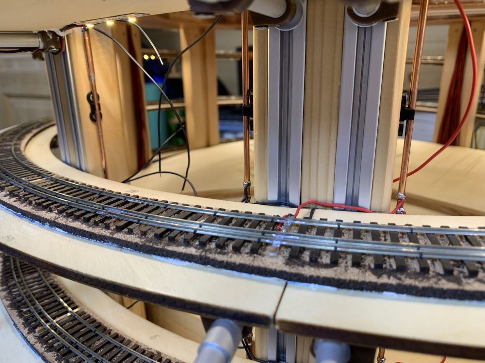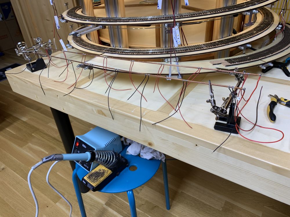 Mise en place des barres d'alimentation et câblage. Les deux barres de droite sont connectées aux rails et la 3ieme barre à gauche est l'alimentation du rail de caténaire.