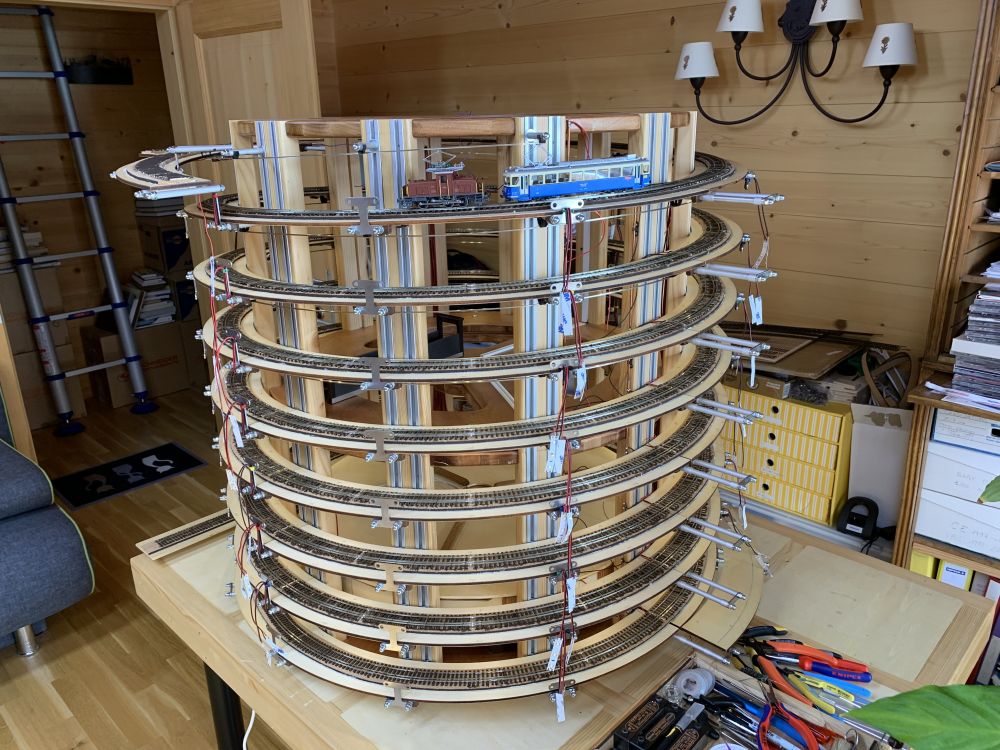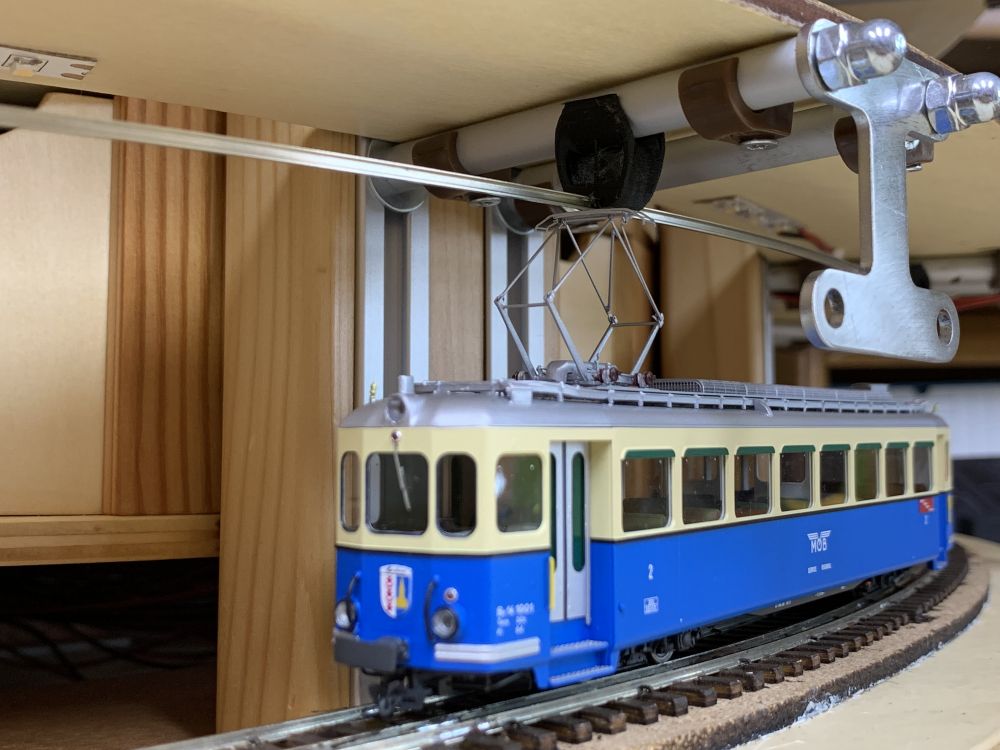 Le 25 janvier, les deux barres sont prêtes avec les fils d'alimentation des voies. Pourquoi des barres de cuivre ? ... esthétique, rigidité, facilité de pose, distribution propre et sans pertes. Reste à préparer la barre d'alimentation du rail de caténaire.