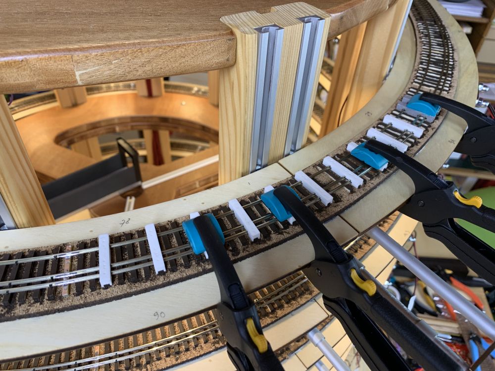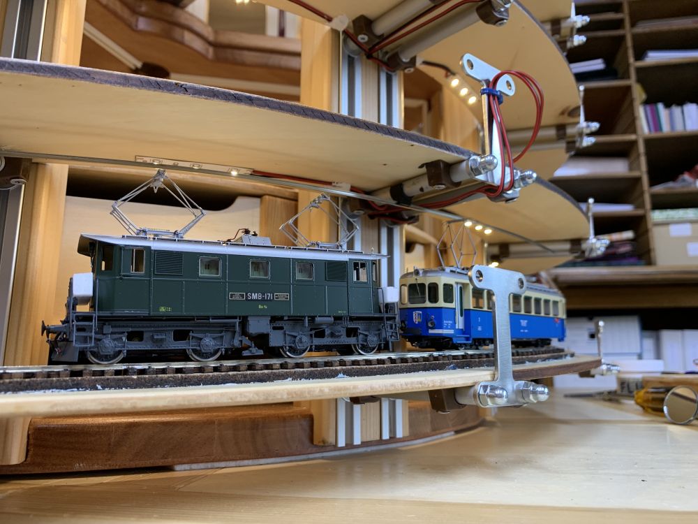 Un autre test pour la pose de la voie de caténaire avec une loco H0 et une H0m. Le premier test avait été fait près de l’aiguille et j’avais oublié que la hauteur était réduite d’environ 8 mm. Faut donc corriger le dessin des porte-rails de voie de caténaire et refaire les pièces !