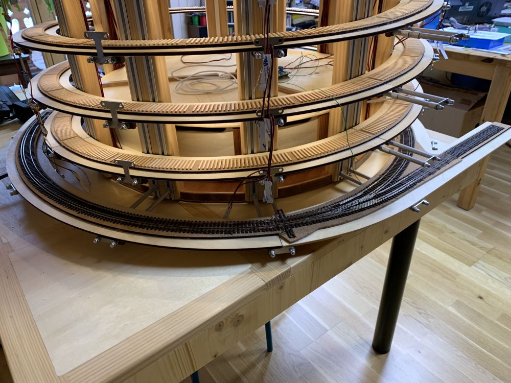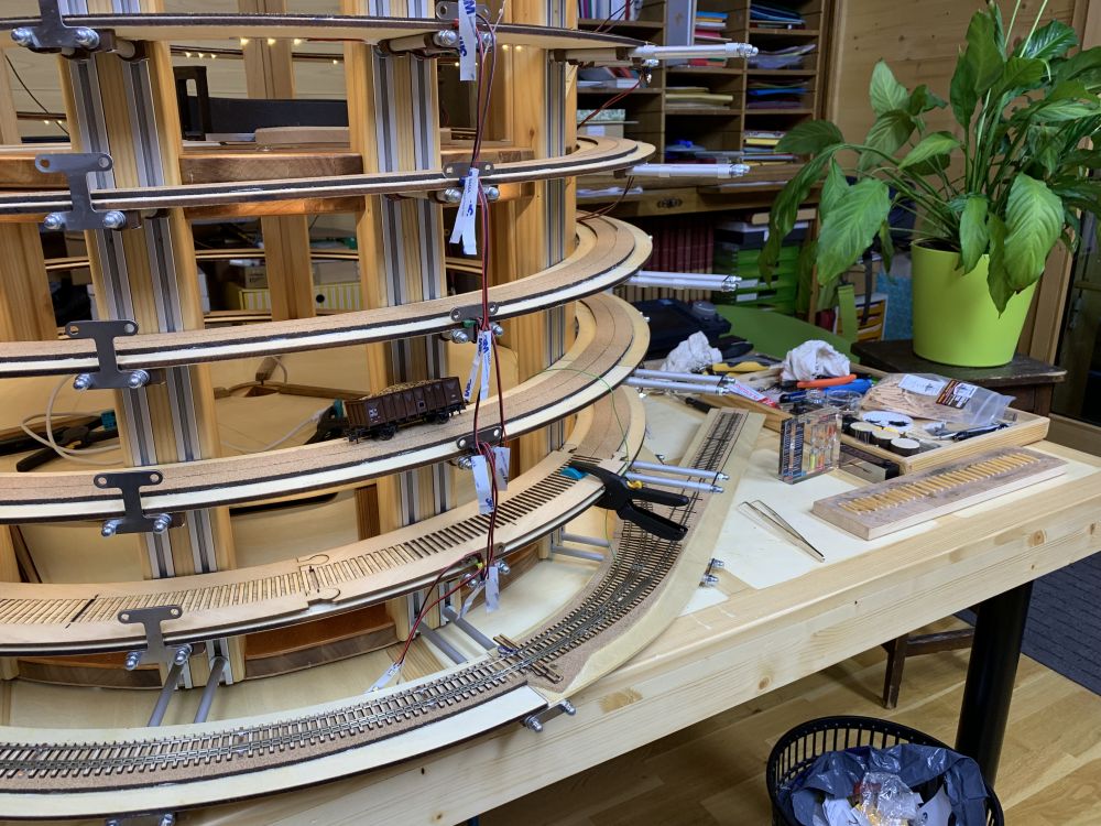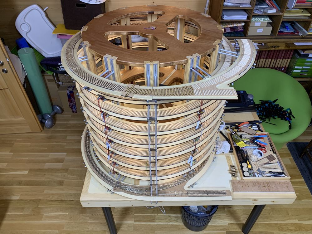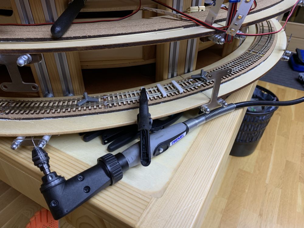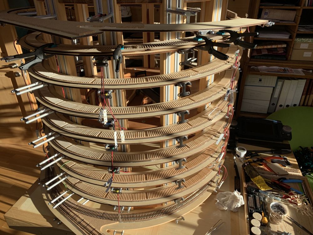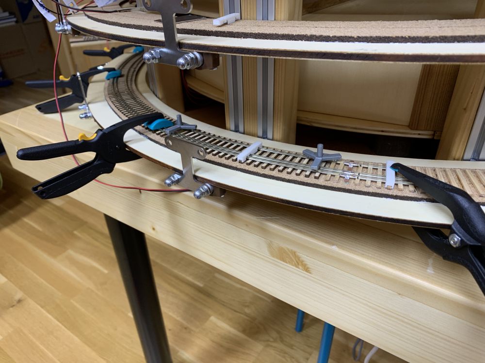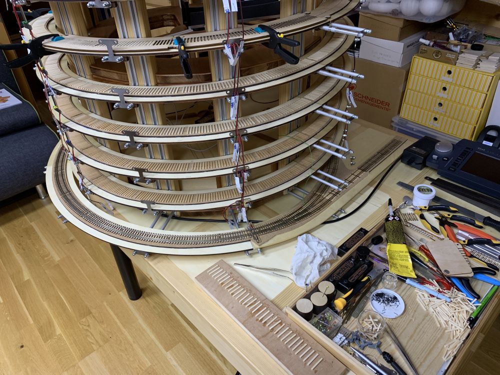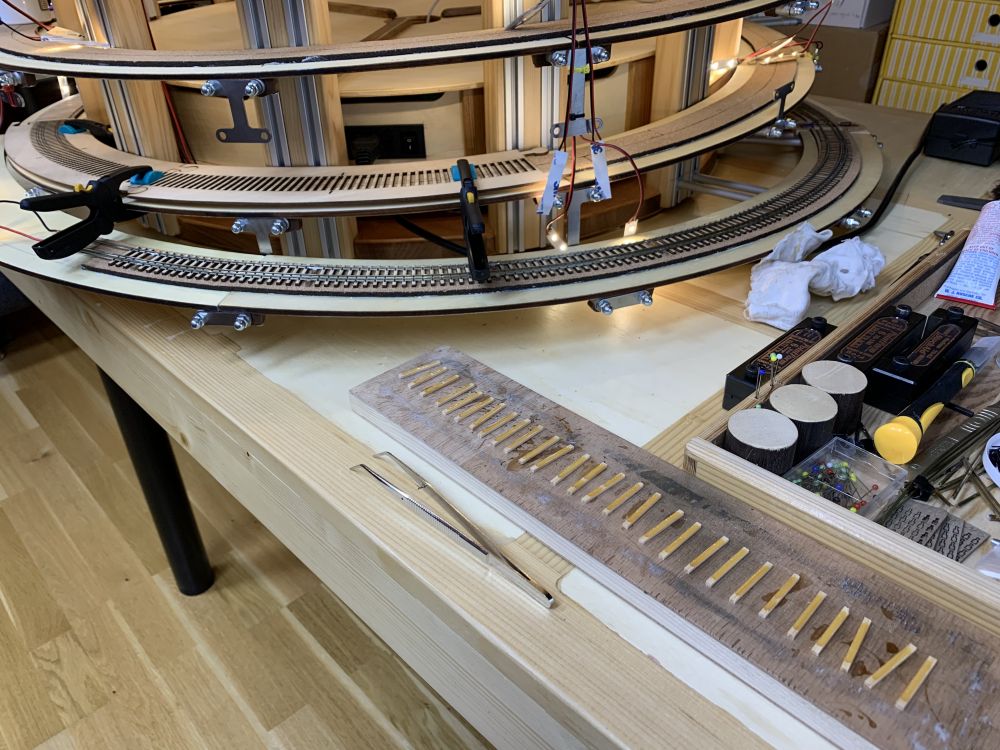 Aujourd’hui le 24 novembre, j’ai démarré la pose de rails sur la boucle intérieure de l’hélicoïde. Une méthode différente par contre. Je colle les traverses avec les gabarits en laissant un espace pour une traverse cuivrée toutes les 25 positions.